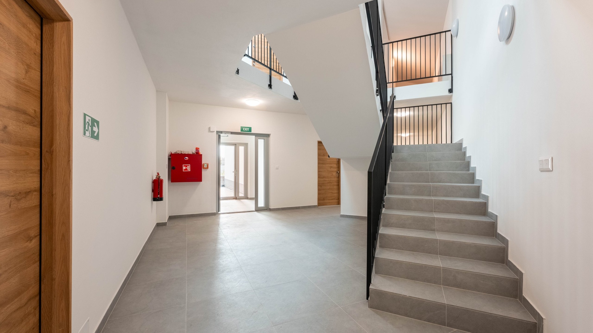 Moderní standardy vybavení – kvalitní podlahy, velkoformátové obklady a bezpečnostní dveře.