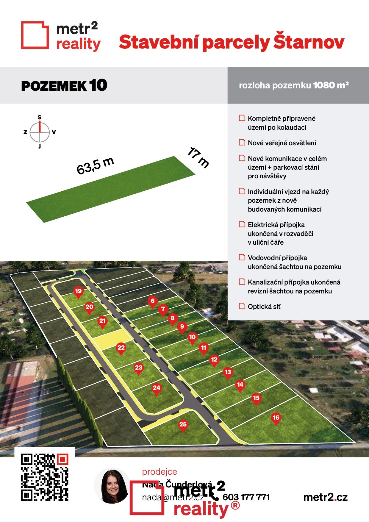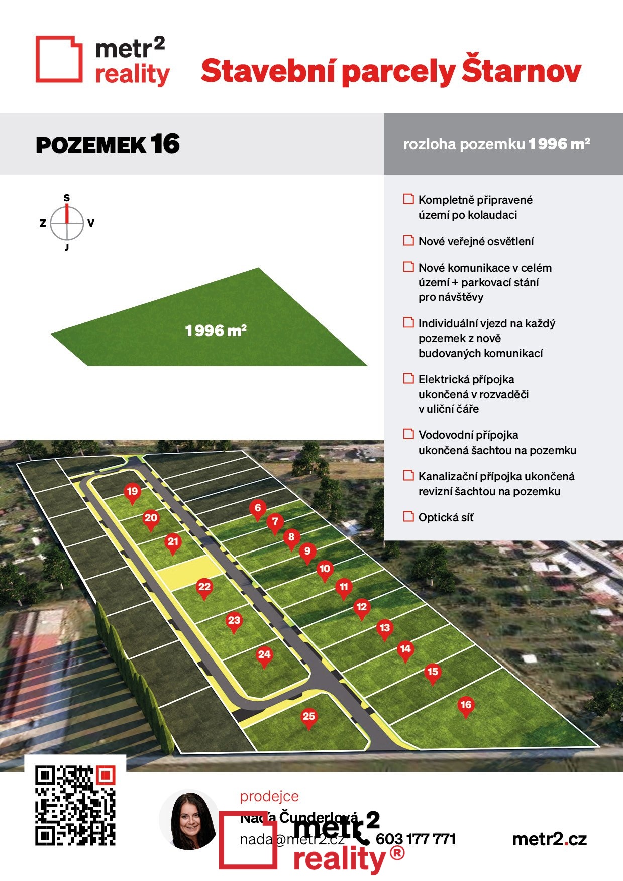 Ve výhradním zastoupení majitelů nabízíme k prodeji stavební pozemky v nově vznikající lokalitě v obci Štarnov. Pozemky jsou vhodné na výstavbu samostatně stojícího rodinného domu o maximálně dvou podlažích. Pozemky budou kompletně zasíťovány - elektřina, vodovod a kanalizace, optika, dále bude k pozemku zbudována nová příjezdová komunikace včetně veškeré infrastruktury. Kompletní zasíťování bude hotové do konce srpna 2025. V případě zájmu Vám rádi poskytneme bližší informace.