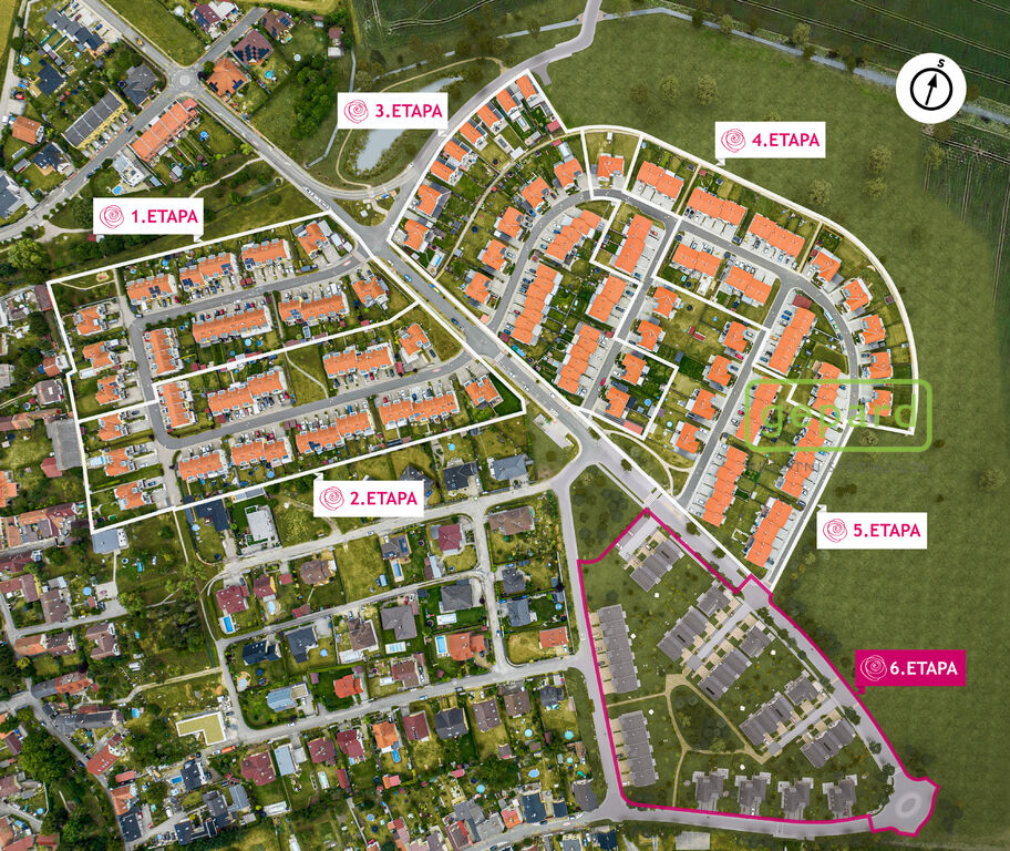 6. etapa zahrnuje celkem 40 rodinných domů, z toho 32 v mimořádně úsporné energetické třídě A s vytápěním tepelným čerpadlem, centrální rekuperací, podlahovým topením a přípravou na fotovoltaiku a 8 domů v úsporné energetické třídě B s centrální rekuperací a vytápěním plynovým kotlem. Všechny domy bez rozdílu jsou osazené okenními výplněmi s trojskly.