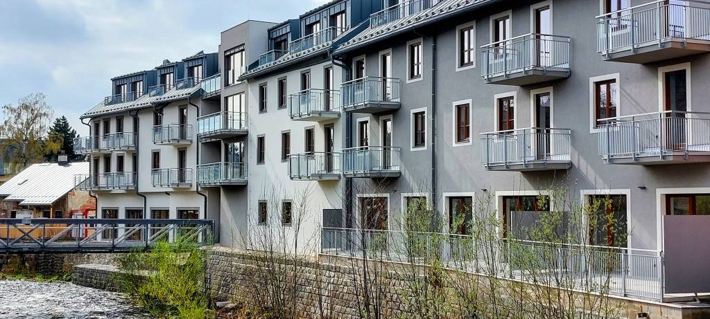 Na břehu Labe a jen kousek od náměstí - dva bytové domy propojené soukromou lávkou, 56 apartmánů, parkovací a garážová stání, lyžárna, kolárna