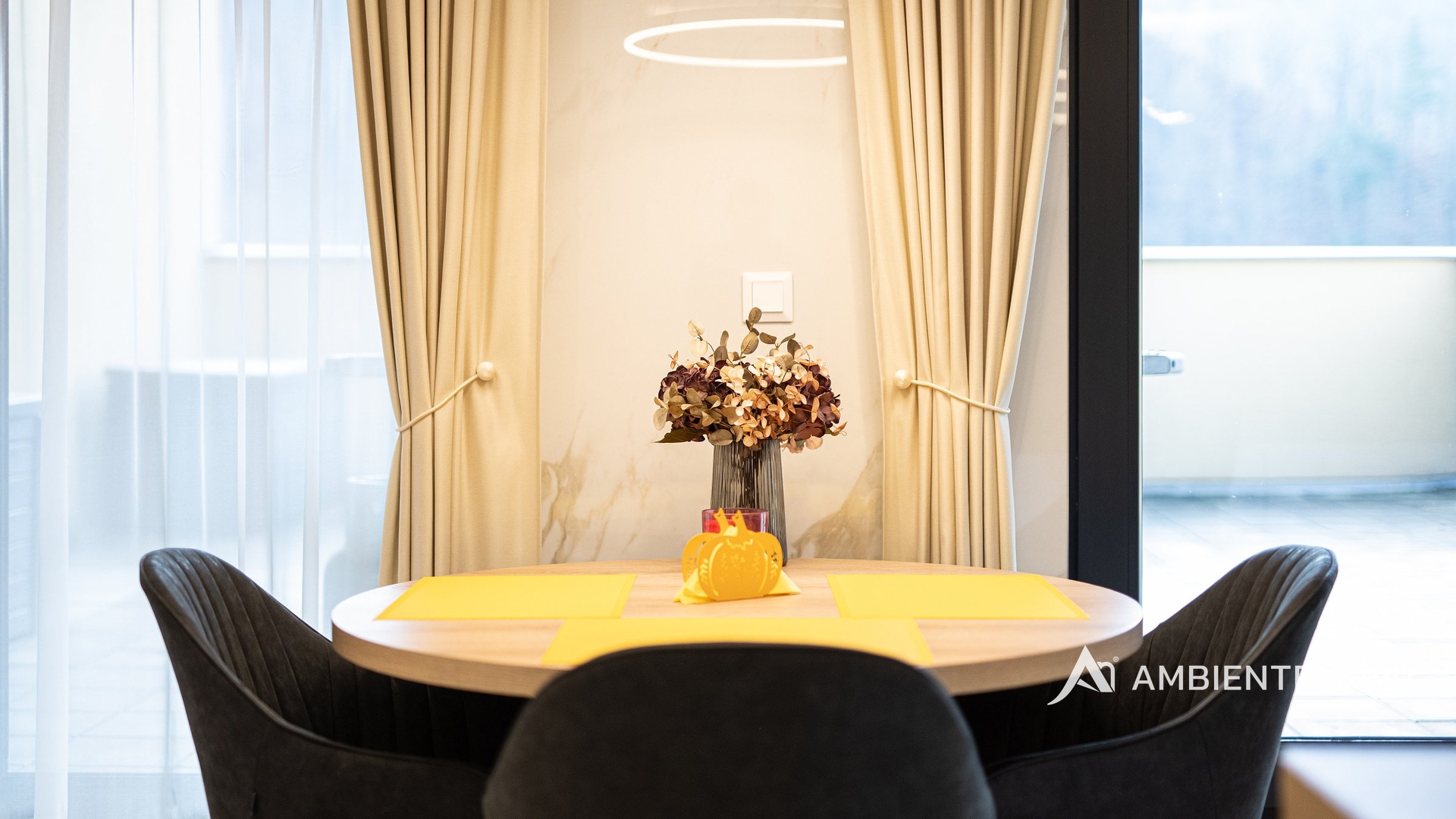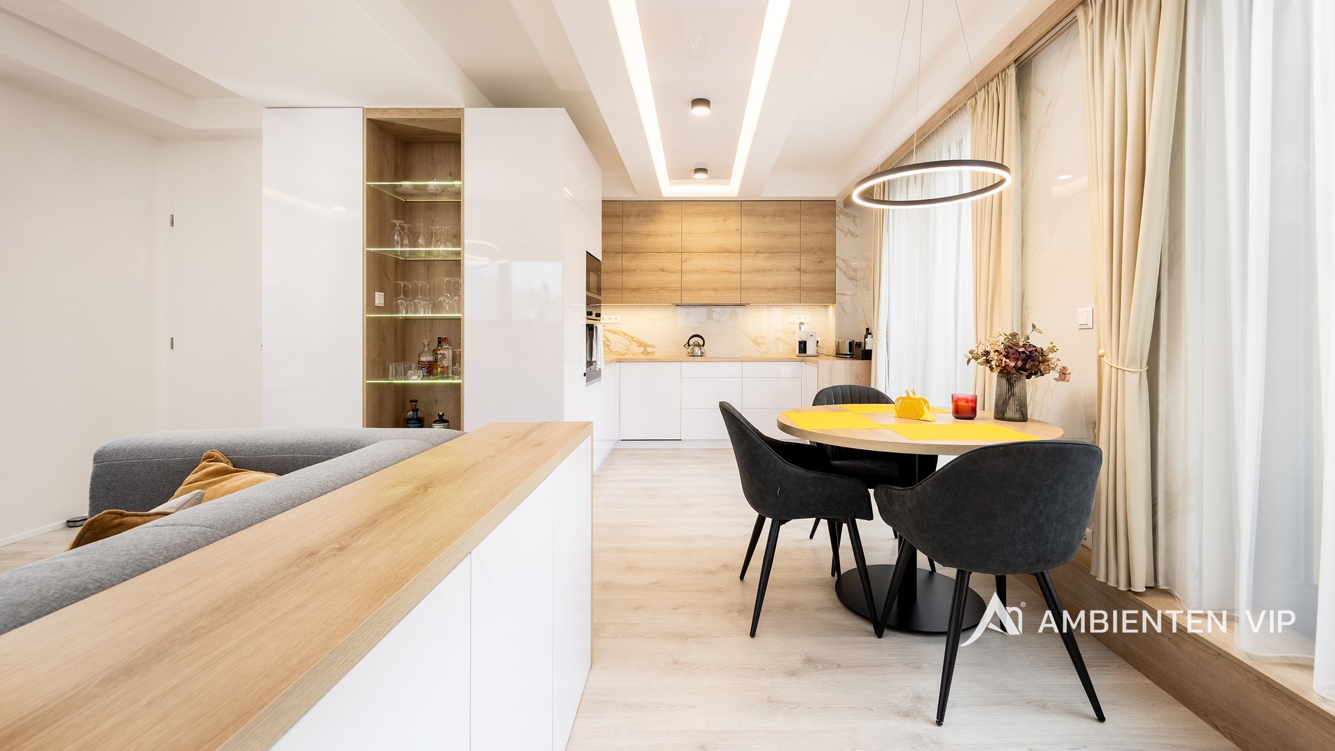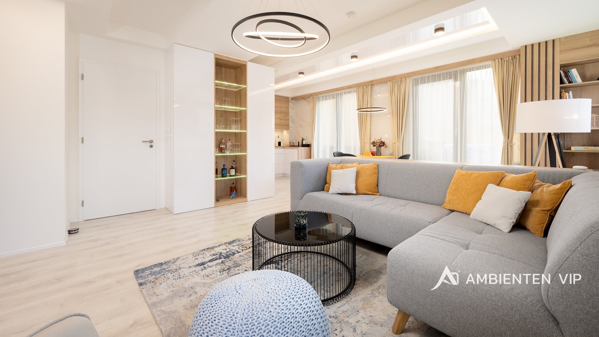 Interiér byl luxusně navržen studiem GALA Design s maximálním důrazem na komfort, funkčnost a nadčasovou estetiku. Dominantou bytu je obytný prostor o velikosti 35 m² s plně vybaveným kuchyňským koutem a spotřebiči Electrolux vyšší řady. Samozřejmostí je ambientní osvětlení, které v kombinaci s jihozápadní orientací zajišťuje dostatek přirozeného světla po celý den. Na západně orientovaných oknech jsou instalovány předokenní žaluzie. V bytě se nachází dvě klimatizační jednotky.