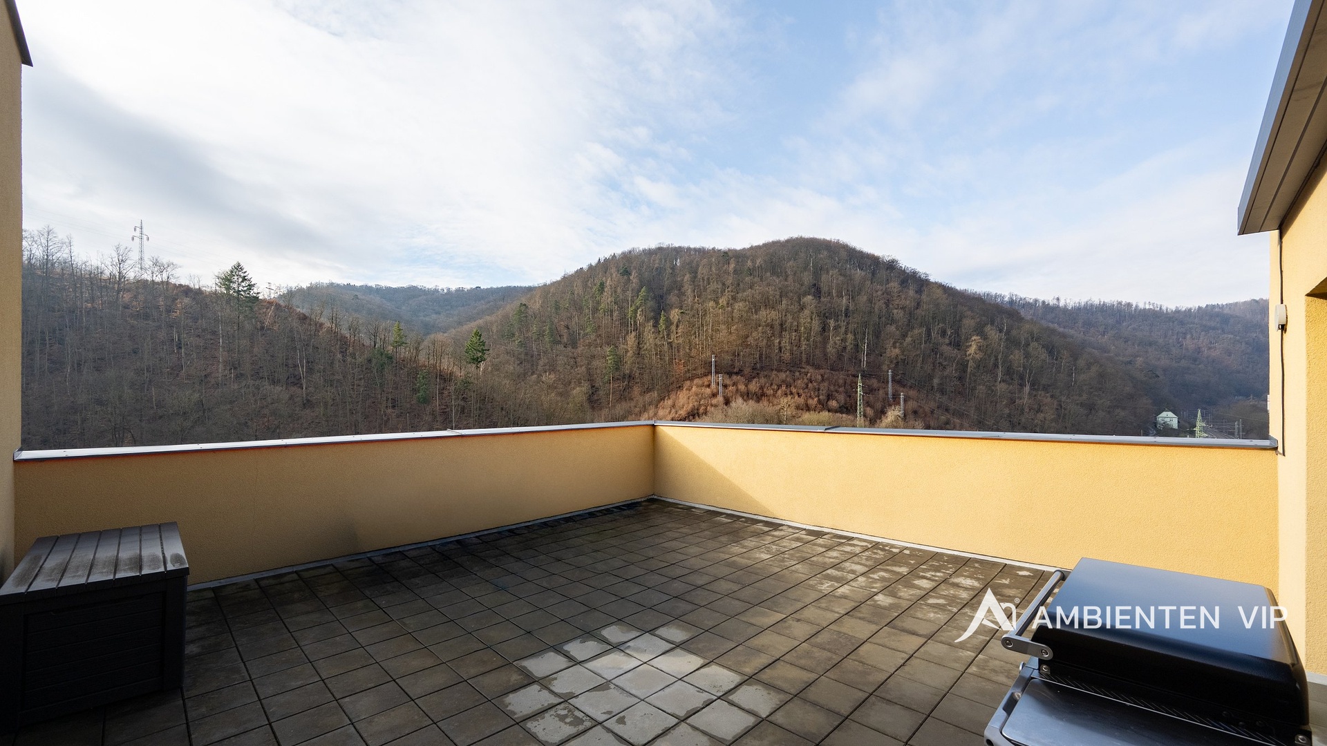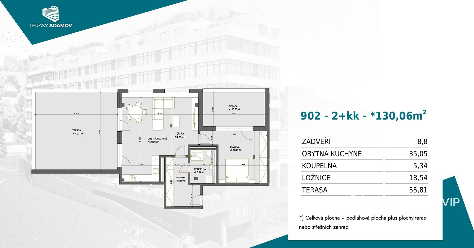 AMBIENTEN VIP vám nabízí exkluzivně ke koupi výjimečný byt o dispozici 2+kk podlahové ploše 74 m², umístěný v 9. nadzemním podlaží moderního bytového domu Terasy Adamov z roku 2021. Realizace interiérů bytu proběhla v roce 2024. K bytu náleží dvě prostorné terasy – západně orientovaná terasa o velikosti 13,58 m² a hlavní jihozápadní terasa o rozloze 42,23 m², vybavená markýzou, přívodem elektřiny a vody, ideální pro posezení s rodinou či přáteli s výhledem do okolních lesů. K bytu náleží parkovací stání přímo před domem.