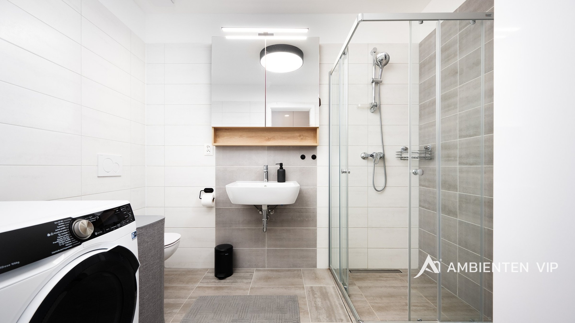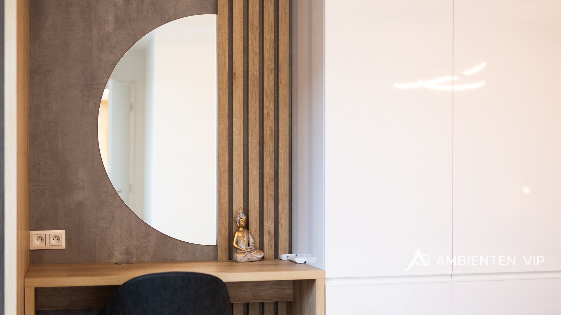 Ložnice nabízí nejen klid a soukromí, ale také dostatek úložných prostor v podobě designových vestavěných skříní. Dámy jistě ocení stylový toaletní stolek se zrcadlem, který je elegantní i praktickou součástí interiéru. Další úložné prostory jsou chytře řešeny také v předsíni a koupelně, takže byt působí vzdušně a organizovaně.