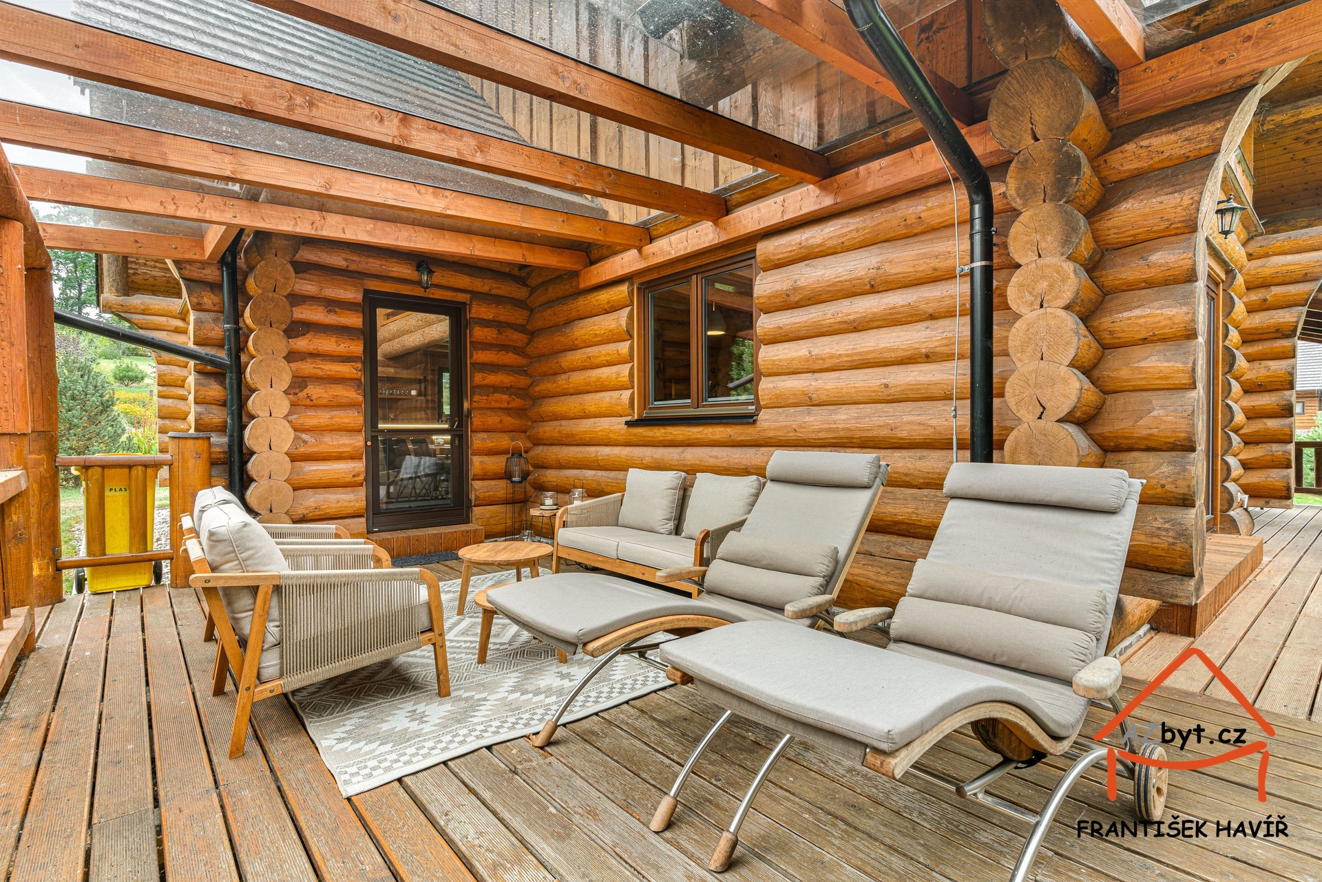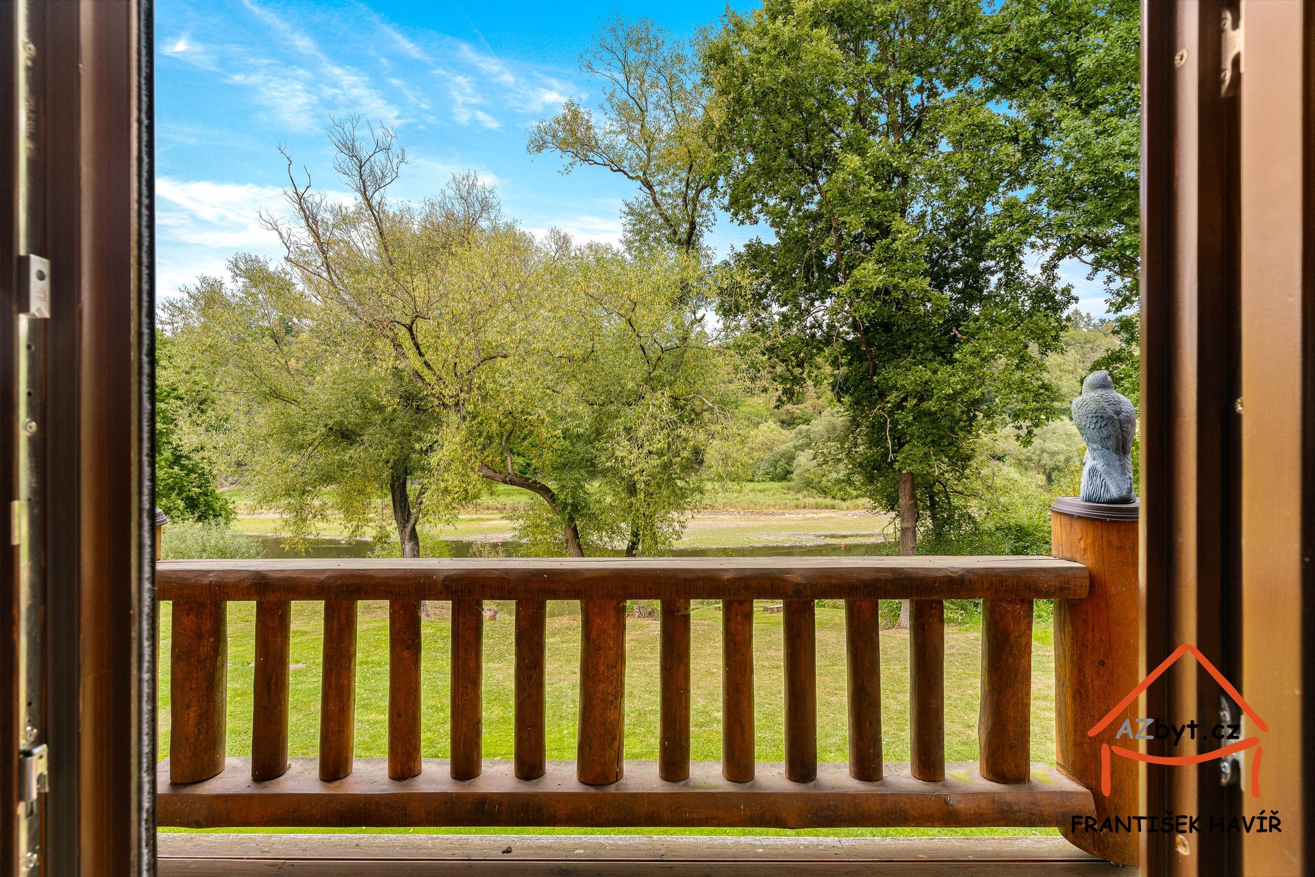 • Rozšířená a zastřešená terasa z evropského modřínu, balkon s výhledem na řeku.