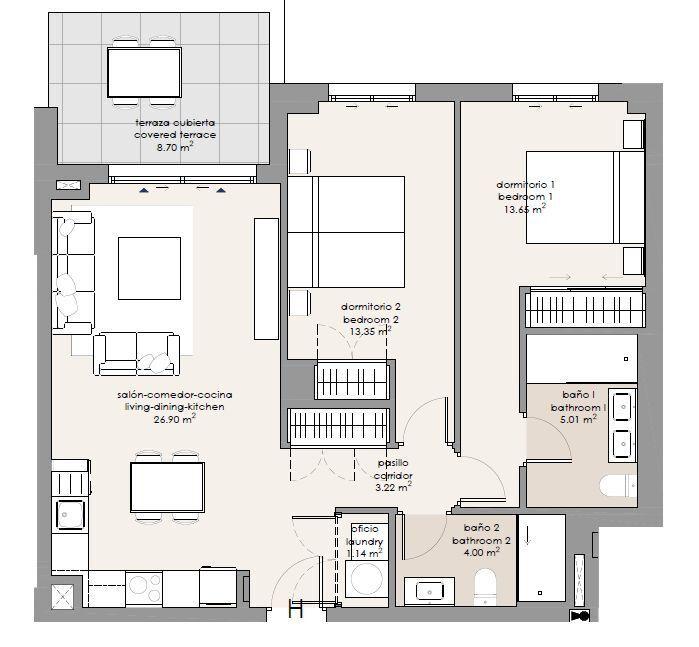 Projekt nabízí moderní apartmány o dispozicích 3+kk a 4+kk ve třetí linii od moře. Každá jednotka je navržena s důrazem na funkčnost, komfort a maximální využití přirozeného světla typického pro oblast Costa del Sol.