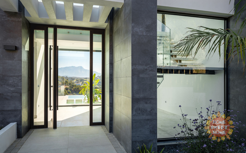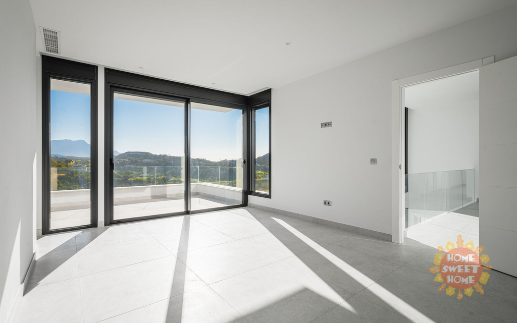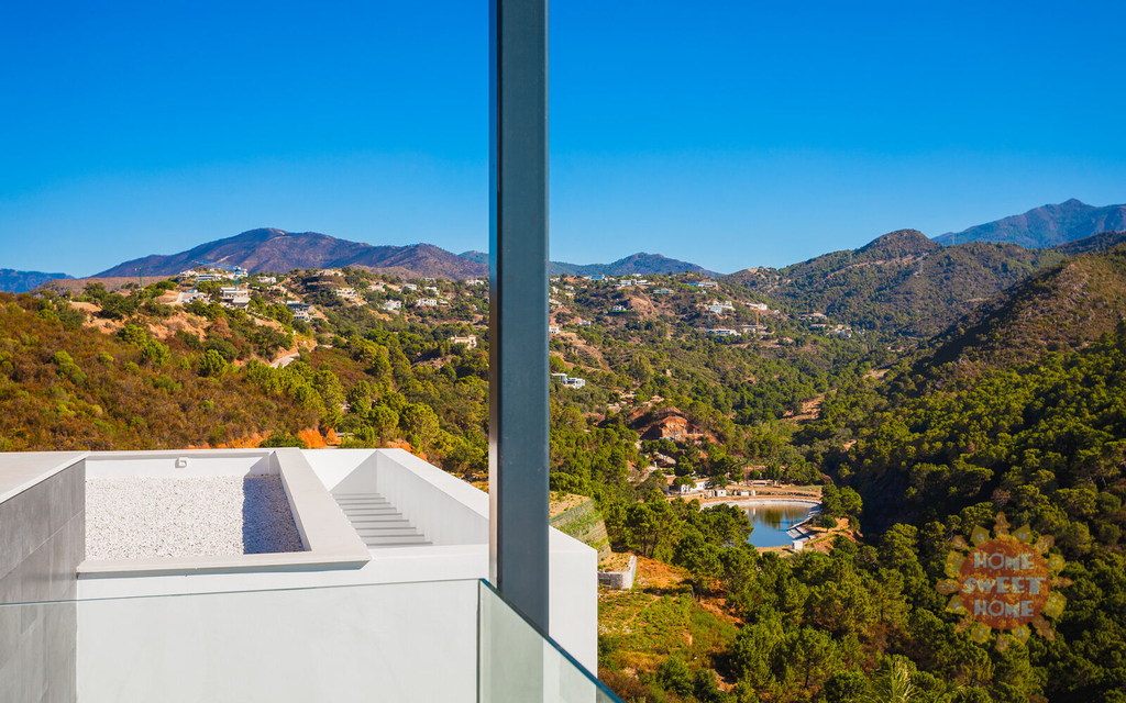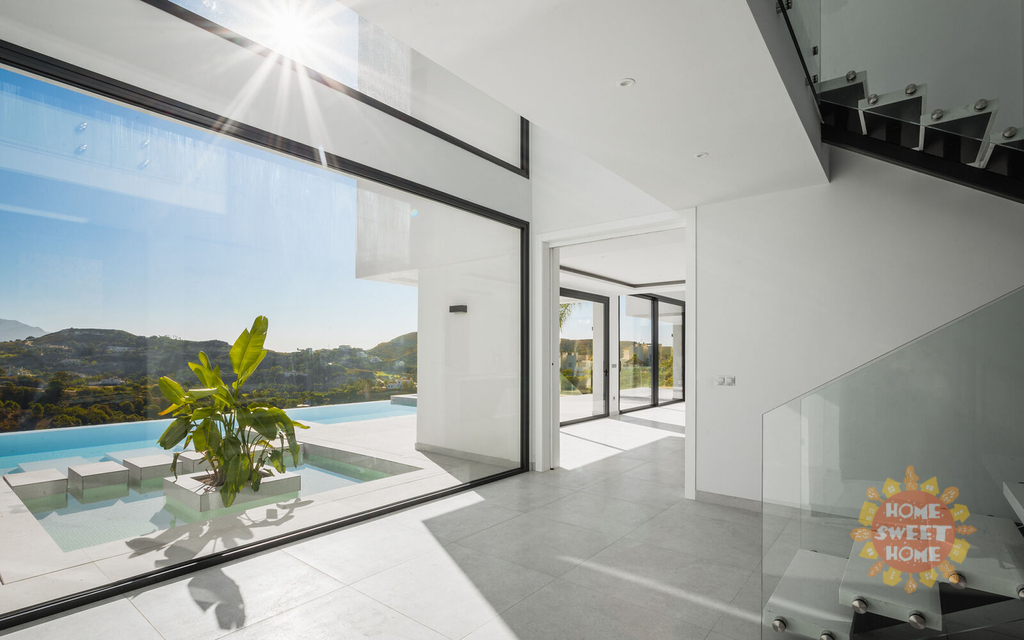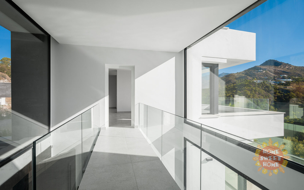 Při vstupu do vily vás přivítá chodba s dvojitou výškou s výhledem na vodní vrstvu, která vytváří velkolepý a elegantní vstup. Panoramatický výhled z chodby ukazuje úchvatné golfové hřiště Marbella, majestátní horu La Concha a historický hrad Monte Mayor. Otevřený půdorys vily umožňuje plynulý tok mezi obytnými prostory a vytváří pocit jednoty a prostornosti. Jedním z výrazných prvků této vily je nádherné dřevěné schodiště ze skla, které jí dodává nádech sofistikovanosti a elegance. Když vystoupáte po schodišti, najdete solárium o rozloze 110 m2 s 360° výhledem na hory, údolí a golfové hřiště. Tato střešní oáza je ideálním místem k odpočinku a vychutnávání si krásy okolí.