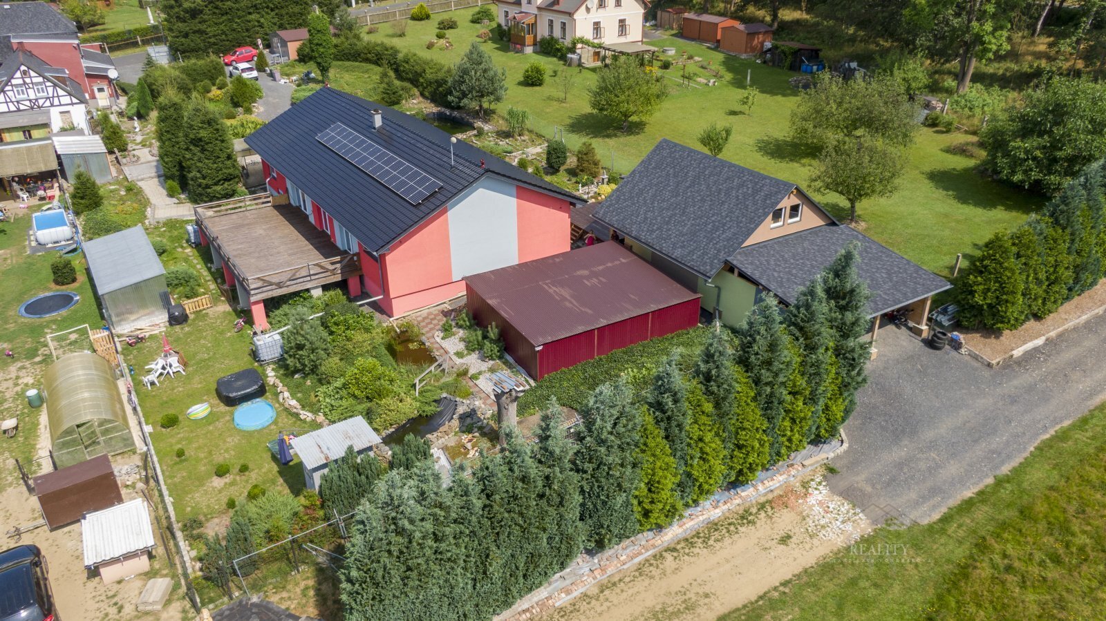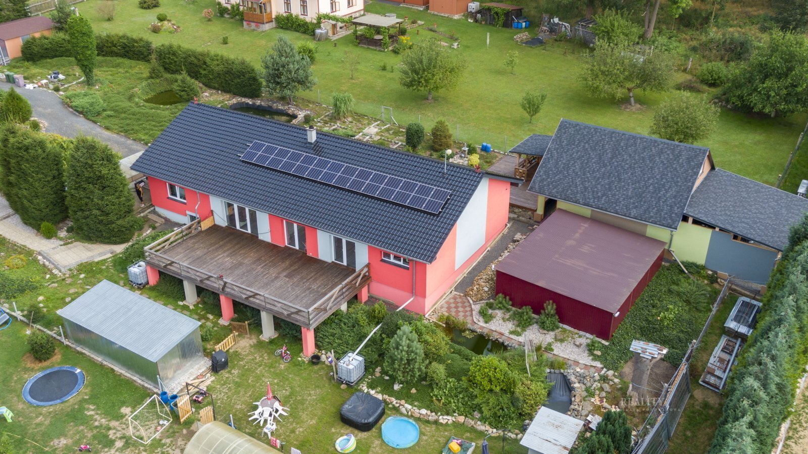 Na pozemku se nachází udržovaná zahrada s jezírky, která vytváří příjemné a klidné prostředí pro relaxaci.