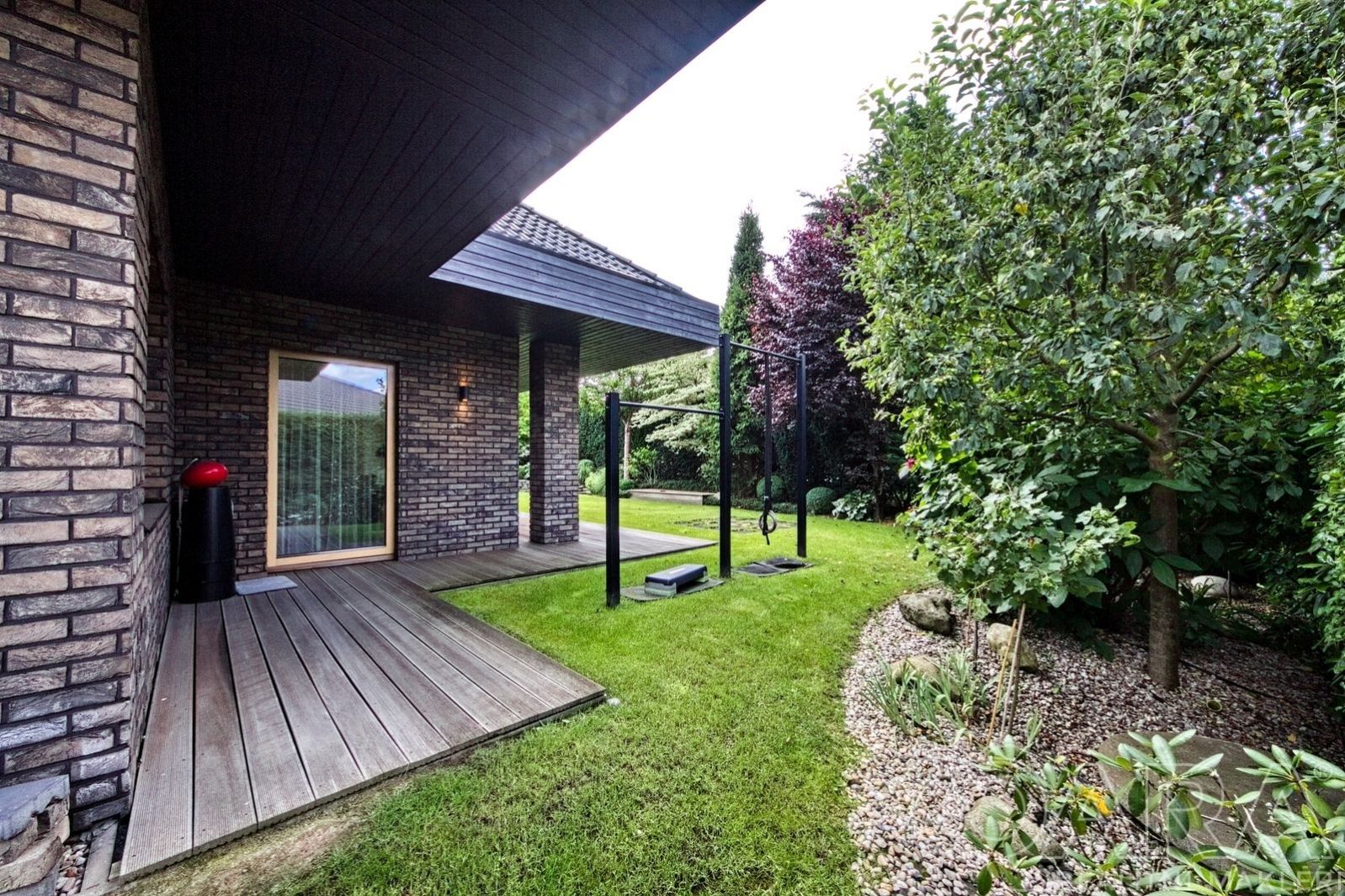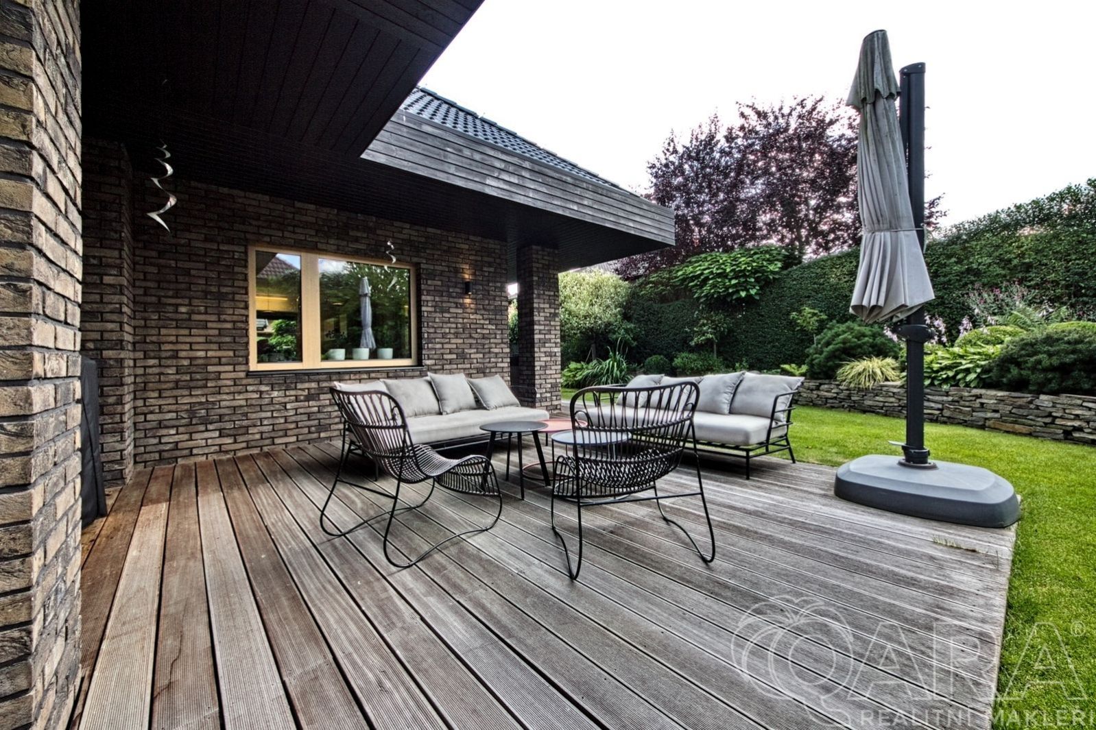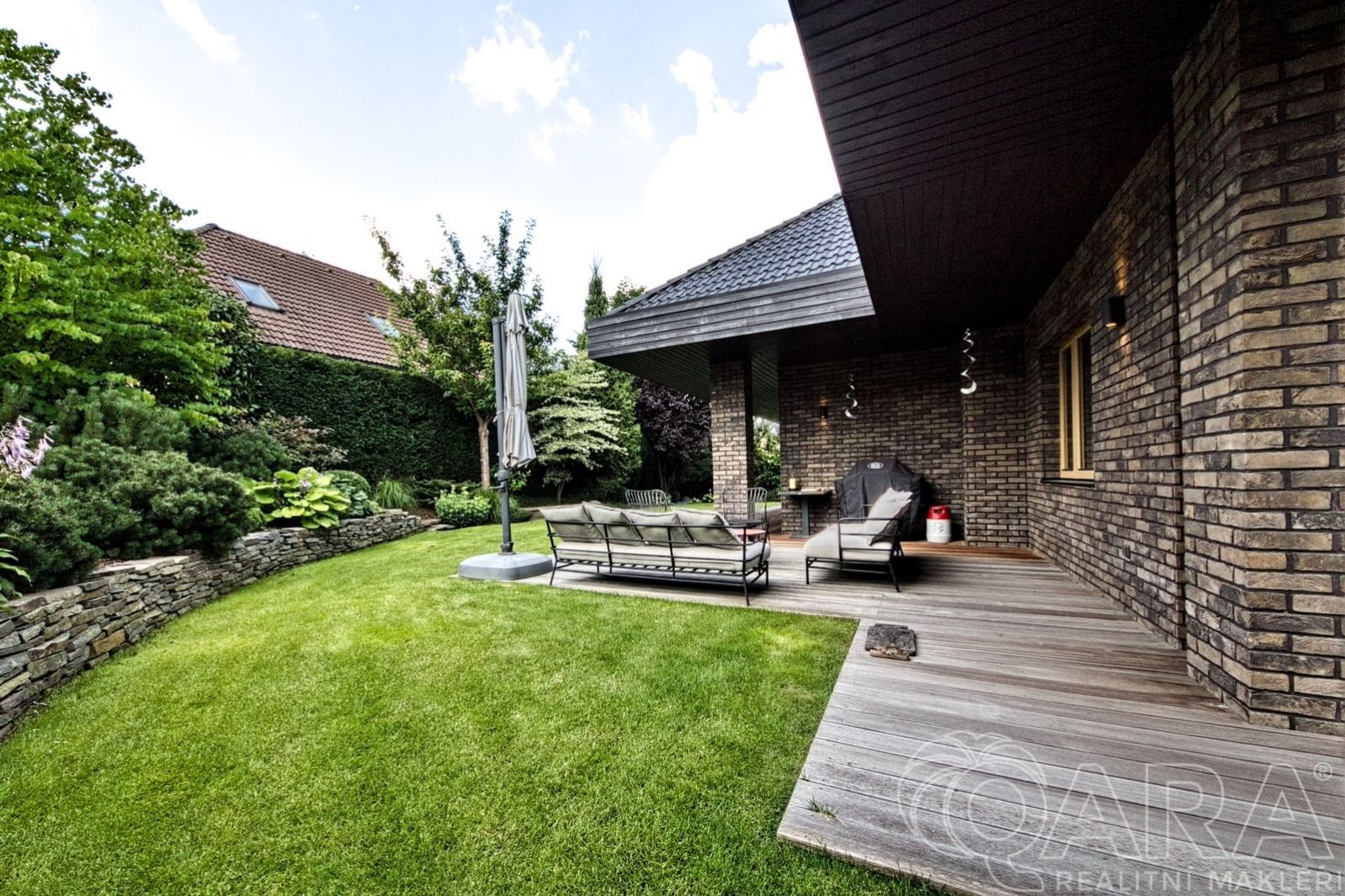 Přesahy střechy přirozeně stíní interiér i exteriér domu a poskytují krytá, intimní místa pro relaxaci, posezení s přáteli nebo grilování. Součástí je krásně upravená, profesionálně založená a již vzrostlá zahrada, která nabízí dostatek prostoru pro odpočinek, hry dětí i rodinná setkání, a zároveň nevyžaduje náročnou údržbu. Co na tomto domě určitě oceníte je velká míra soukromí.