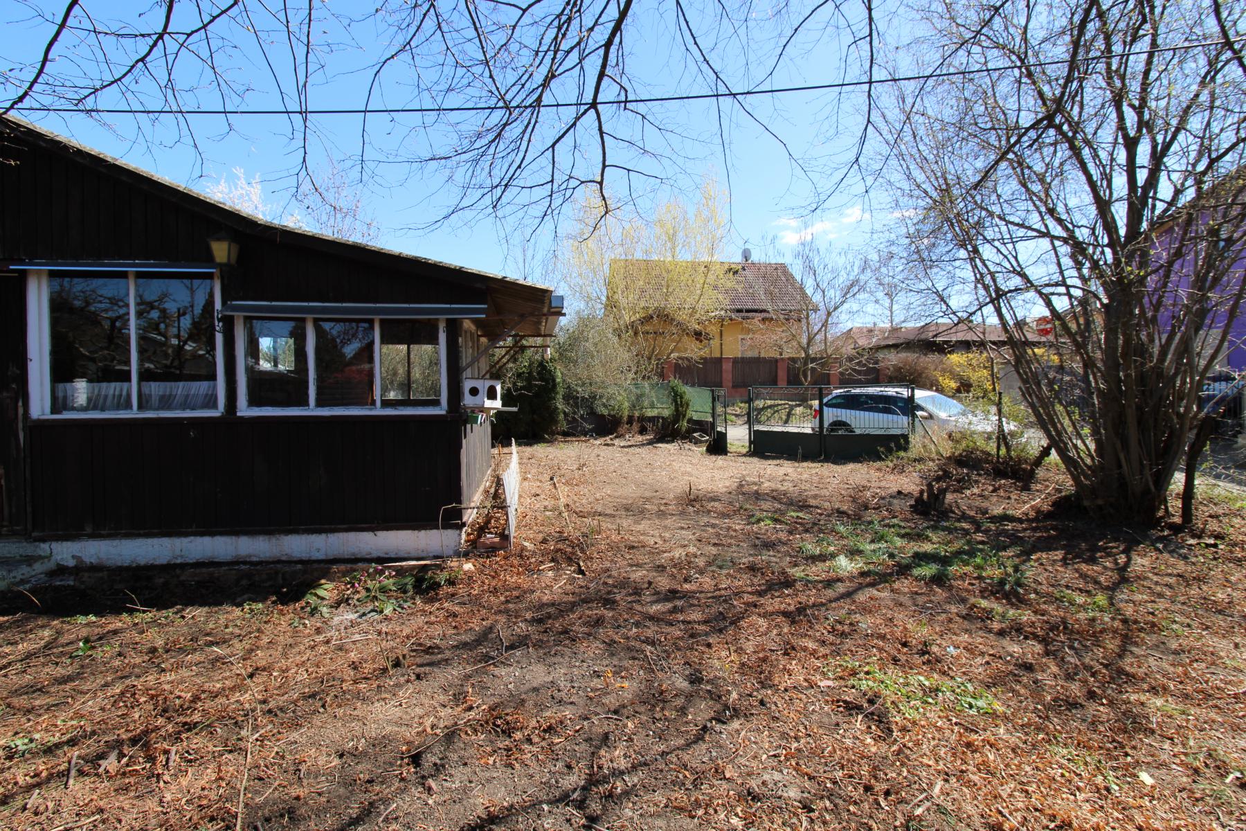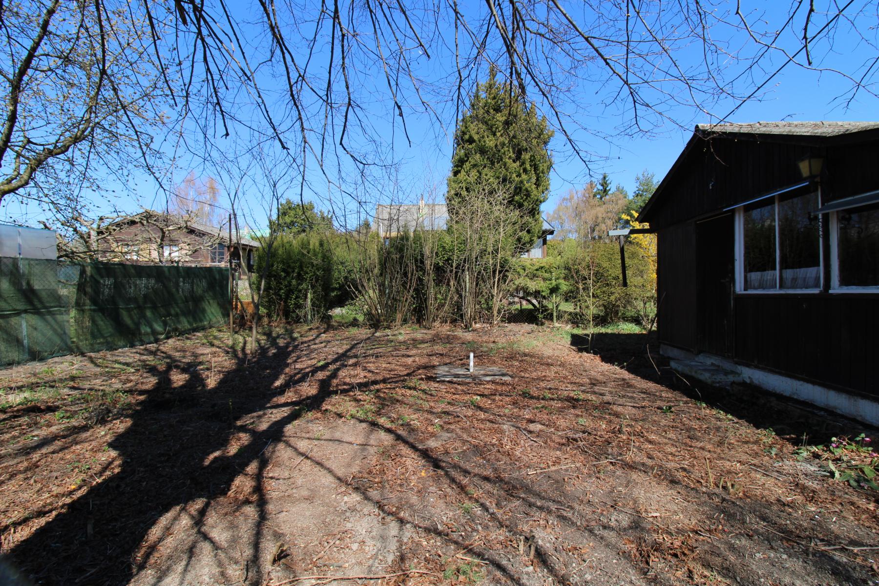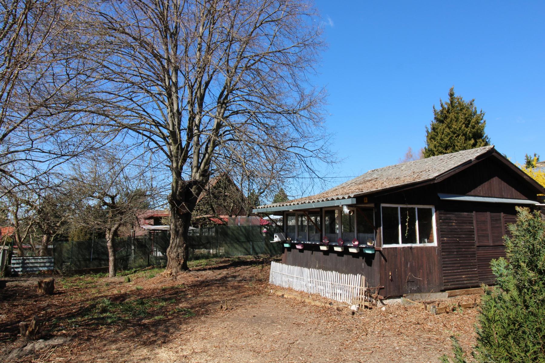 Pozemek je oplocený, se dvěma vzrostlými stromy, a stojí na něm dřevěná chatka se zastavěnou plochou 21 m2 určená k rekonstrukci nebo k demolici. Chatka i pozemek jsou kompletně vyklizené.