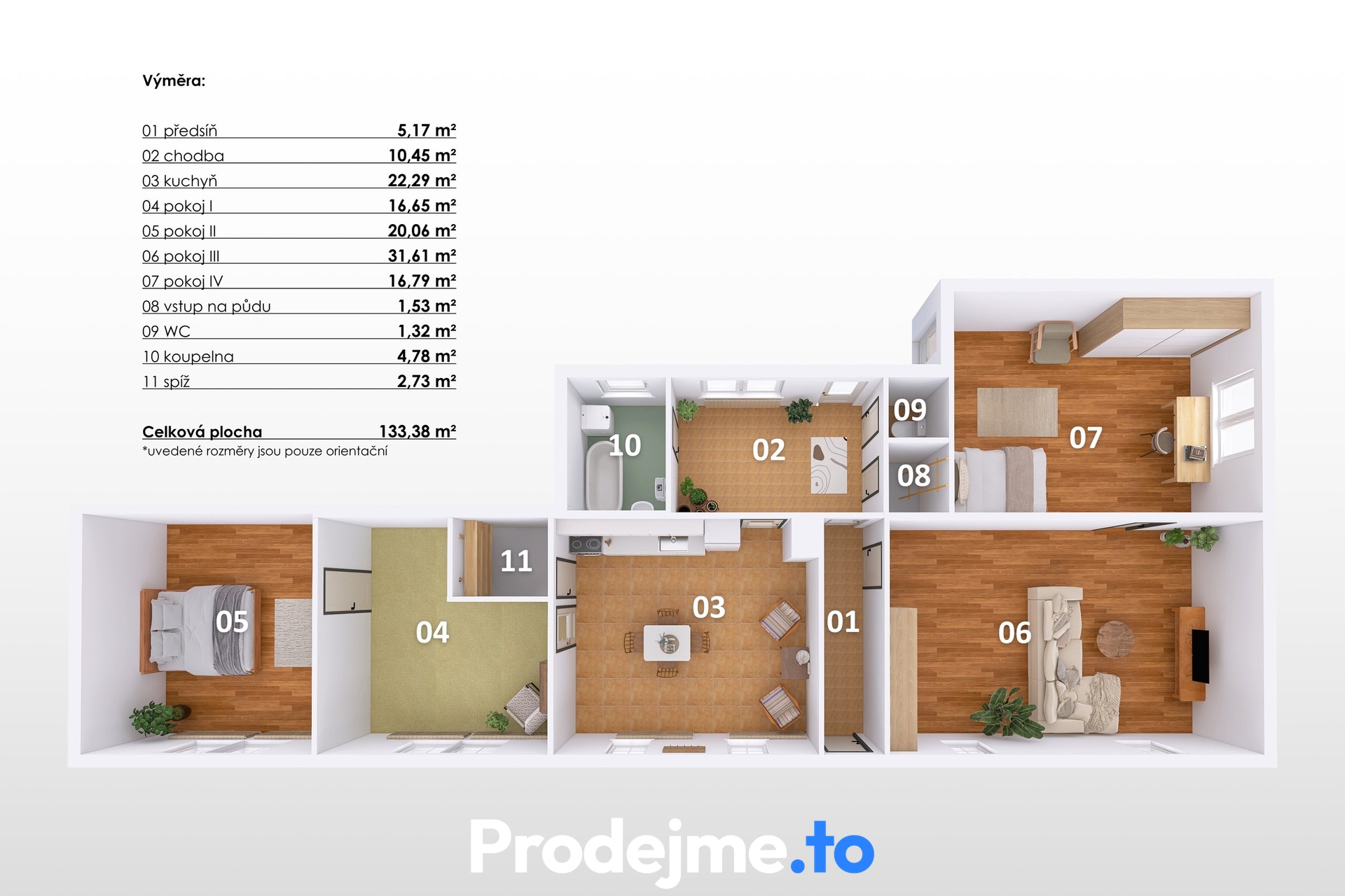 Dům nabízí variabilní dispozici 4+1 o užitné ploše 133 m² a zároveň jednoduchou možnost rozdělení na dvě samostatné části. Ze vstupní chodby se vpravo dostanete do velkorysého pokoje (31,6 m²), který se přímo nabízí k rozdělení na dvě místnosti, a do dalšího pokoje (16,8 m²) s přímým vstupem na zahradu.