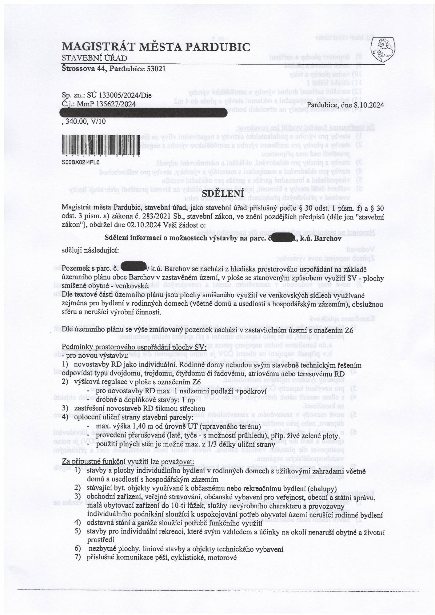 Určení: Pozemky jsou určeny k výstavbě rodinných domů v zóně plochy smíšené obytné venkovské SV