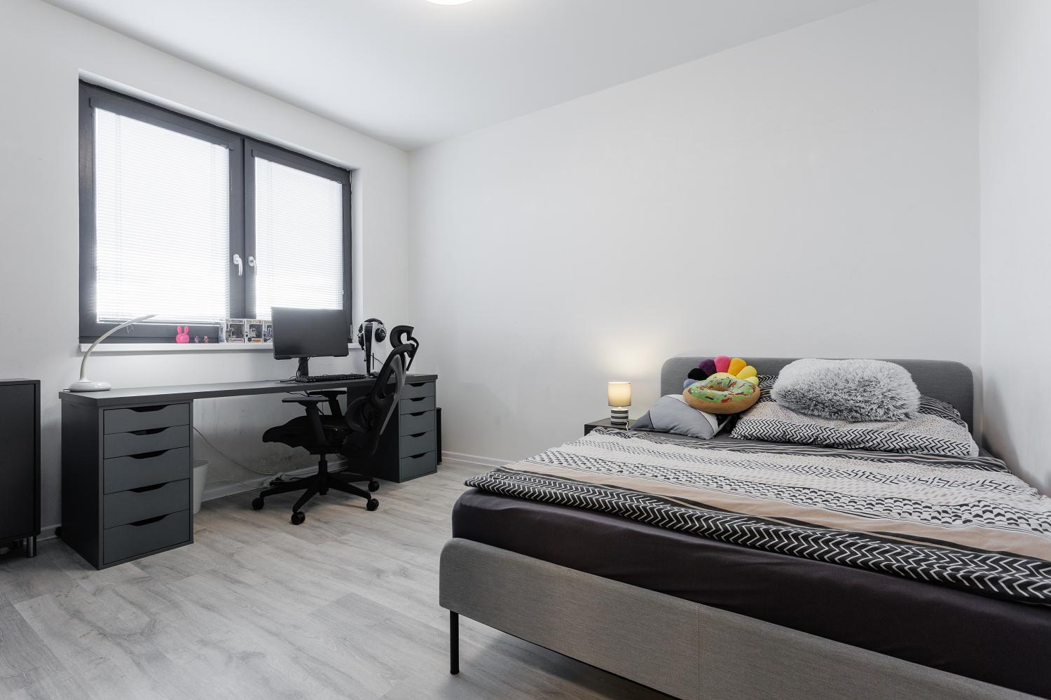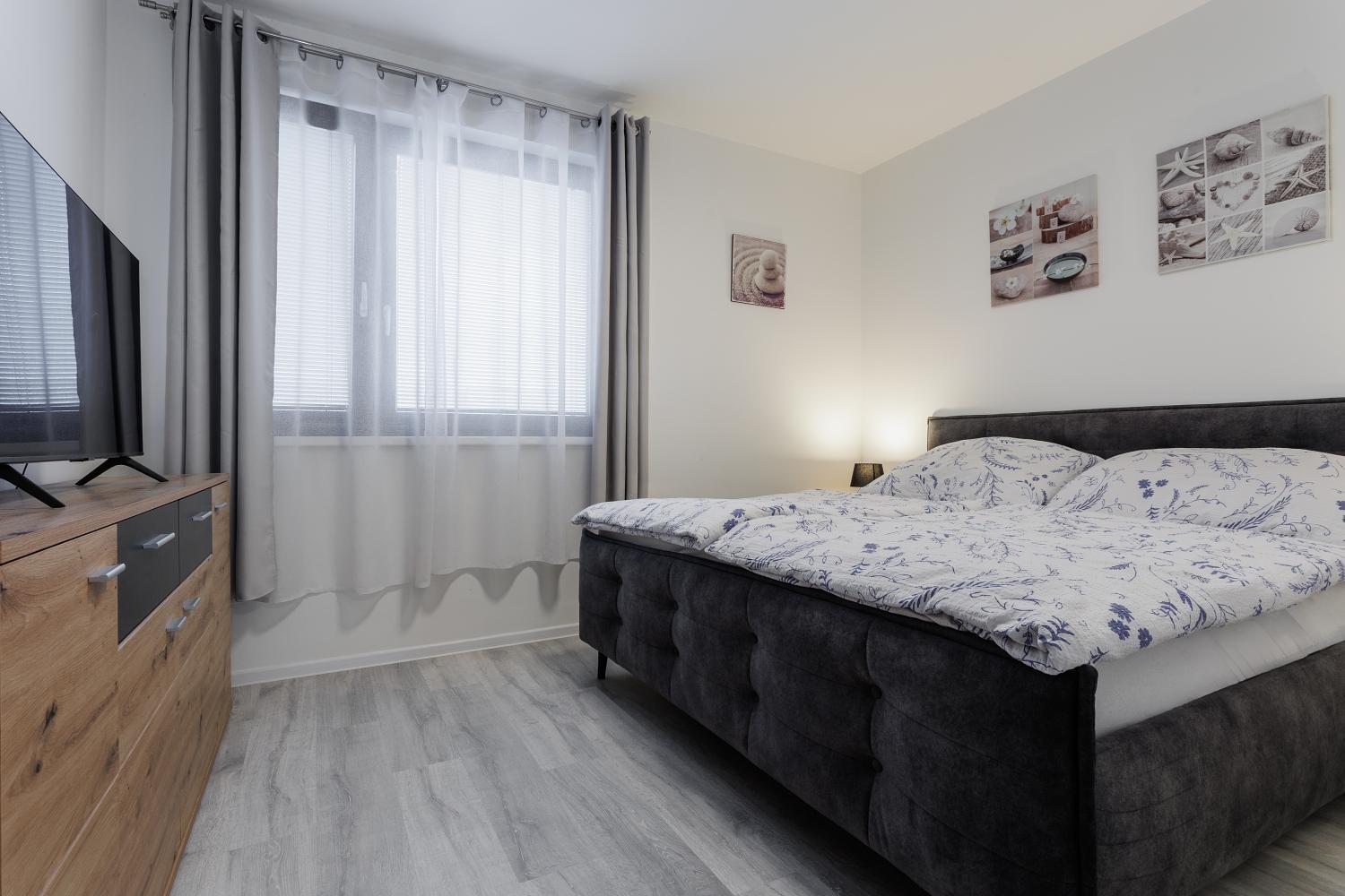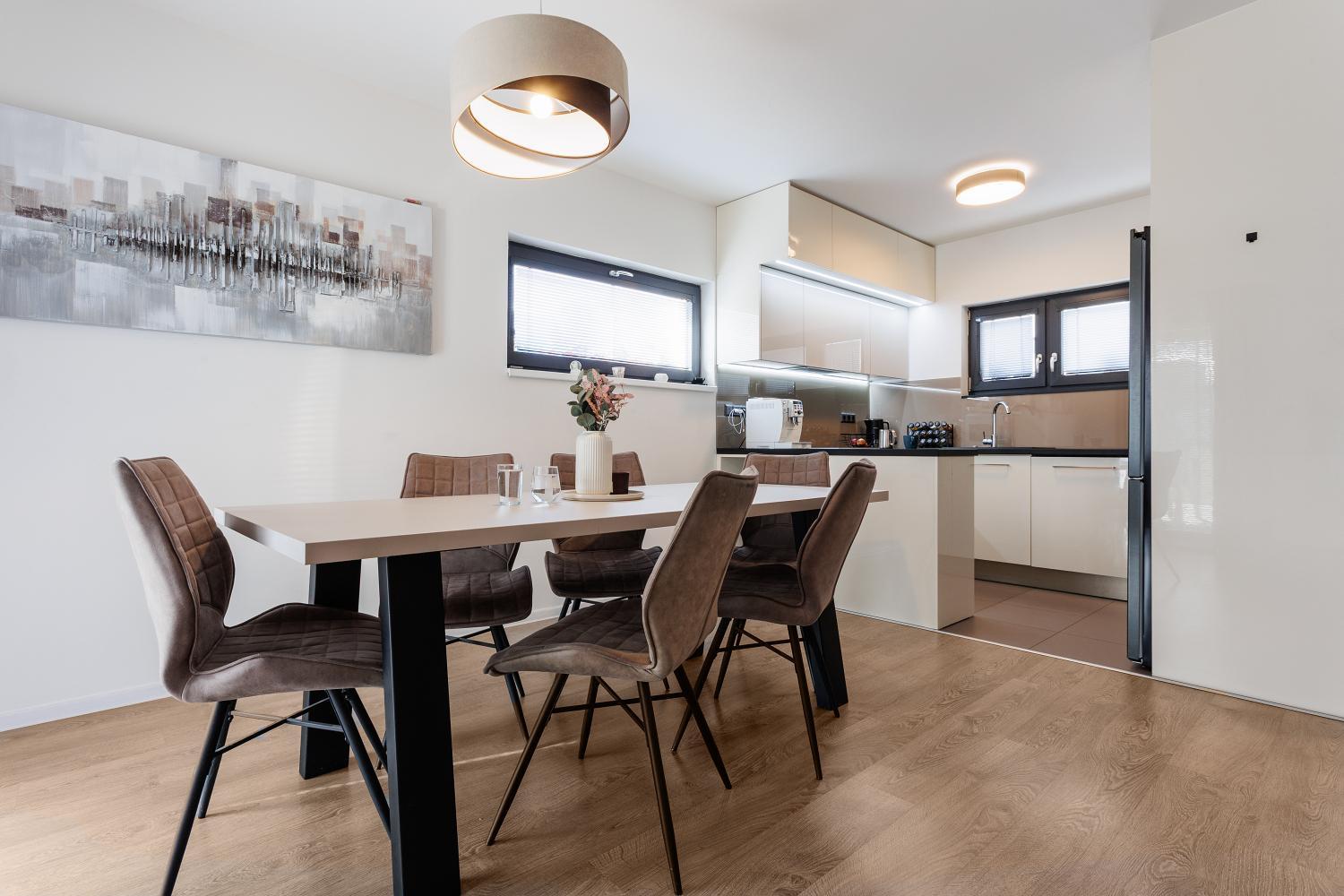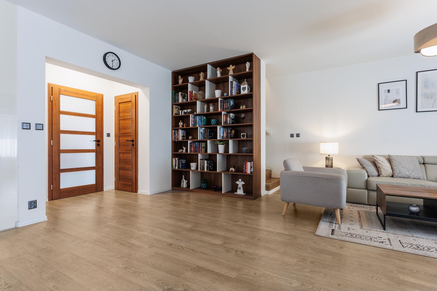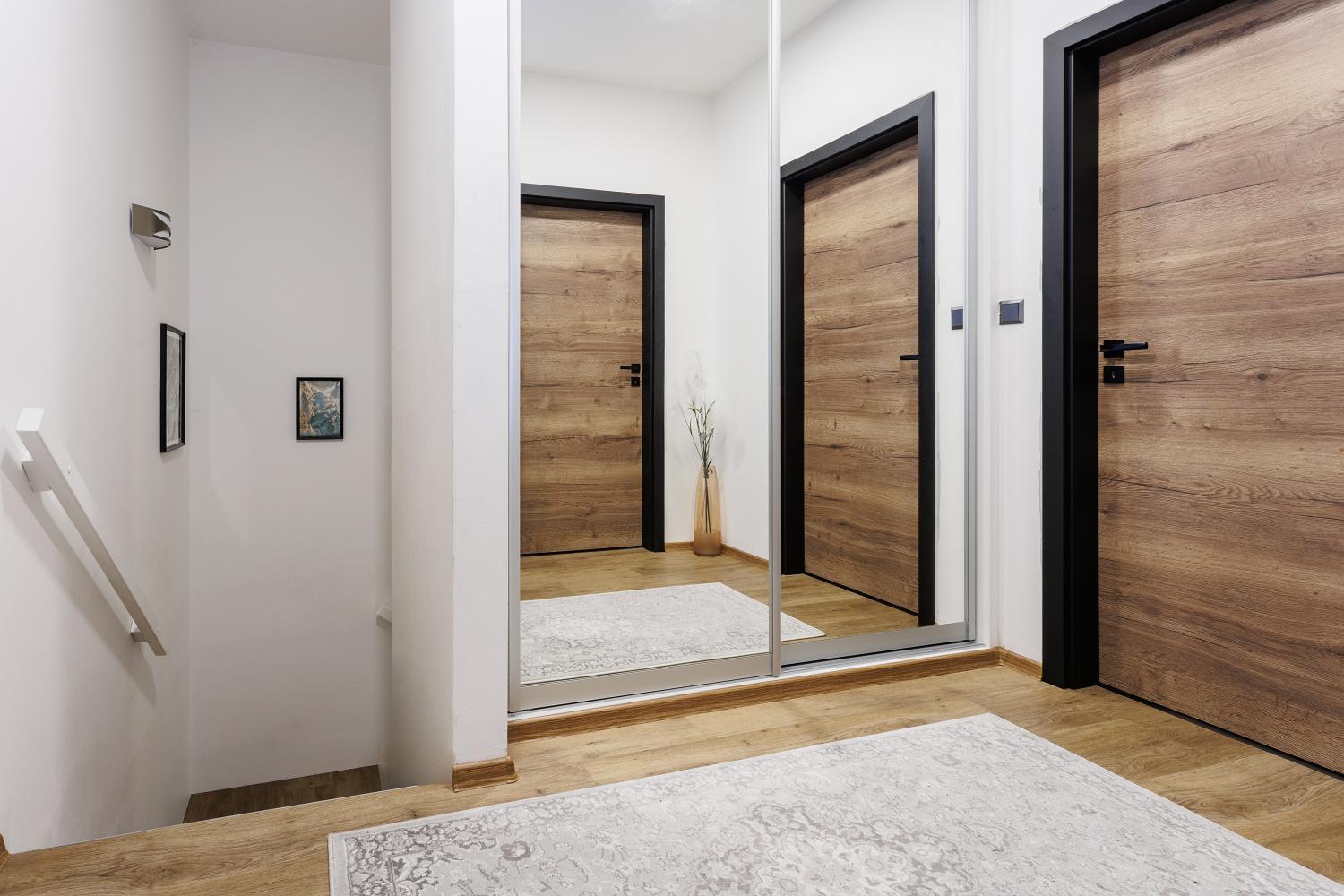 Okna jsou plastová v antracitové barvě s orientací na jih a sever. Vnitřní dveře jsou plné nebo částečně prosklené v dekoru dřeva, vstupní dveře jsou plastové, částečně prosklené, v antracitové barvě.