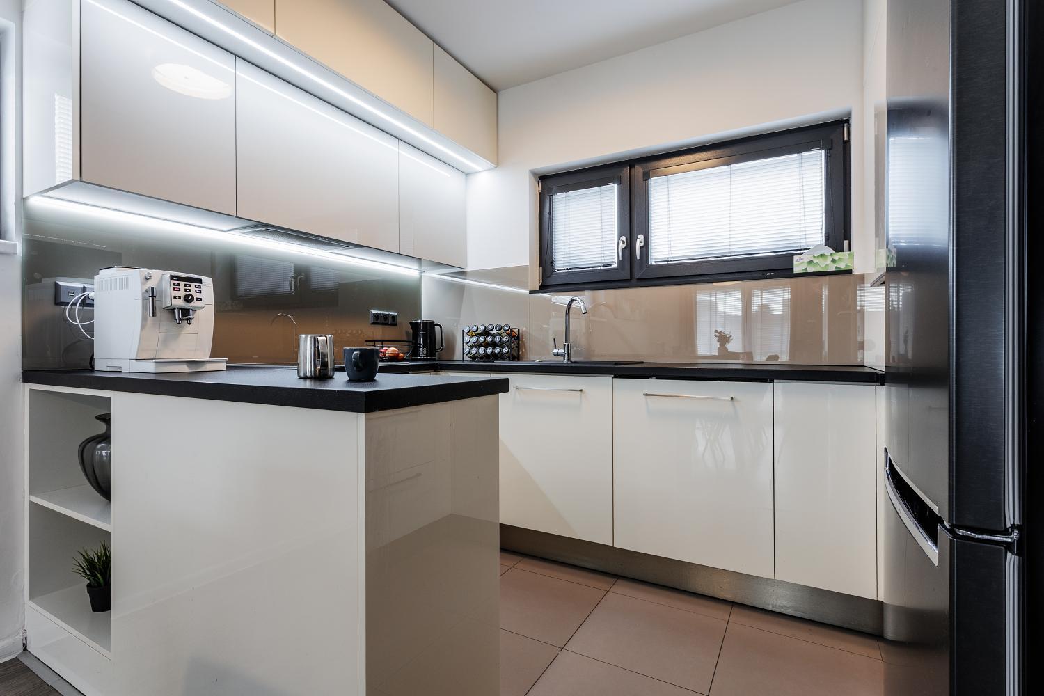 Kuchyňský kout je vybaven vestavnou indukční varnou deskou, myčkou a lednicí s mrazákem, vše zn. .
