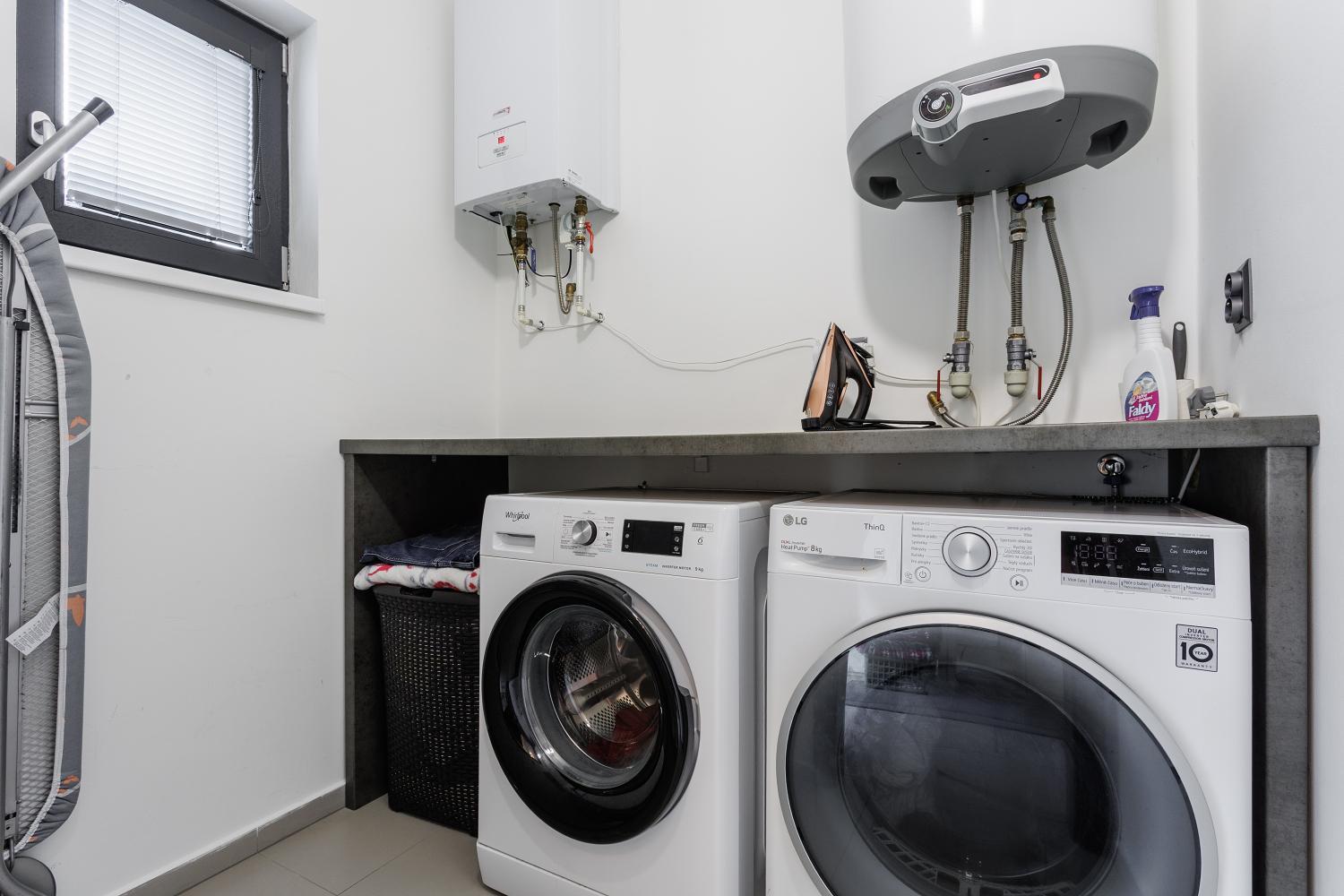 V domě je instalováno teplovodní podlahové vytápění, ohřev vody zajišťuje elektrický kotel Protherm. Plyn není do domu přiveden, plynová přípojka se nachází u oplocení rodinného domu.