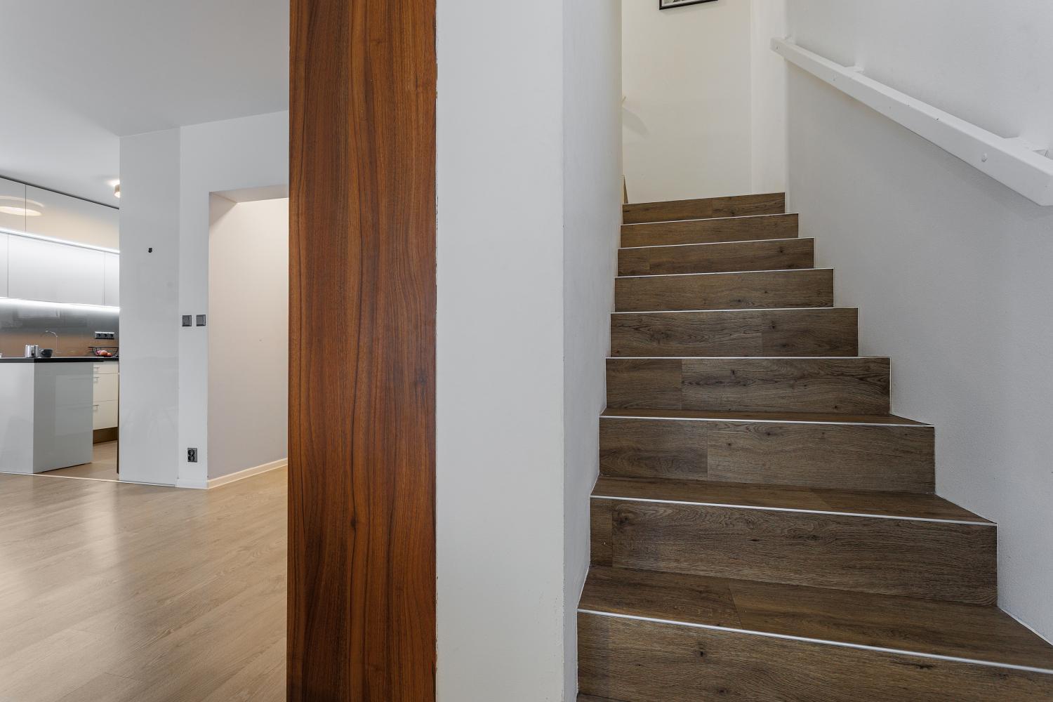 Podlahy jsou betonové s kvalitní plovoucí podlahou a dlažbou. Vnitřní schodiště je betonové, obložené vinylem v dekoru dřeva.