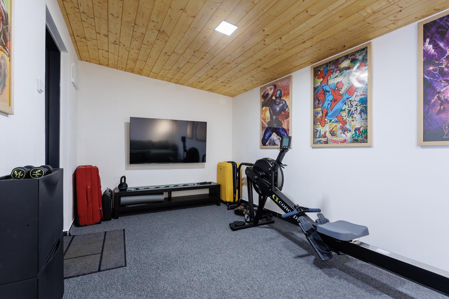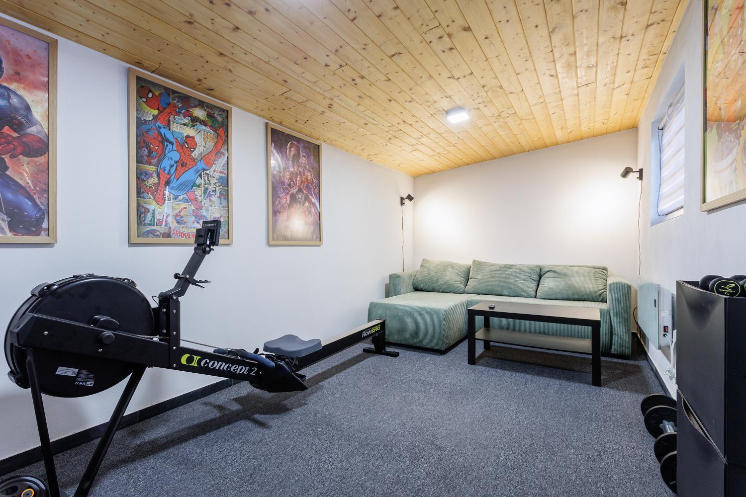 Zděný zahradní domek je využíván jako odpočinkové místo pro sport (viz foto), navazuje na něj menší kůlna.