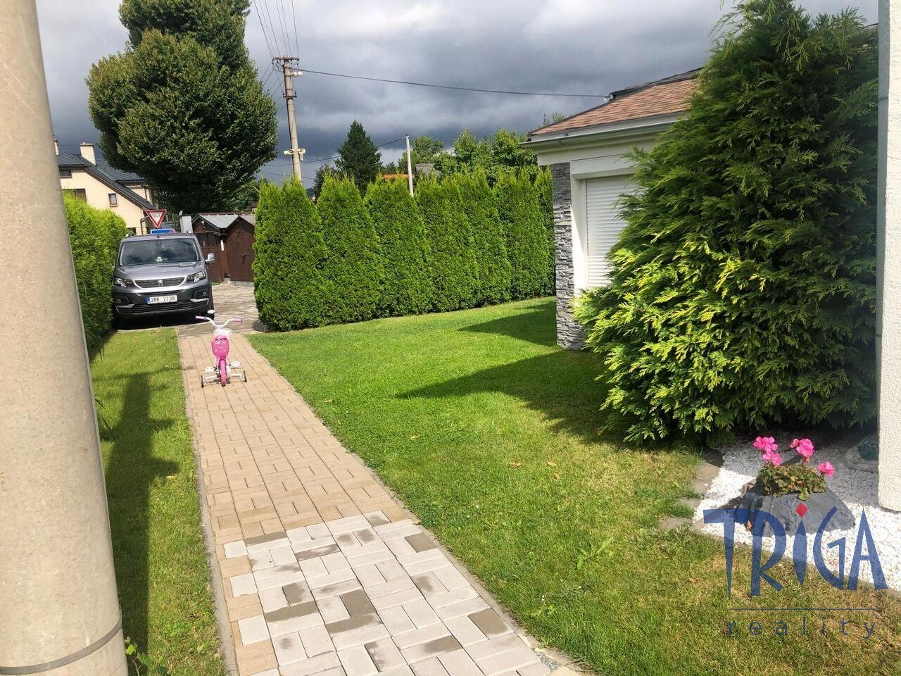 Vjezd na pozemek je řešen zajížděcí bránou na dálkové ovládání. Zahrada je společná, k domu náleží k užívání plocha cca 370 m².
