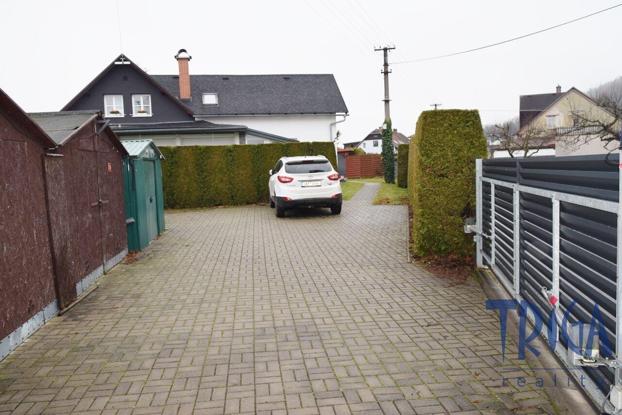Na udržované okrasné zahradě se nachází túje, dlážděné parkovací stání pro 2–3 auta a dva plechové zahradní domky na nářadí.