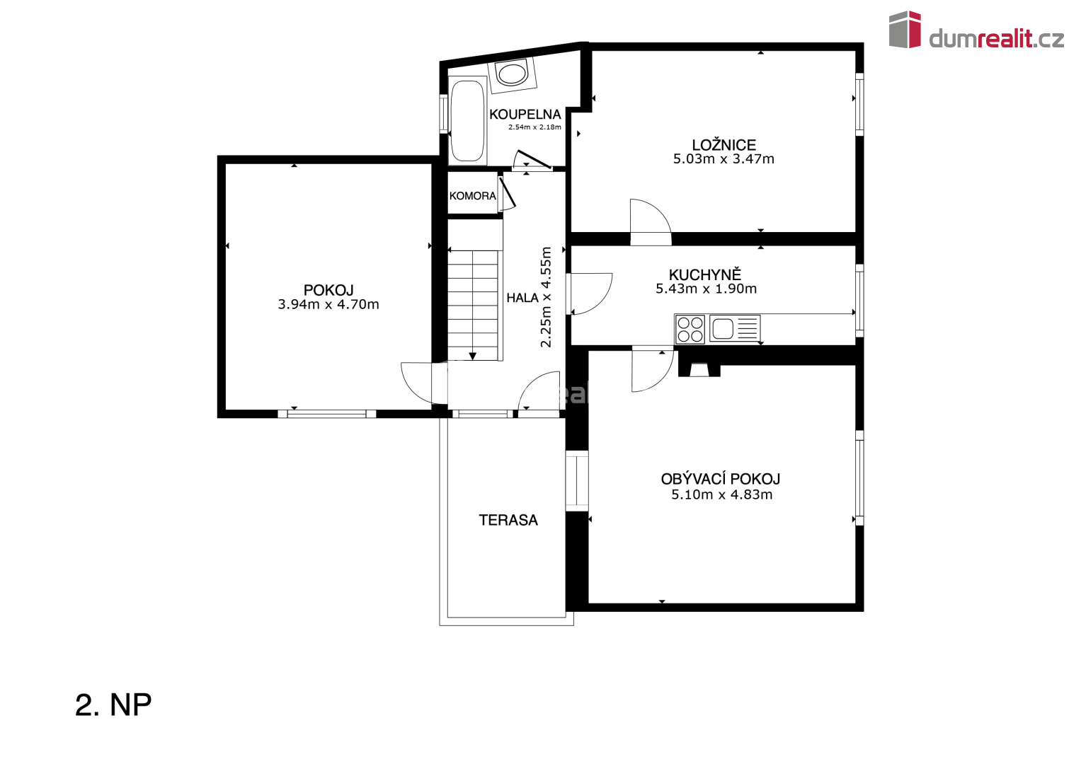 V 2 NP je dispozice 3+1 dle matterportu o velikosti 86 m², a to dvě ložnice, obývací pokoj, kuchyně, koupelna s vanou.