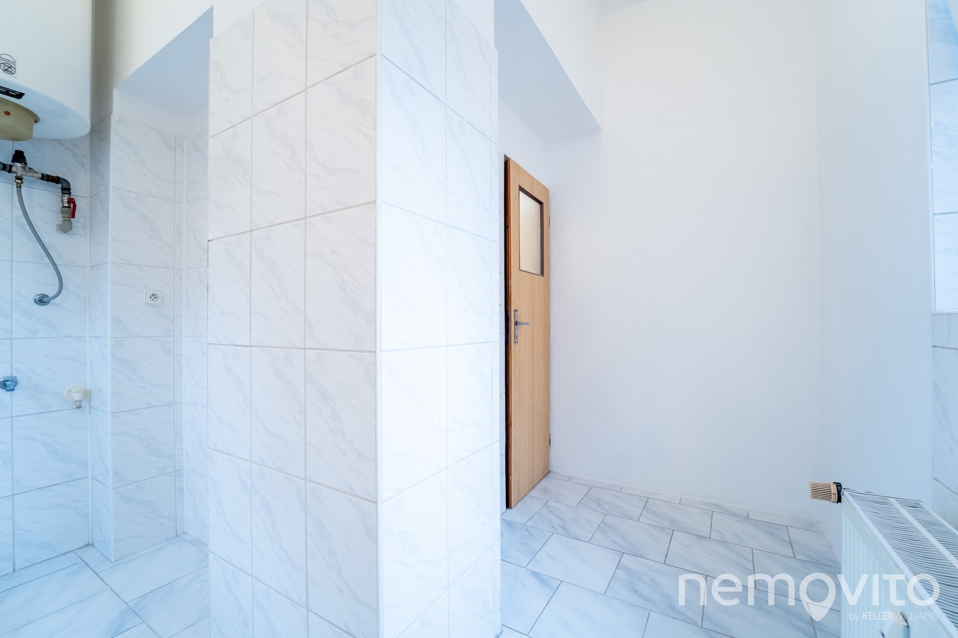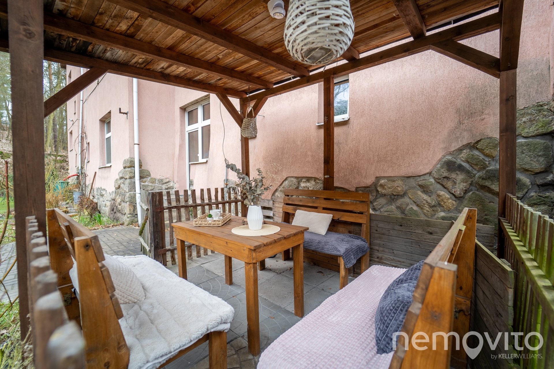 Kuchyně je prakticky řešená a vybavená vším, co potřebujete pro každodenní fungování – varná deska, trouba, mikrovlnná trouba, digestoř i myčka. A právě z kuchyně se dostanete zadním vchodem ven, kde na vás čeká příjemné posezení pod pergolou a kousek zahrádky. Ideální místo na ranní kávu, letní večeře nebo chvíle klidu po práci.