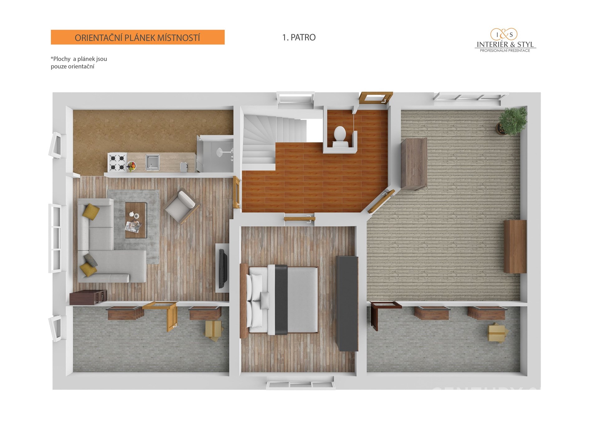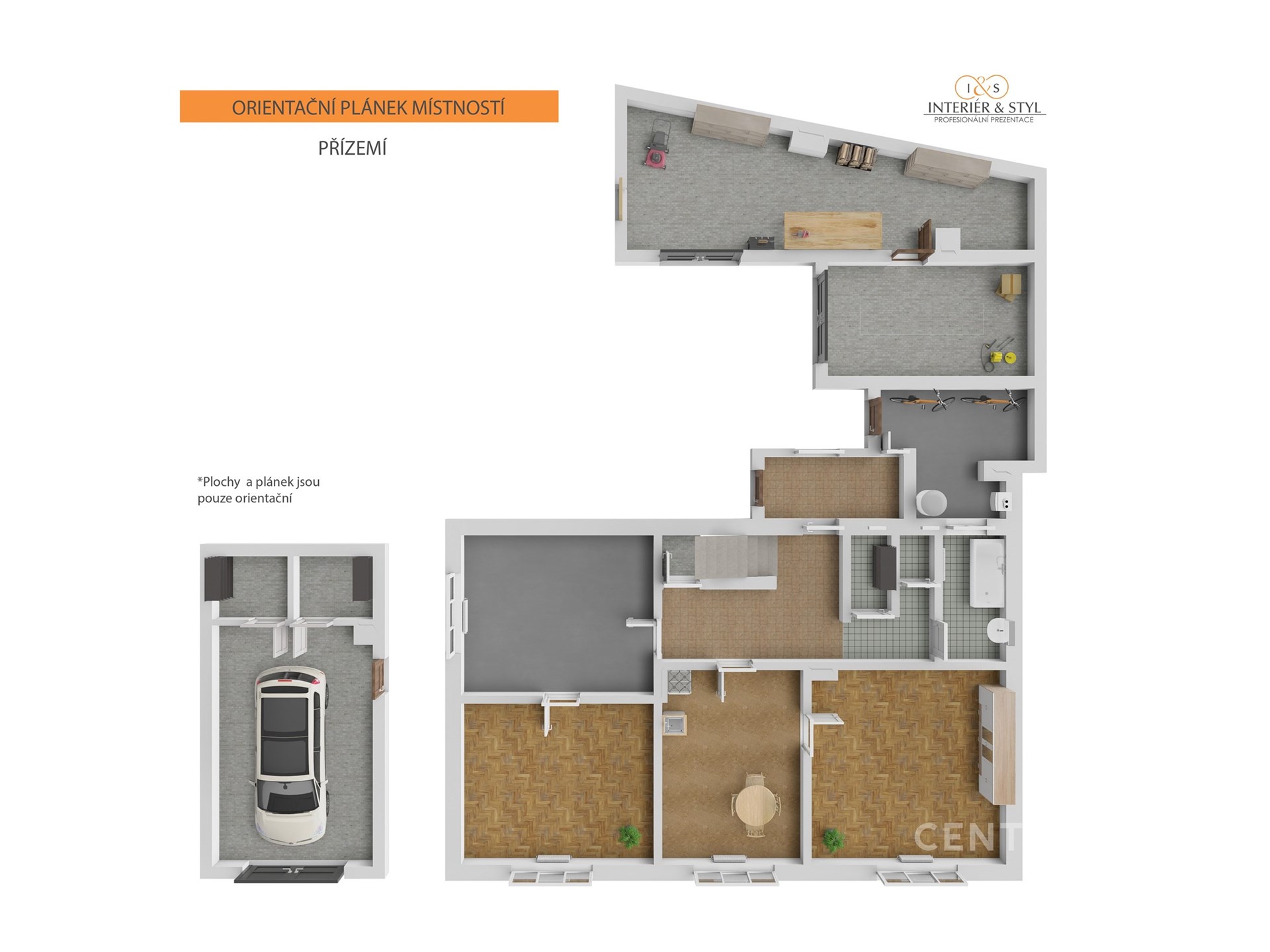 Ve fotogalerii naleznete kromě 3D půdorysu také vizualizace, jak by mohla kuchyň a obývací prostor vypadat po rekonstrukci.