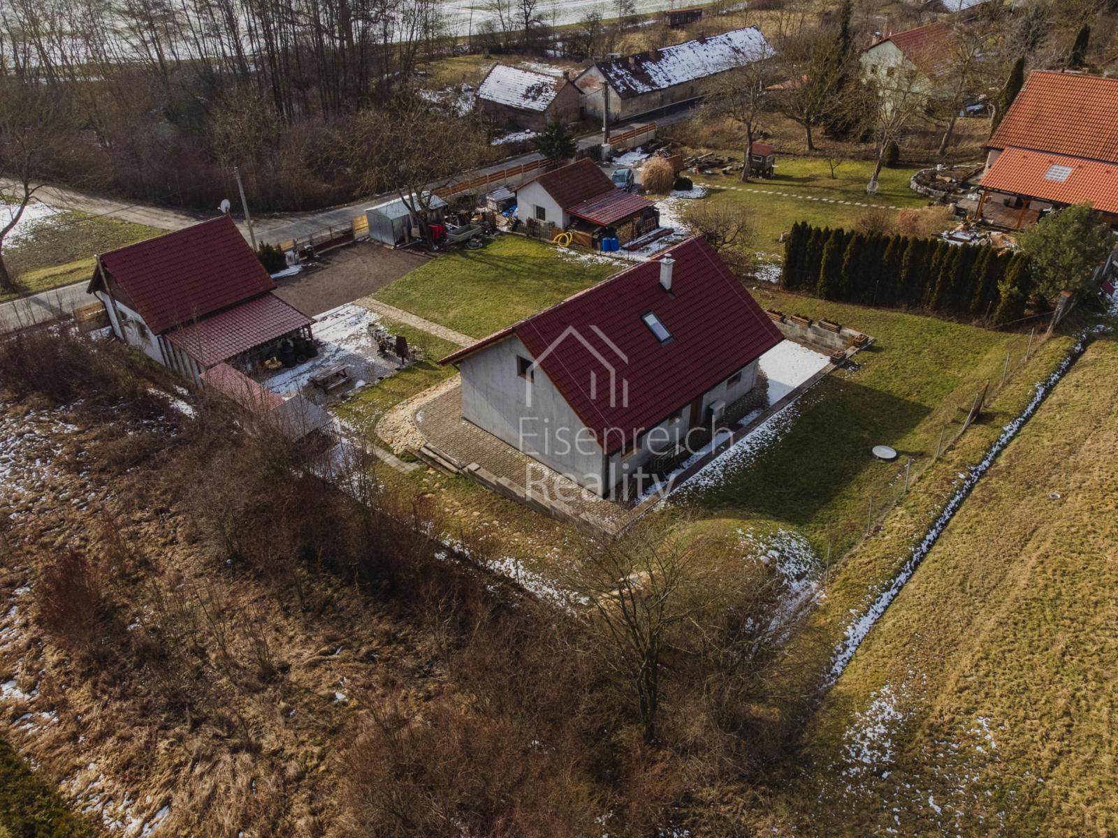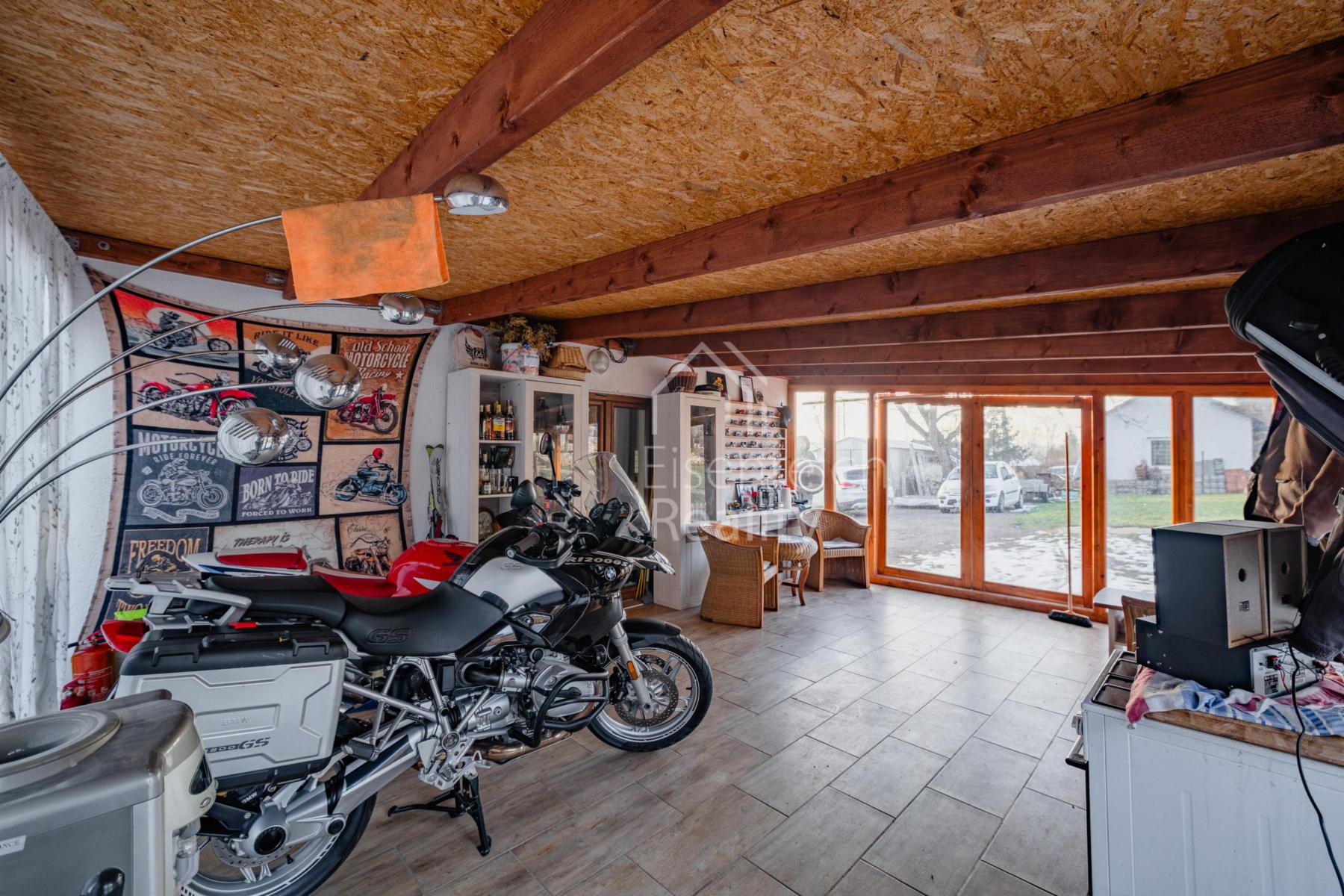 Součástí nemovitosti je garáž se zázemím o velikosti 35,6 m a navazující prostor pro letní posezení o výměře 28,8 m. Na zahradě se dále nachází útulný sklípek s posezením, ideální pro relaxaci i společenská setkání.