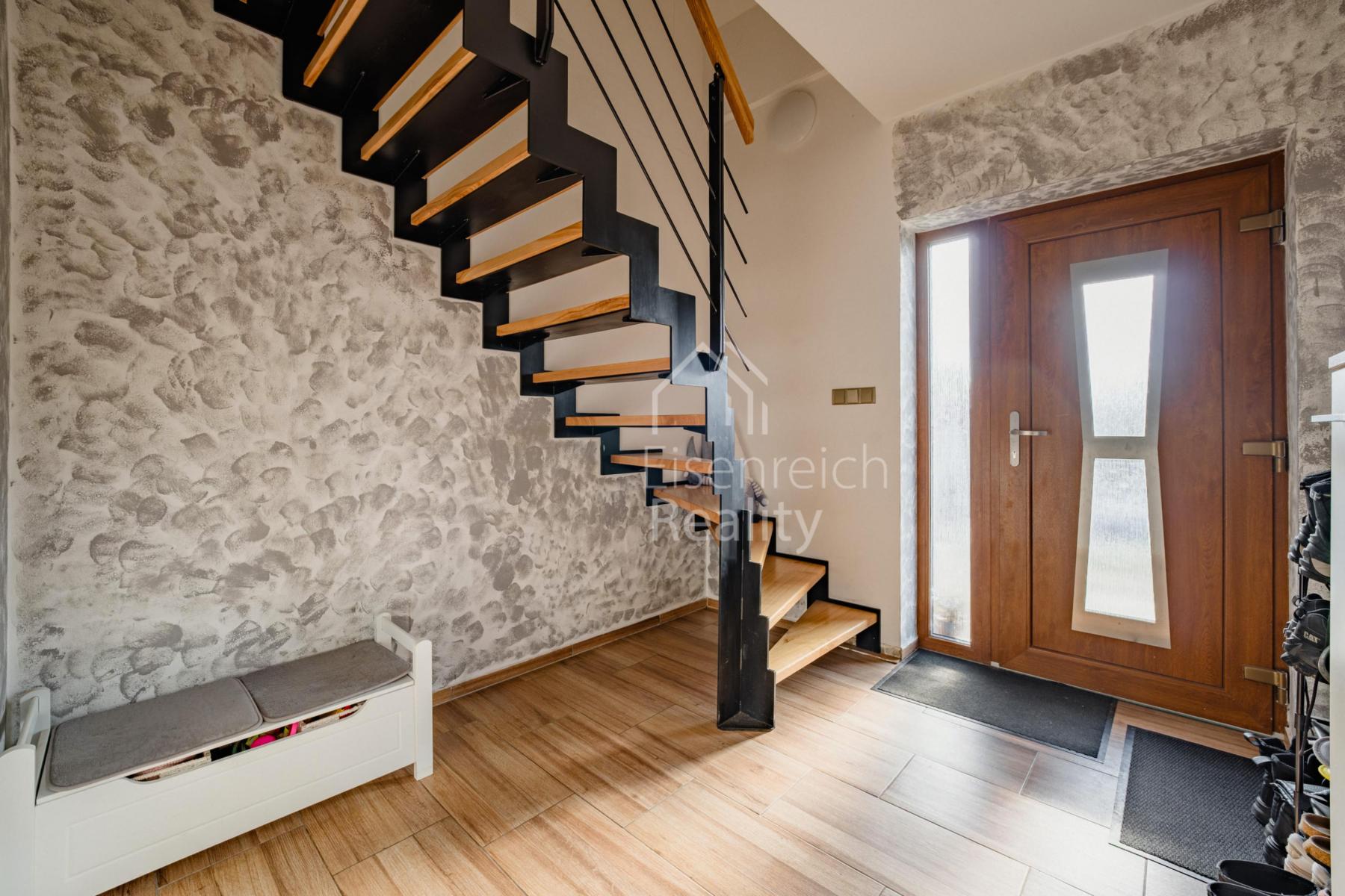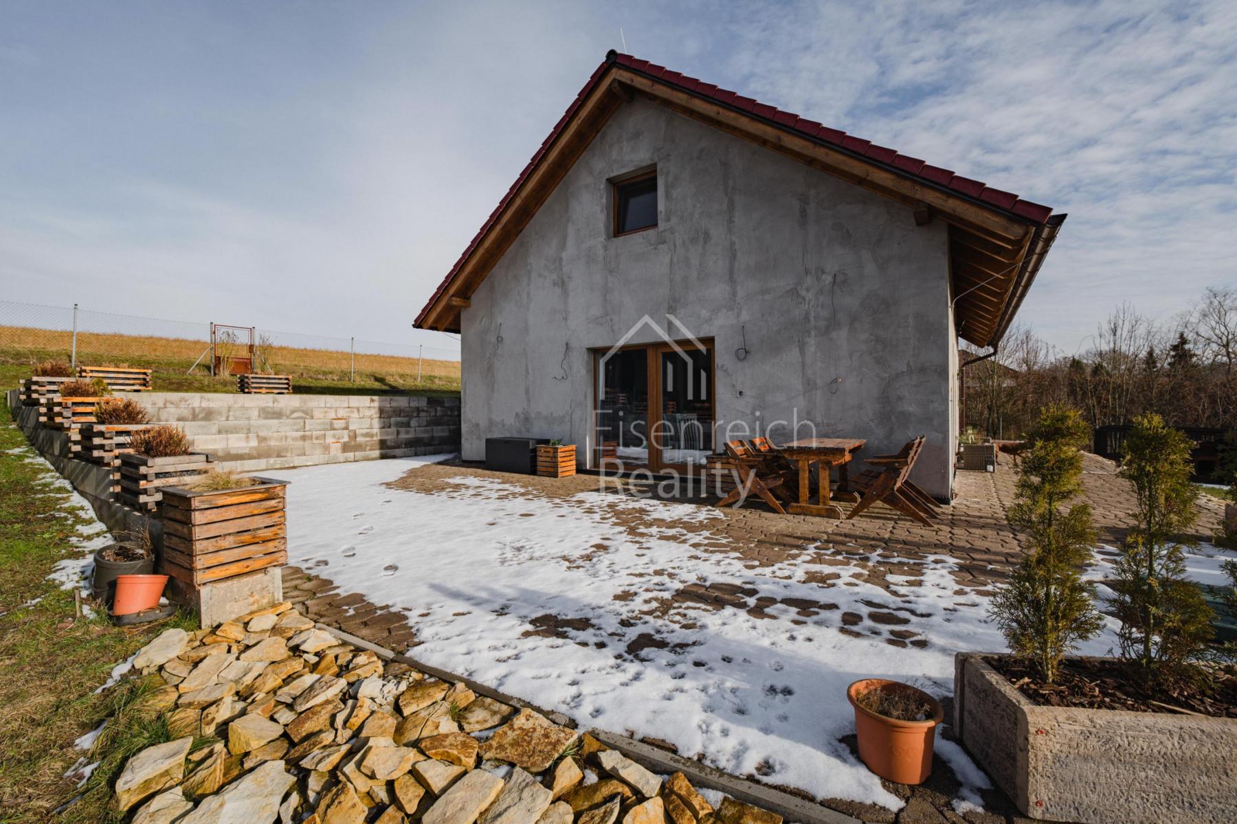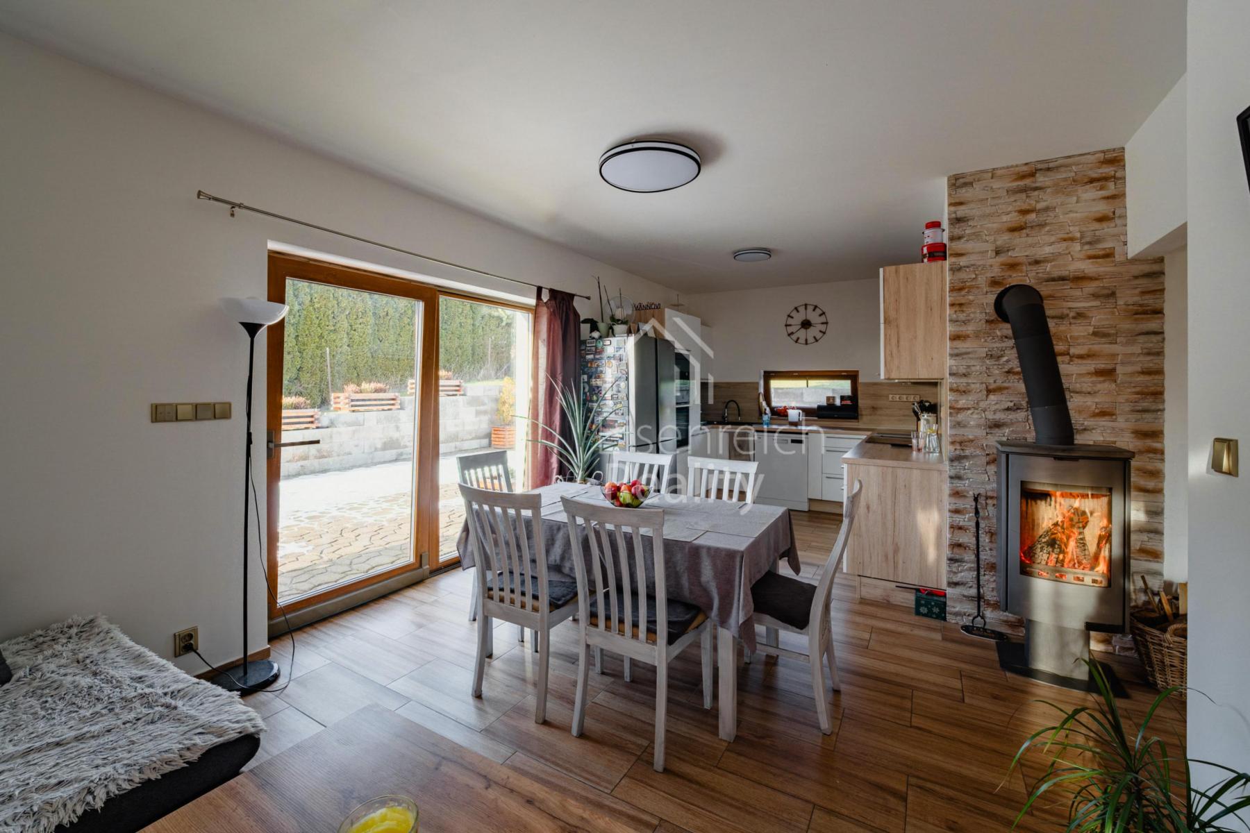 Dům je navržen s důrazem na komfort, kvalitu a praktické rodinné bydlení. Dominantou přízemí je světlý obývací pokoj s krbovými kamny a přímým vstupem na terasu, která plynule navazuje na zahradu. Součástí je plně zařízená kuchyň včetně spotřebičů. V celém domě je instalováno podlahové vytápění, plastová okna s trojskly zajišťují výborné tepelně-izolační vlastnosti.