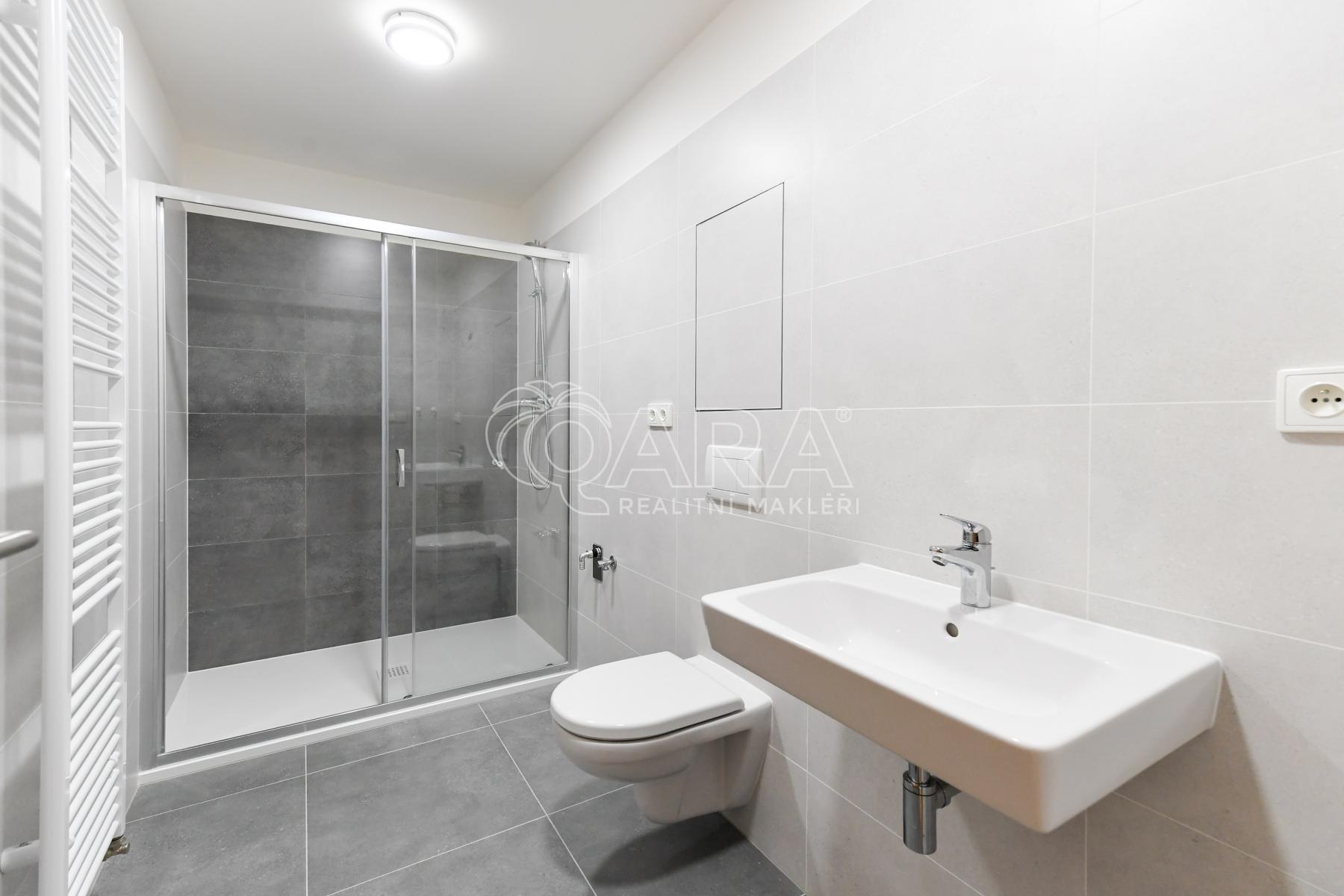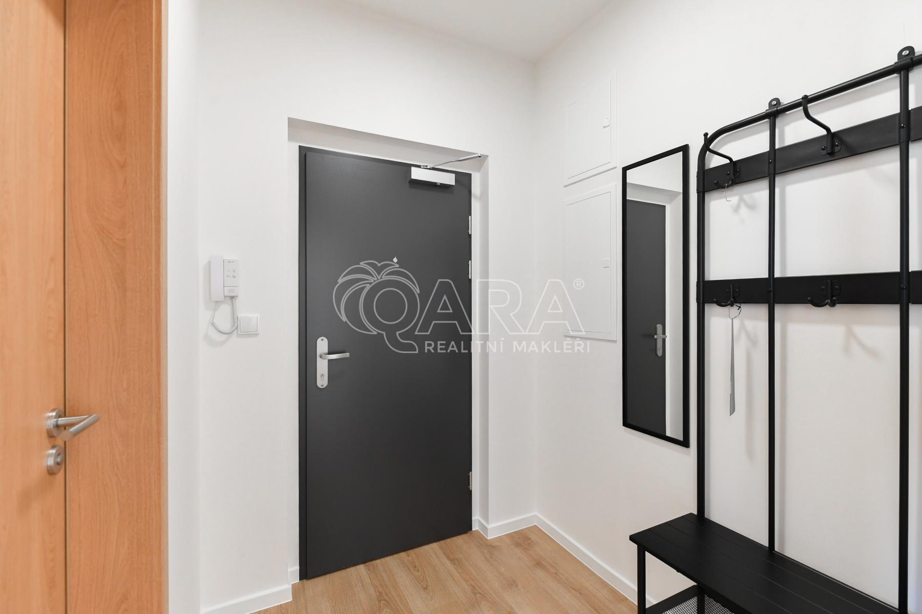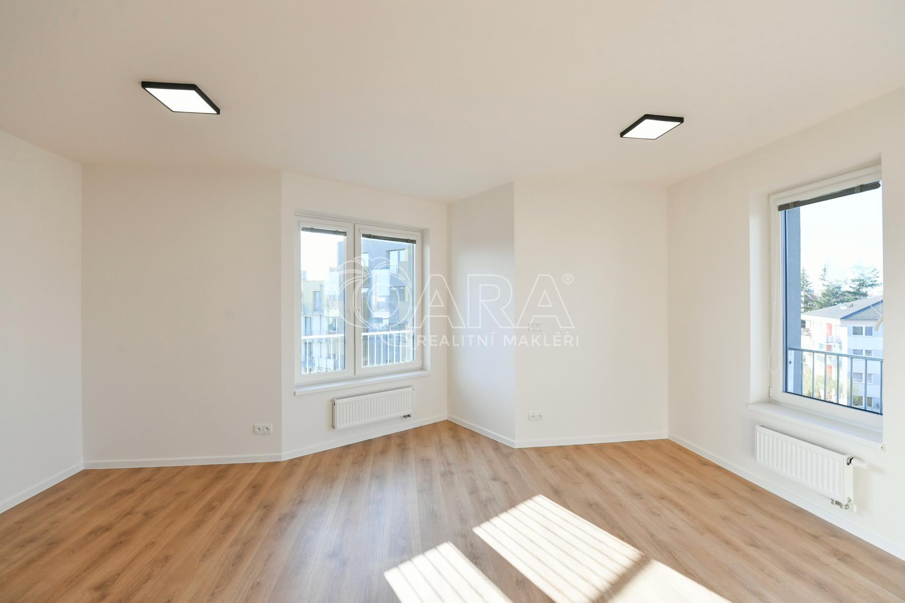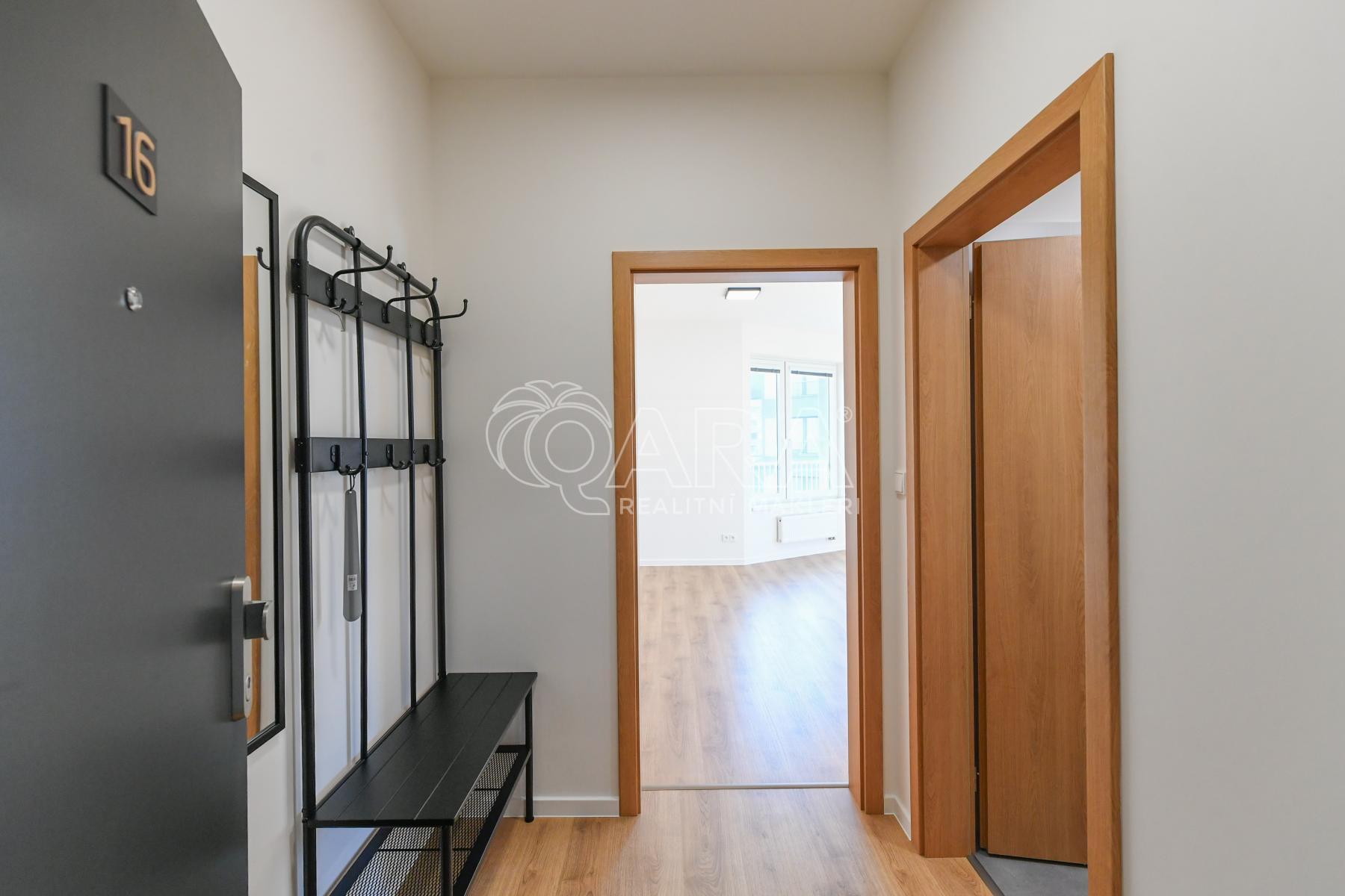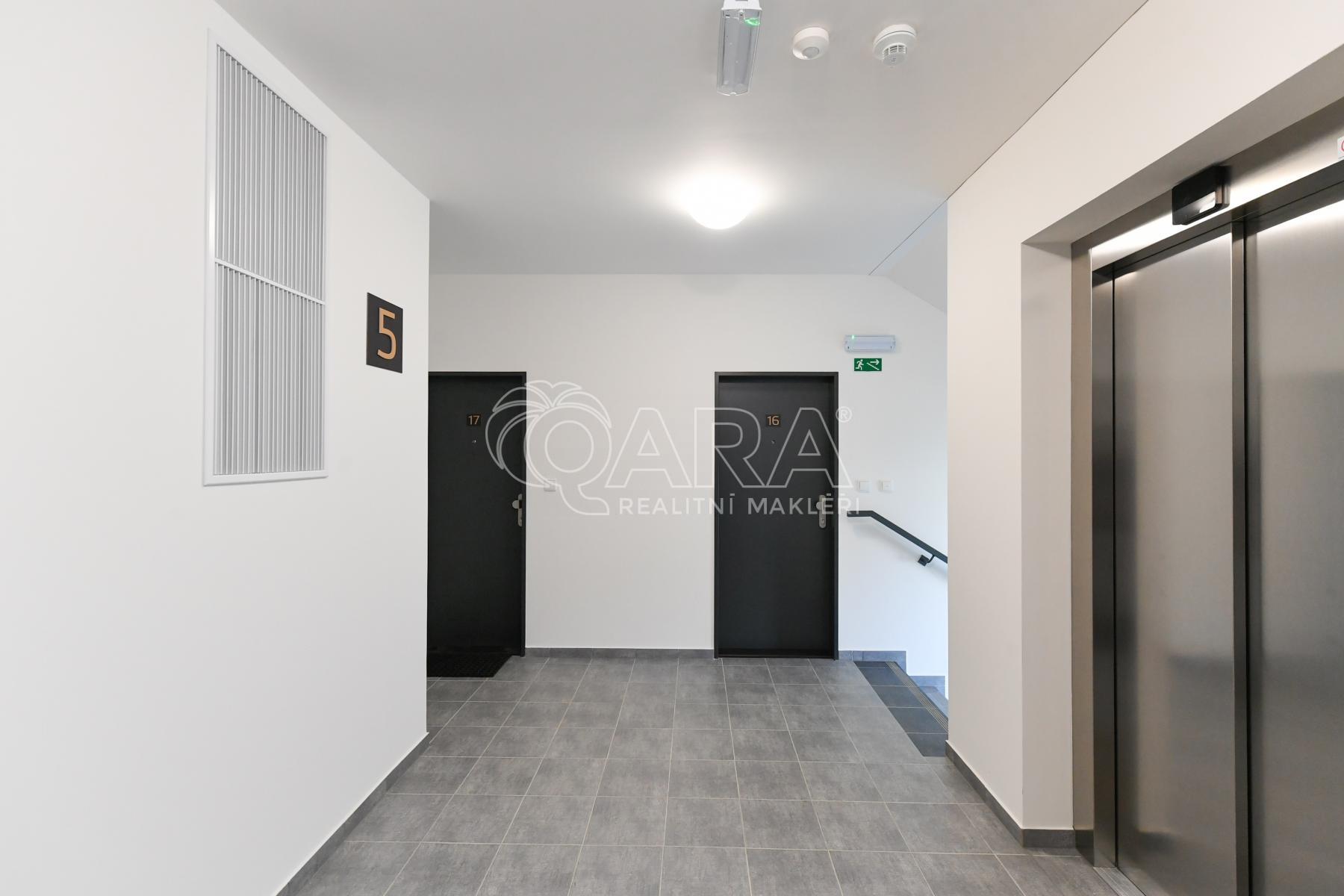 Byt o výměře 33,5 m and sup2; (vnitřní plocha 31,2 m and sup2;) je umístěn v 5.NP novostavby bytového domu z roku 2025, který se nachází v širším centru města. Byt se pronajímá zařízený kuchyňskou linkou včetně vestavěných spotřebičů (varná deska, trouba myčka). Podlaha je v celém bytě plovoucí laminátová, v koupelně a na WC je dlažba. Orientace oken je na západ a sever. Vytápění zajišťuje centrální plynová kotelna v domě. Dům je vybaven výtahem. K bytu dále náleží sklepní kóje (2,3 m and sup2;) a je zde možnost pronájmu garážového stání za 2.000,- Kč/měsíčně, které je umístěné v suterénu.
