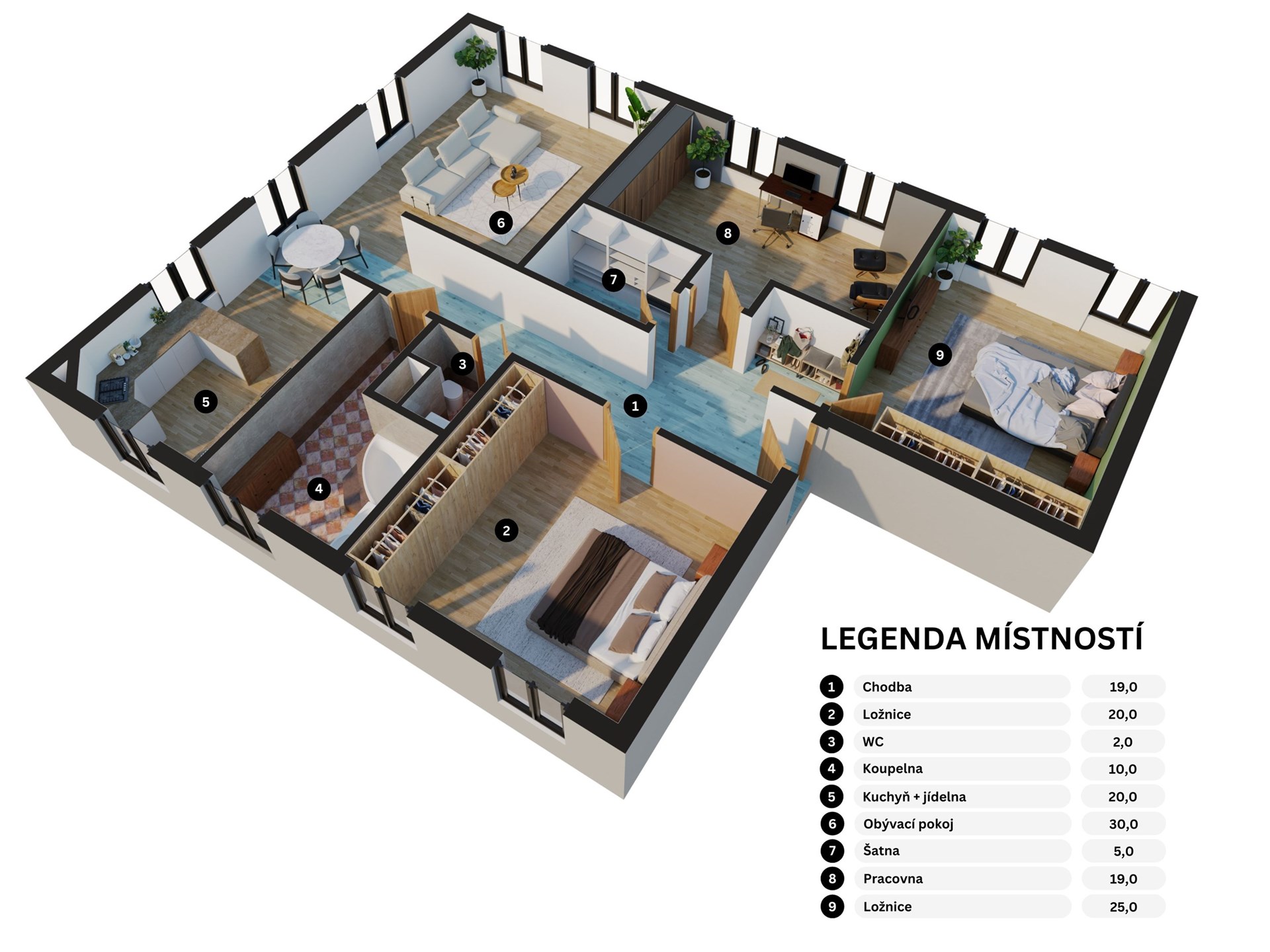 • 3 samostatné ložnice – soukromí pro každého člena domácnosti