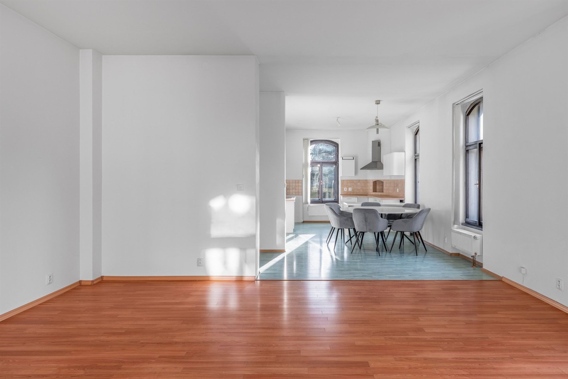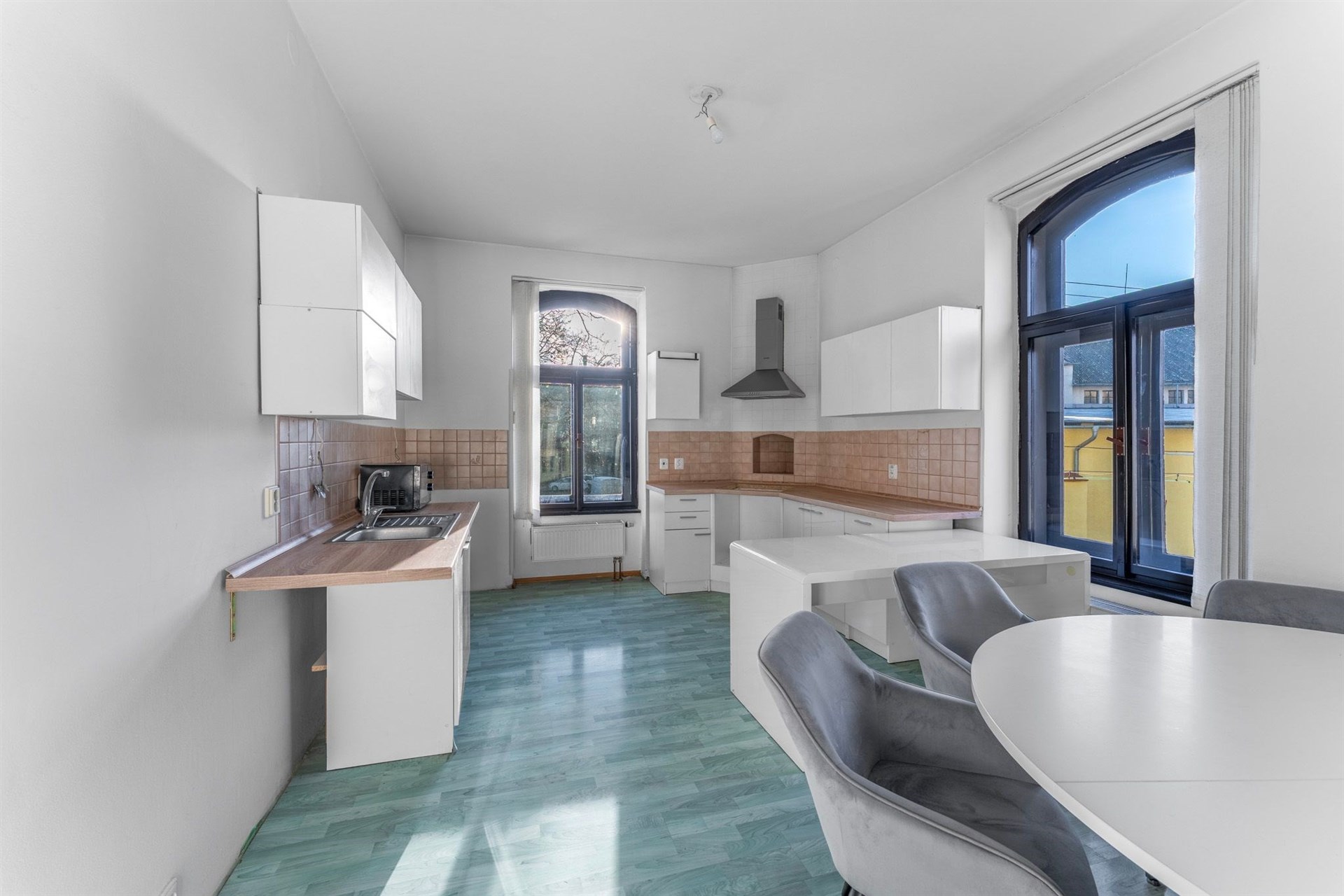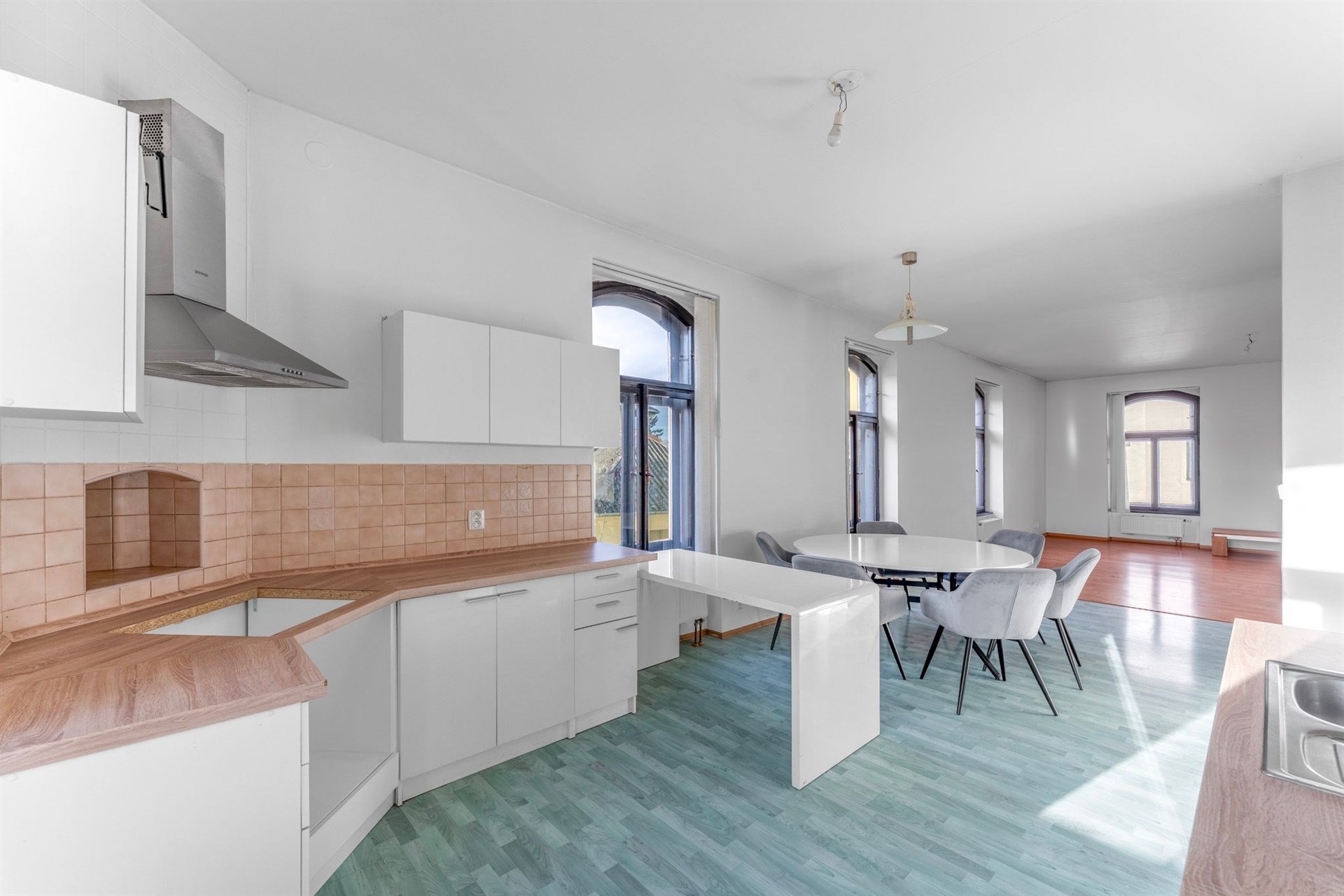 • Světlý obývací prostor s kuchyňským koutem – otevřený a vzdušný interiér