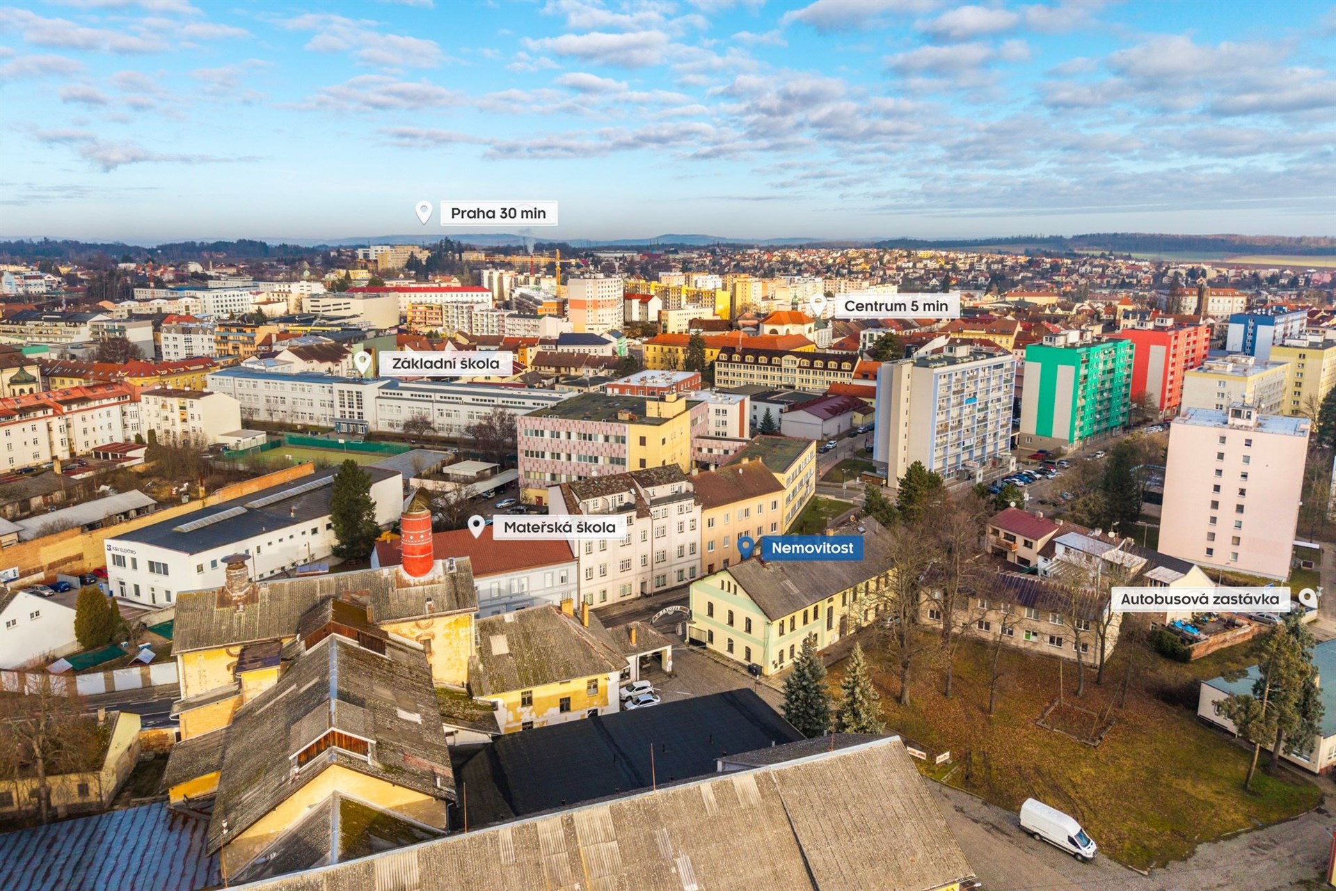 • Výborná dostupnost do Prahy (vlak, autobus, D1 cca 20 minut autem na okraj města)