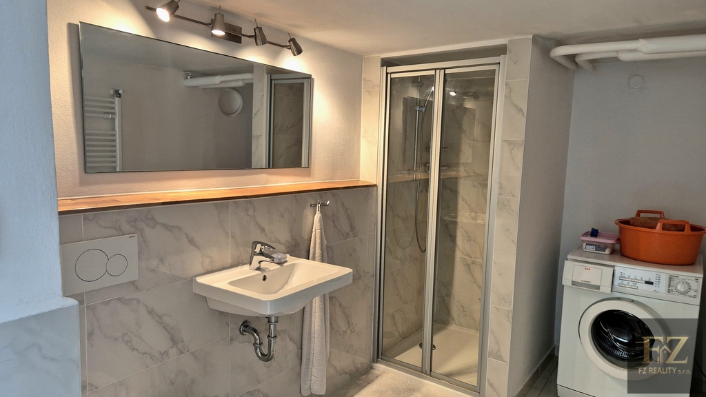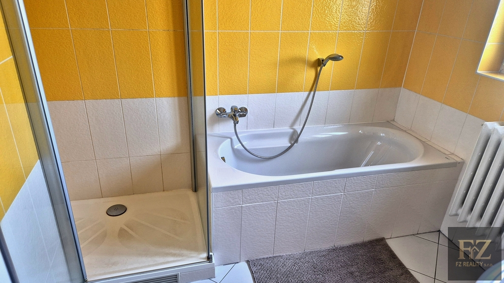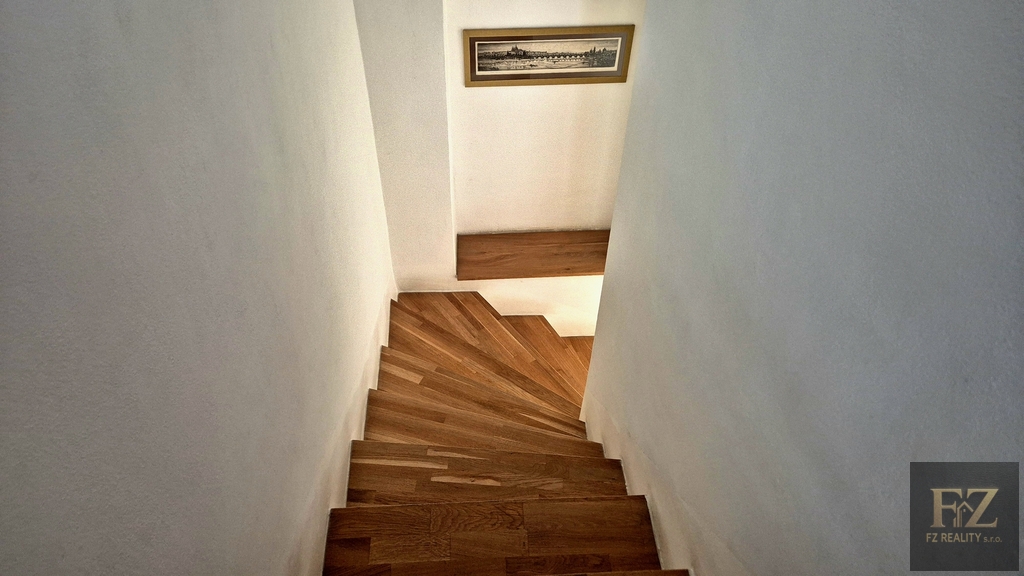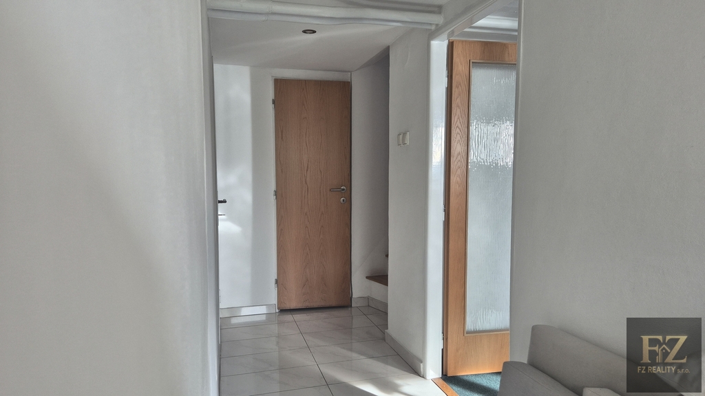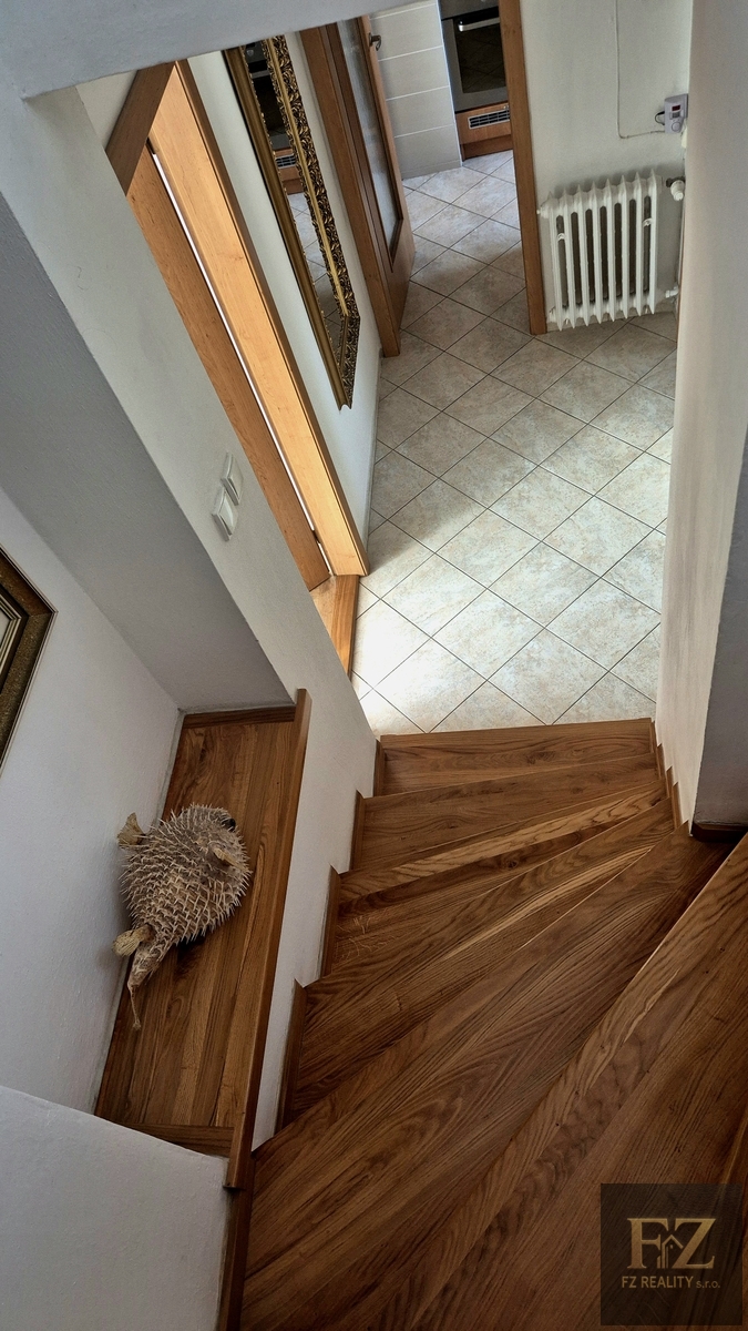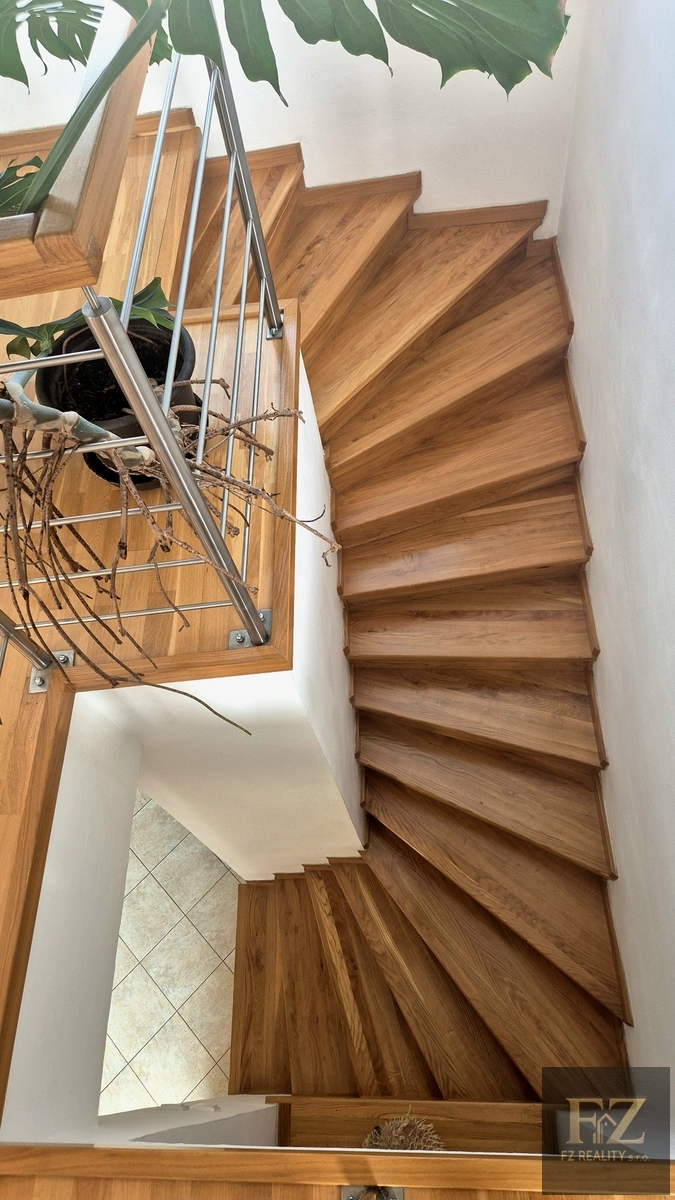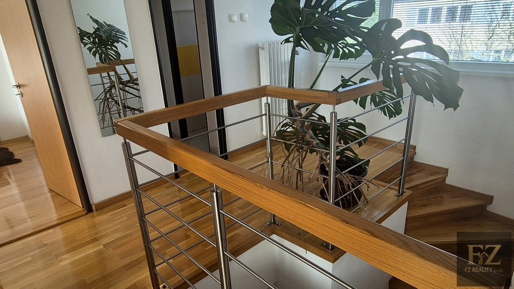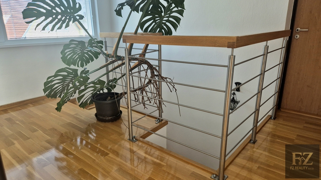 V patře se nachází ložnice se vstupem na prostornou lodžii, koupelna se sprchovým koutem i vanou, dva pokoje a šatna s možností využití jako další pokoj či pracovna.