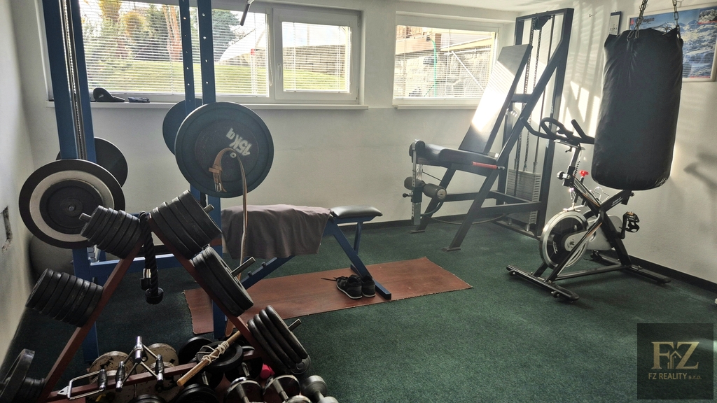 Ve sníženém přízemí se nachází posilovna o dvou místnostech, koupelna se sprchovým koutem, toaletou a pračkou, šatna, místnost s možností vybudování kuchyně a prostor připravený na saunu, dále technická místnost. Z tohoto podlaží je také přímý vstup na zahradu.