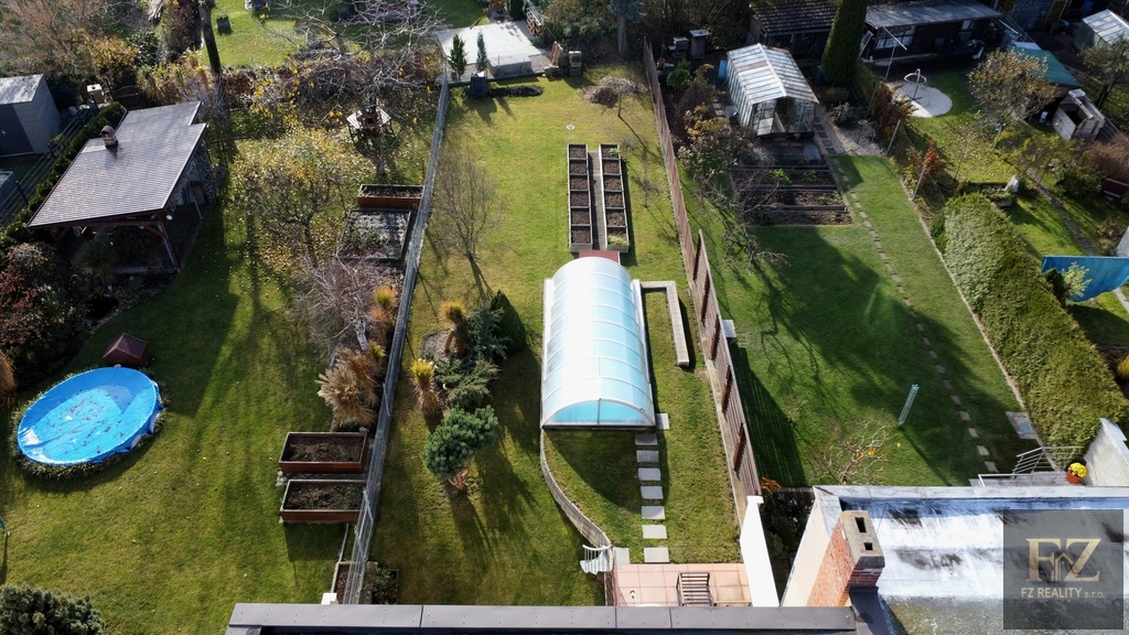 Celková výměra pozemku činí 466 m², z toho 310 m² připadá na udržovanou zahradu s bazénem o velikosti 15 m². Dům má užitnou plochu 280 m² a je rozdělen do tří podlaží.