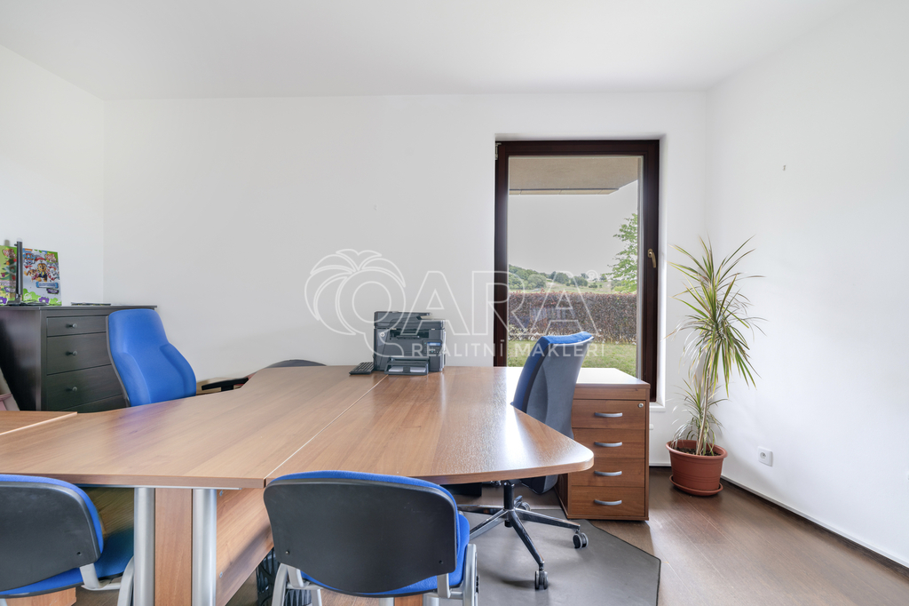 Byt, kolaudovaný v roce 2014, má dispozici 3+kk a je opravdu prostorný – předsíň má 10 m2, ložnice 17,4 a 15,4 m2, obývák s budoucím kuchyňským koutem 31,2 m2, koupelna 4,1 m2 a WC s pračkou 2,9 m2. Dále k bytu patří velký sklep 5,5 m2 a výjimečně i předzahrádka 90 m2, jejíž součástí je terasa o ploše cca 12 m2. Obývací pokoj a předzahrádka jsou orientované na jihozápad, pokoje na severovýchod a jihovýchod. V areálu za závorou budete mít i vlastní parkovací stání.
