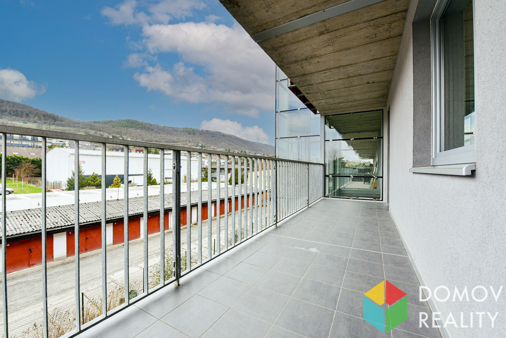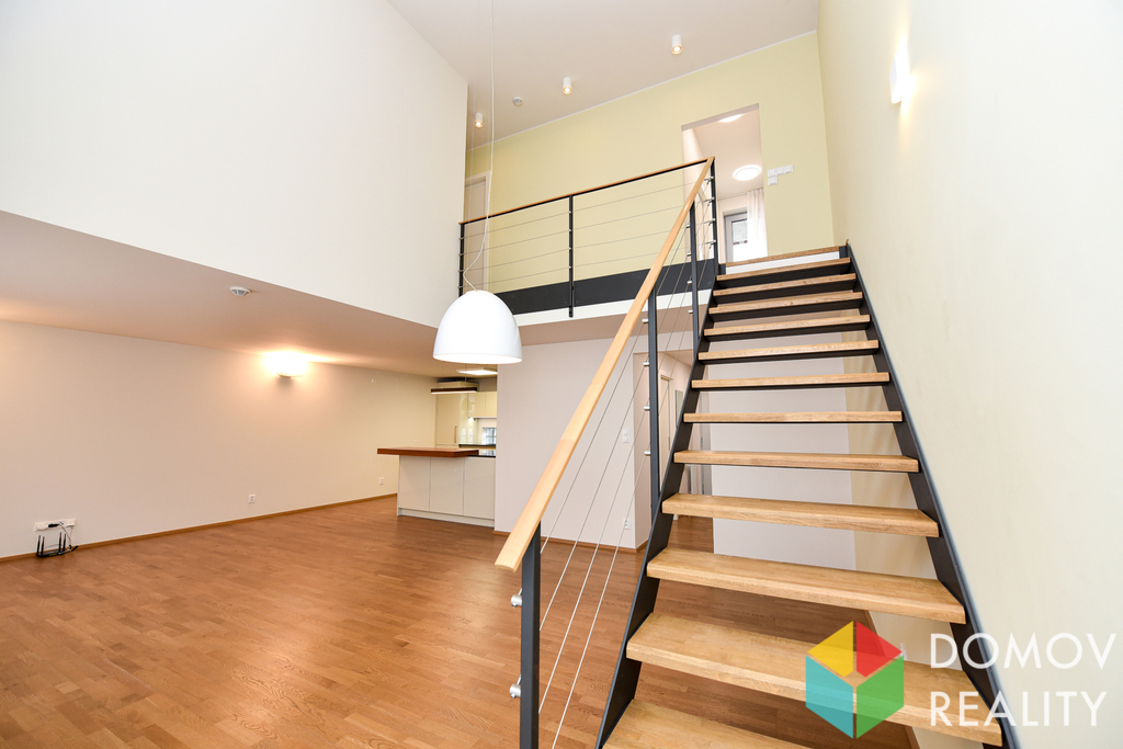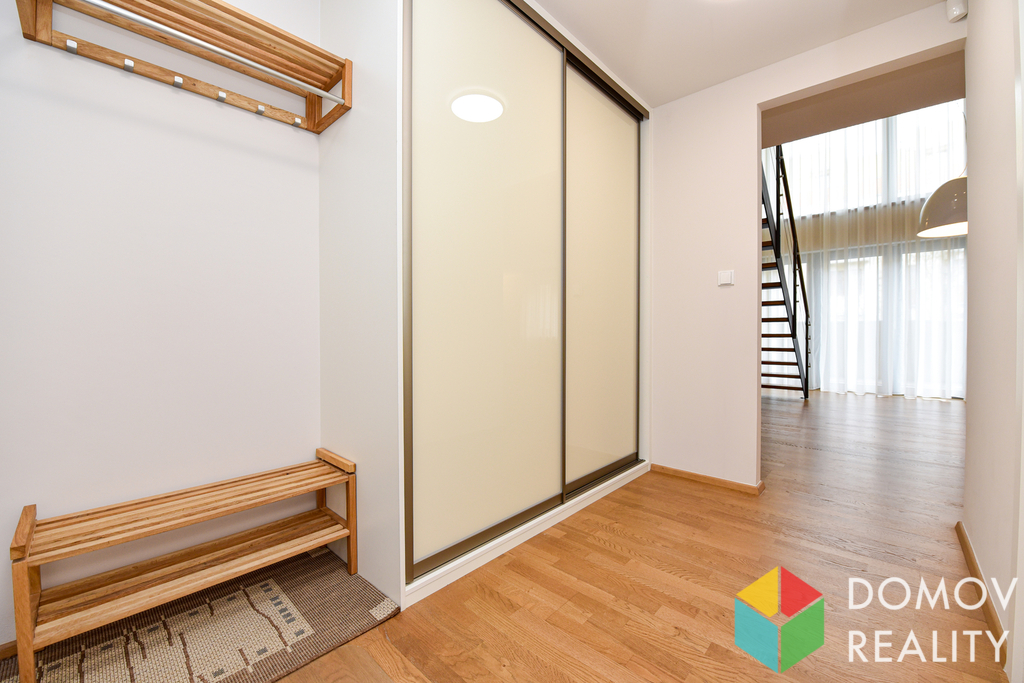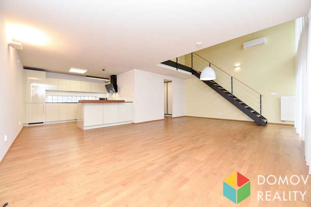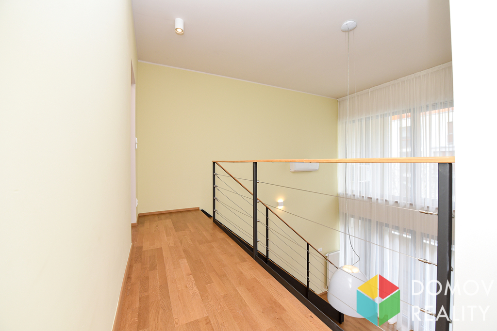 Nabízíme k prodeji moderní mezonetový byt s terasou, lodžií a krytým parkovacím stáním. Celková podlahová plocha bytu činí 108,2 m2 včetně sklepa. K bytu dále náleží na jih orientovaná lodžie s výměrou 15,3 m2 přístupná z obývacího pokoje ve 3. NP a na sever orientovaná terasa s výměrou 12,4 m2 ve 4. NP. Součástí prodeje je také kryté parkovací stání. Ve spodním patře bytu se nachází vstupní chodba, koupelna s toaletou, obytný prostor a kuchyně, po schodech se dostanete do patra se dvěma ložnicemi a druhou koupelnou.