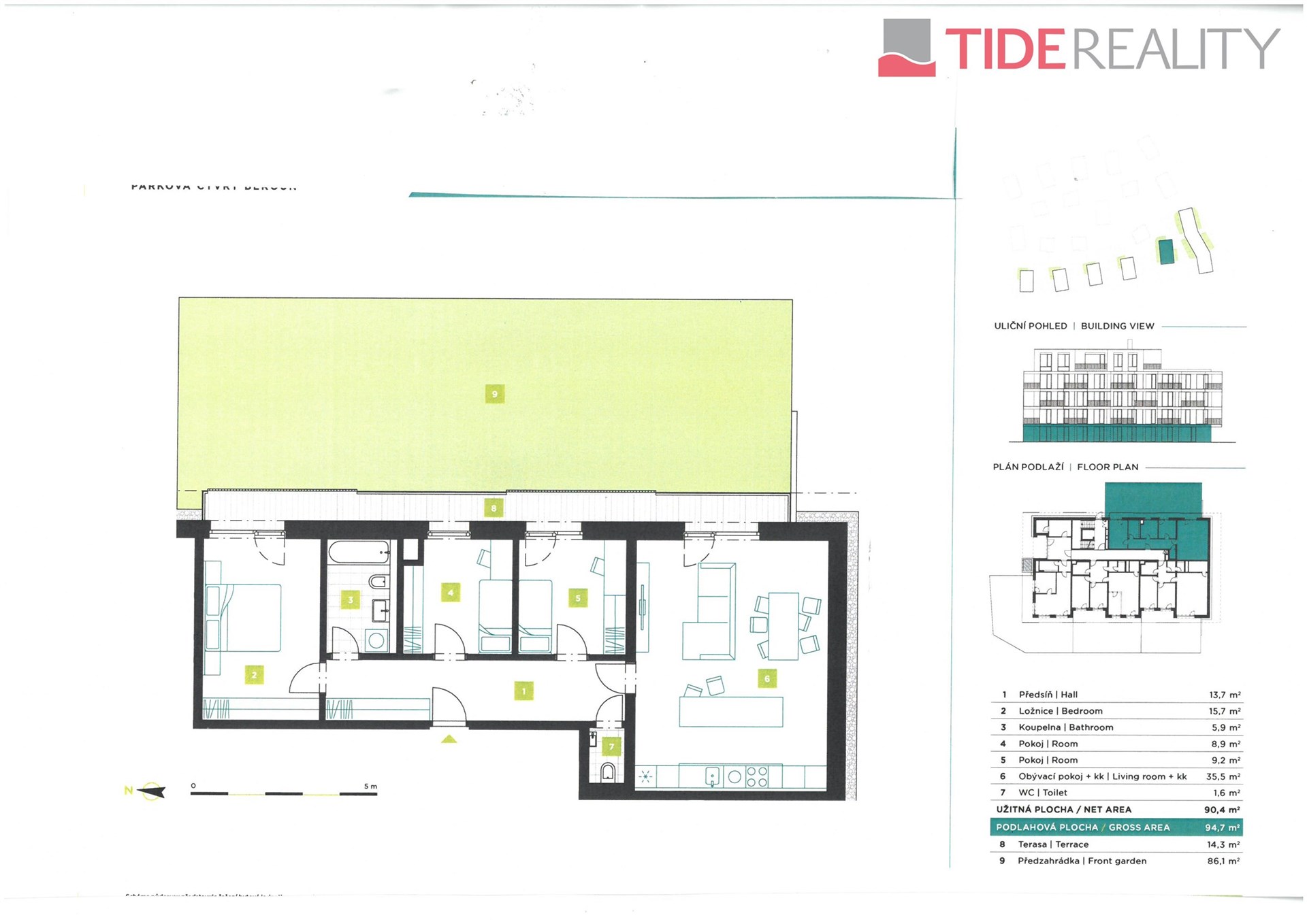 Tento konkrétní byt 4+kk o podlahové ploše 94,7m2 s terasou 14m2 a zahrádkou 86m2 se nachází v 1.PP ( v úrovni terénu) čtyřpodlažní budovy E4. Tento byt má na výběr min. 2 parkovací stání venkovní/vnitřní a sklep (není zahrnuto v ceně). V celém projektu je velký výběr bytů 3,4,5+kk v rozmezí 88 až 120m2 i ve vyšších patrech a s prostornými terasami. V současné chvíli je možné jednotky přizpůsobit i některým Vašim specifickým požadavkům, proto nás neváhejte kontaktovat.