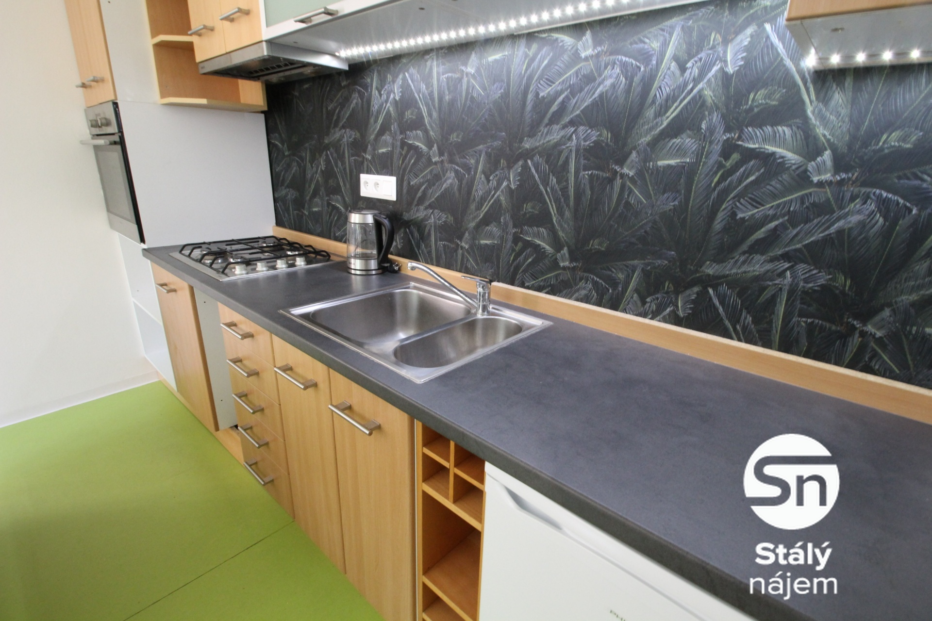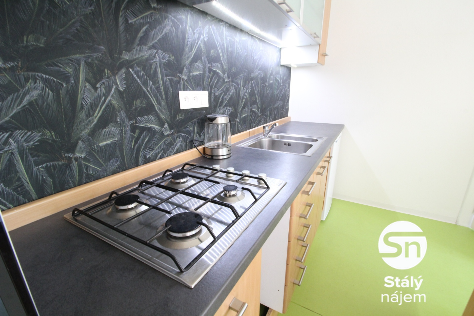 Z chodby s velkou vestavěnou skříní bytu se dostanete do koupelny s pračkou, vanou a WC a dále po pravé straně do obývacího pokoje s kuchyňským koutem, který disponuje kuchyňskou linkou s plynovou varnou deskou, elektrickou troubou, digestoří a lednicí s mrazákem. Dále je zde pohovka a barové židle. Další místnost je ložnice. Vybavení bytu zobrazené na fotografiích nemusí odpovídat skutečnému vybavení bytu.