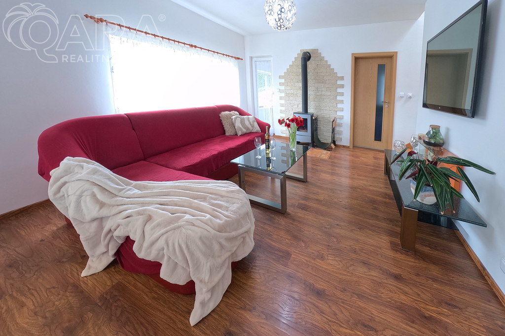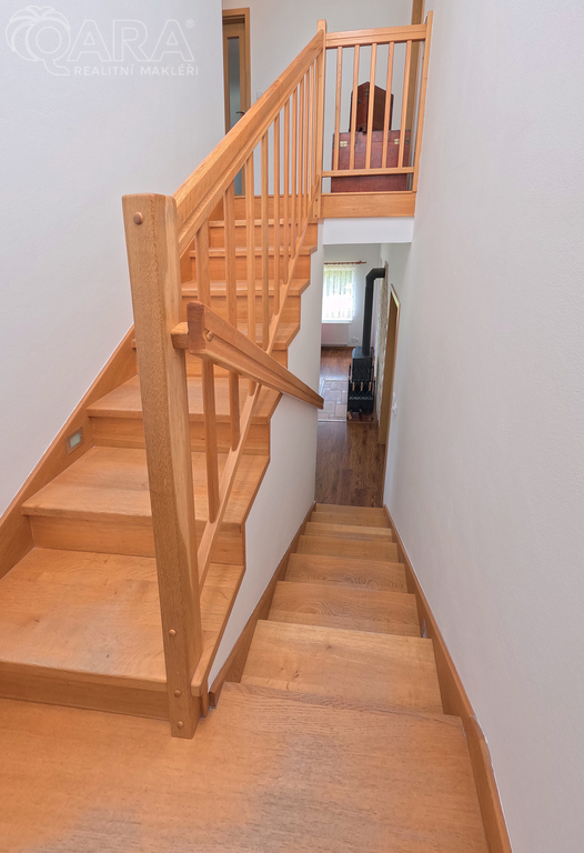 Srdcem domu je obývací pokoj s krbovými kamny a jídelna prosvětlená velkými okny. Na ni navazuje kuchyně se spíží. Dále tu naleznete pracovnu a koupelnu se sprchou.