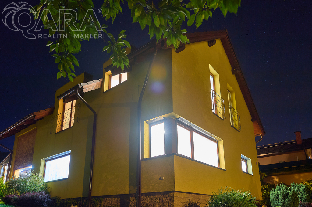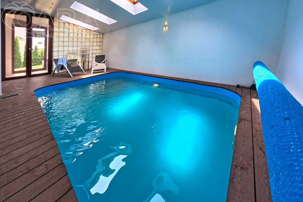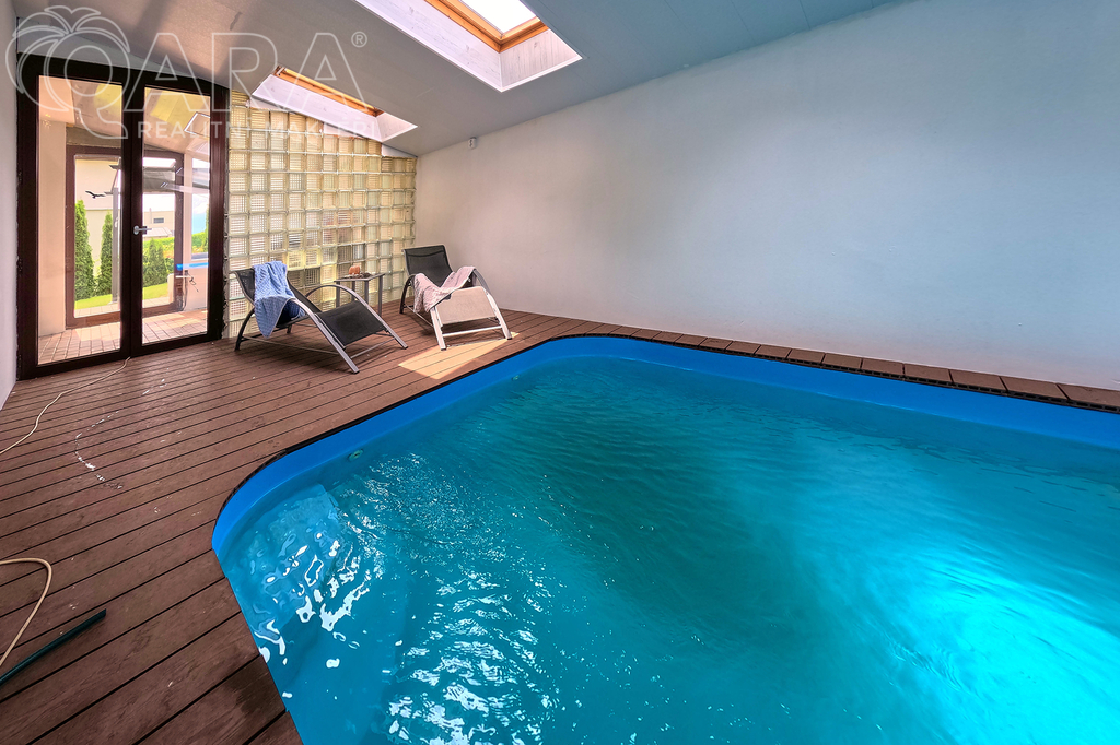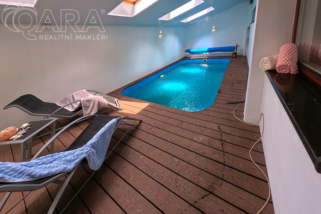 Patrový dům s dispozicí 5+kk, garáží, dvěma koupelnami, šatnou, a především s krytým bazénem, leží na pozemku o velikosti 1060 m2 a nabízí komfort 234 m2 celkové užitné plochy - 215 m2 užitné plochy + 19 m2 garáž.