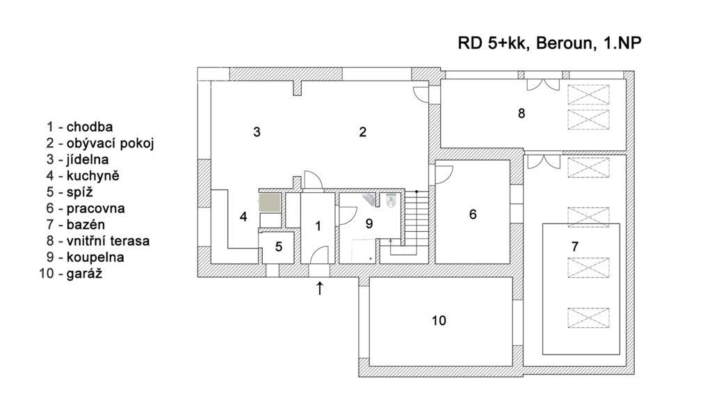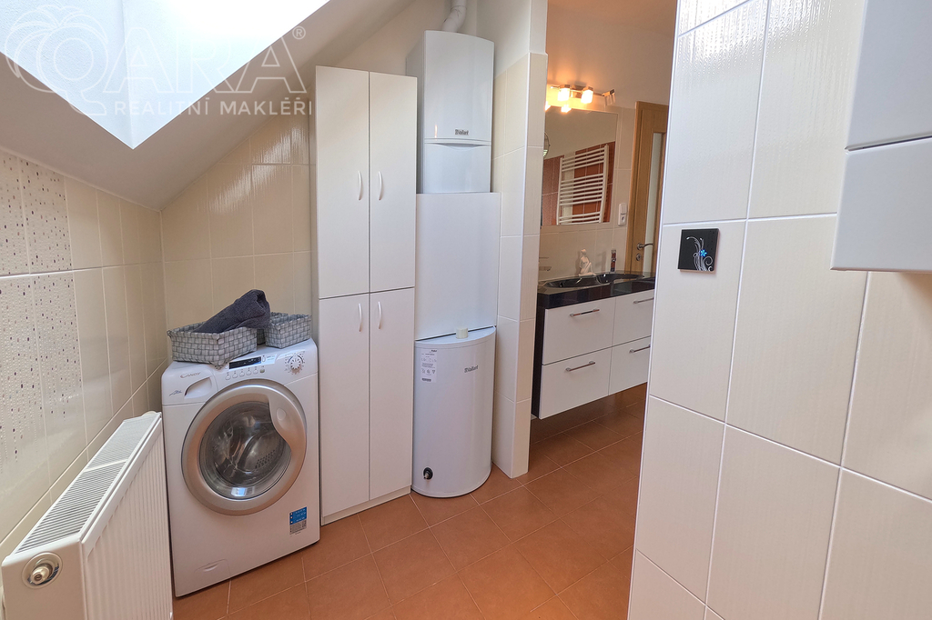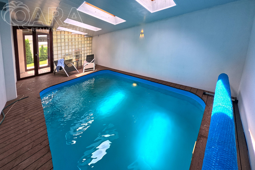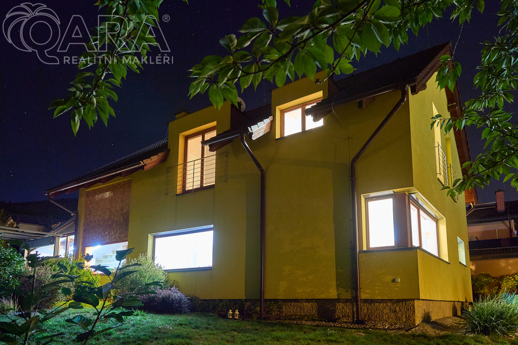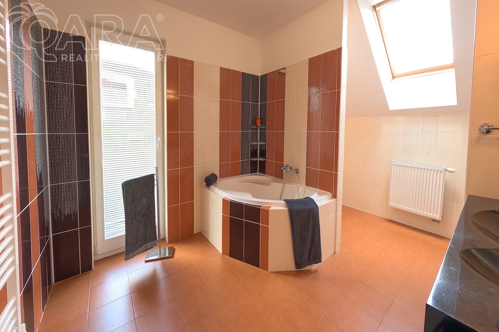Patrový dům s dispozicí 5+kk, garáží, dvěma koupelnami, šatnou, a především s krytým bazénem, leží na pozemku o velikosti 1060 m2 a nabízí komfort 234 m2 celkové užitné plochy - 215 m2 užitné plochy + 19 m2 garáž.