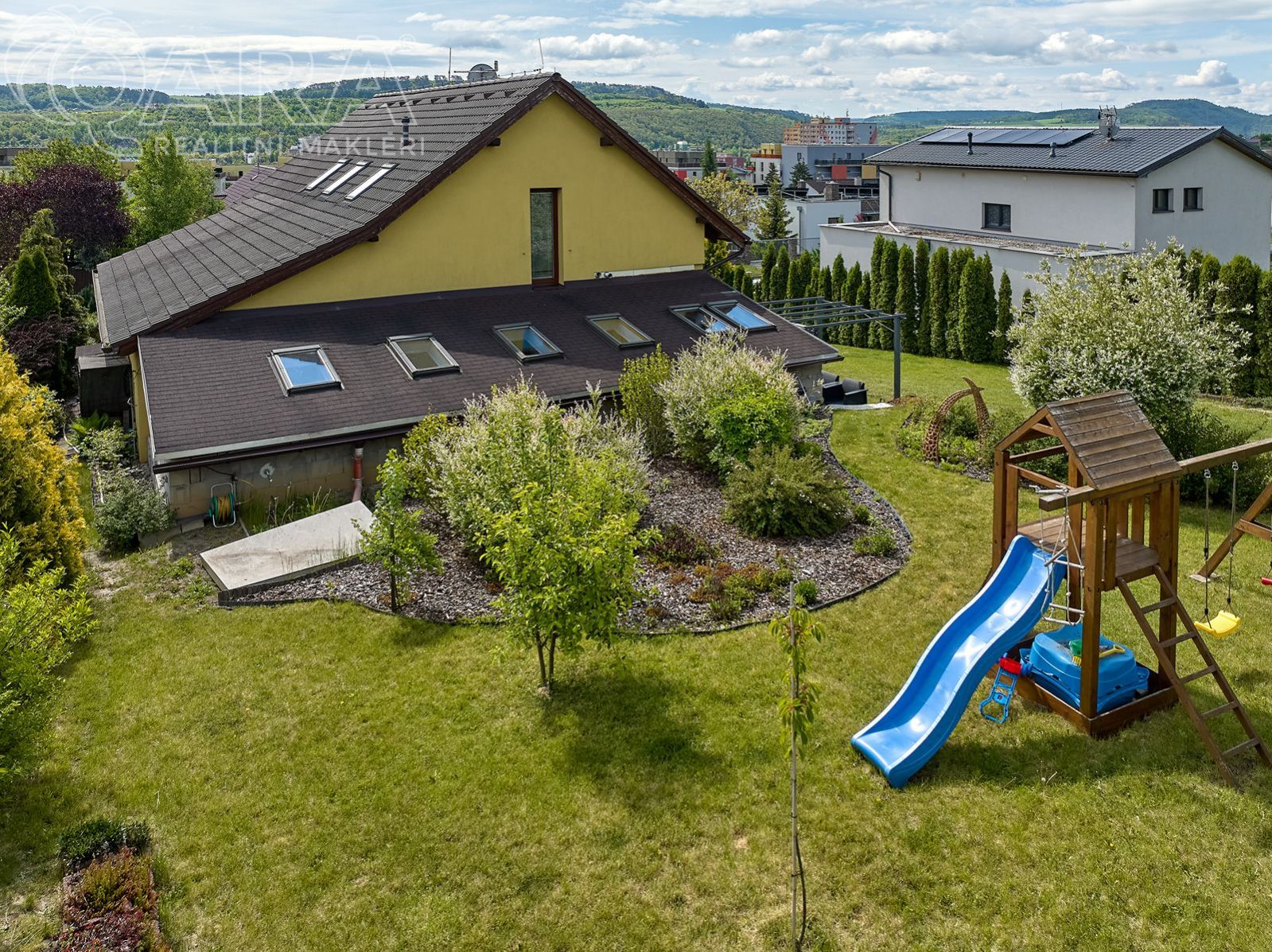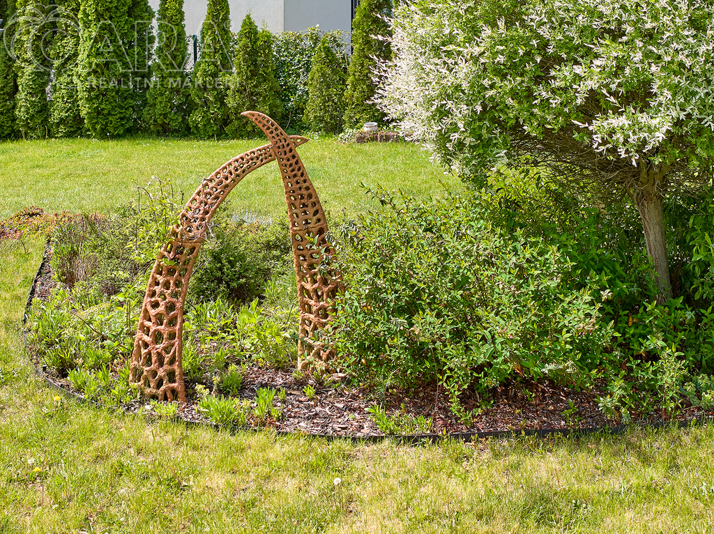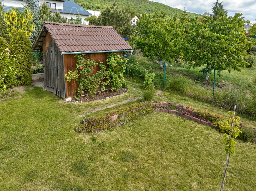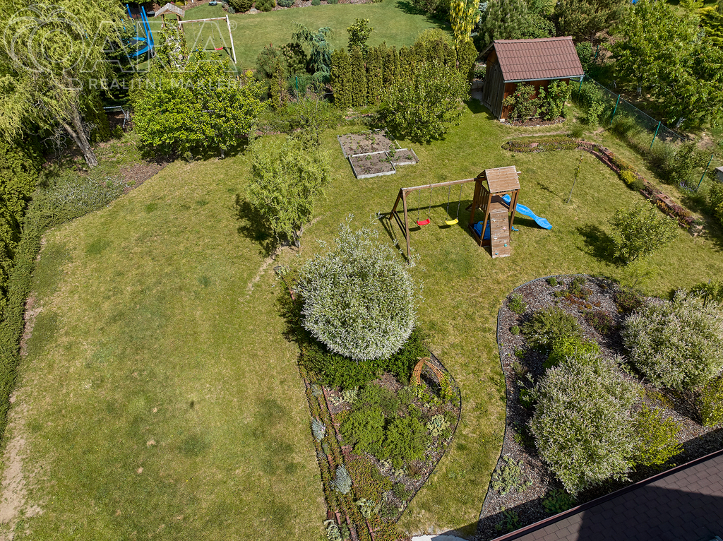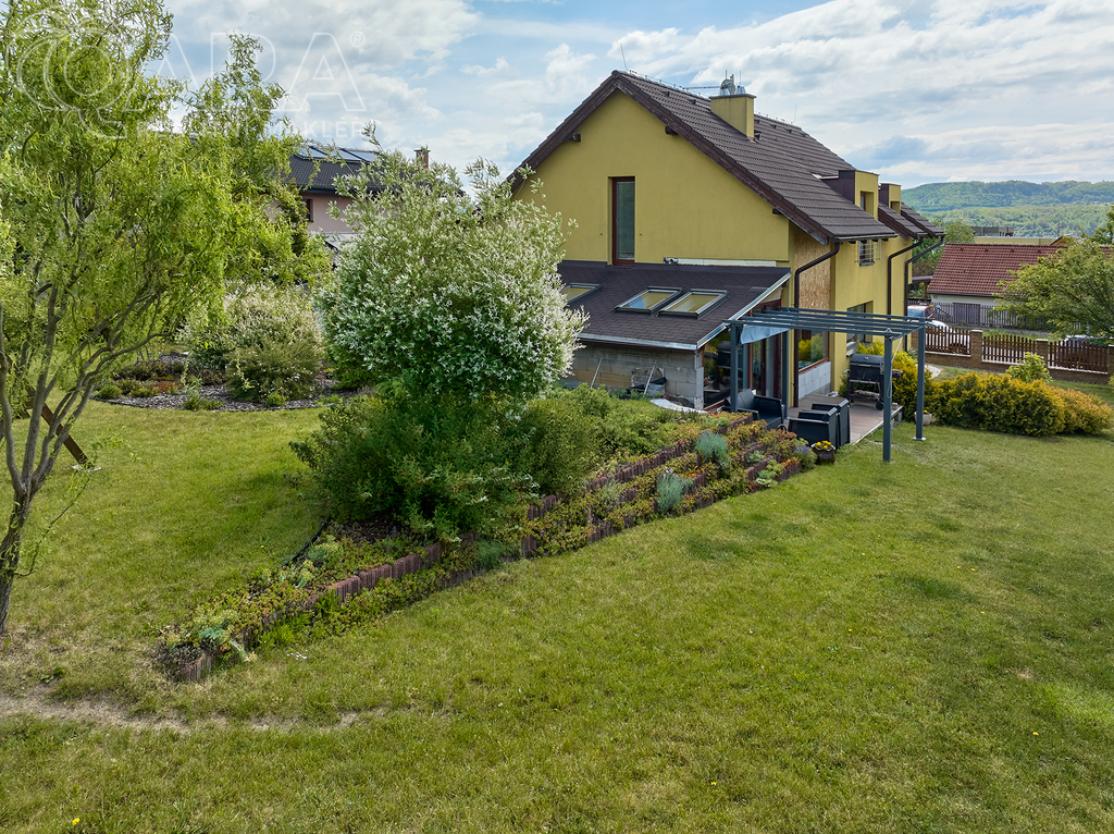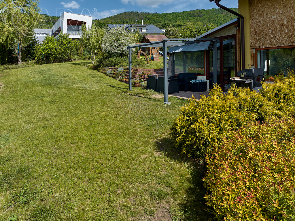 Rozhodně vás zaujme nádherná okrasná zahrada, která je tvořena zákoutími a různými ostrůvky keřů, stromků a květin. Je tu několik malých záhonků s jahodami a ovocnými stromy, a velkým bonusem je automatický závlahový systém.