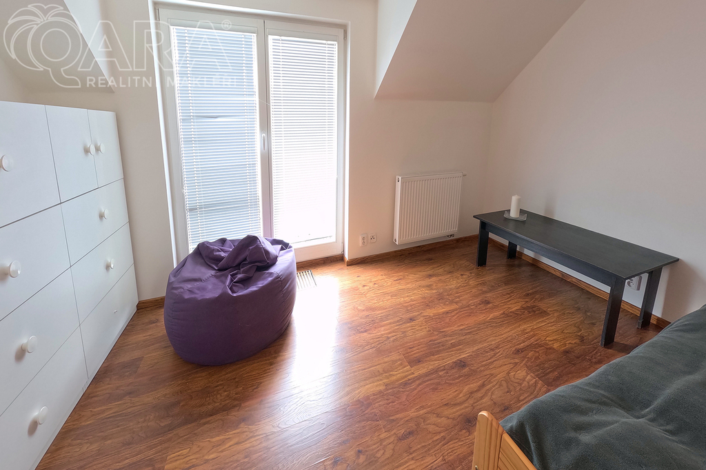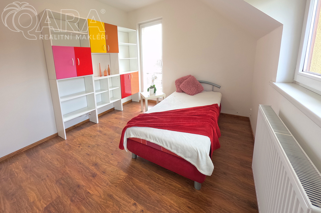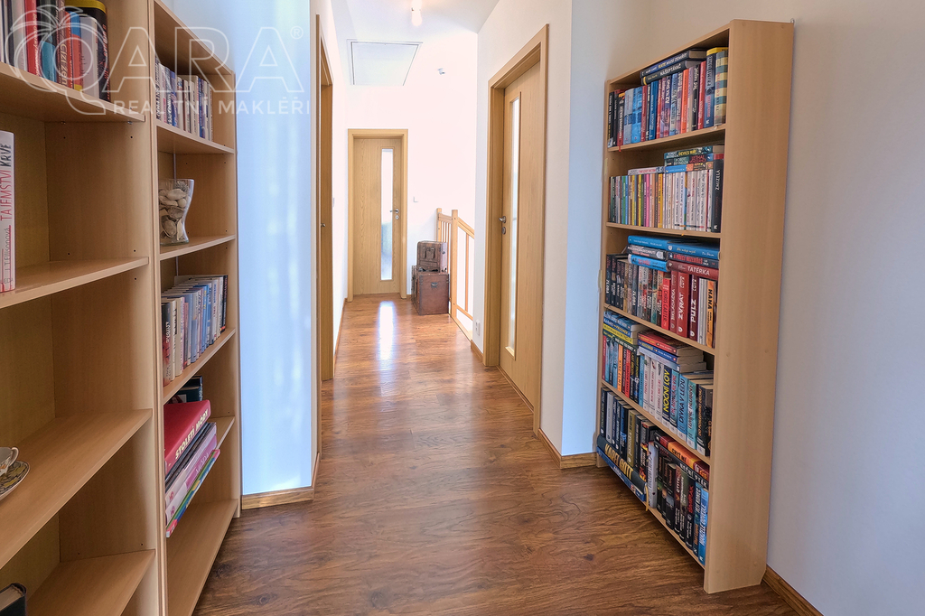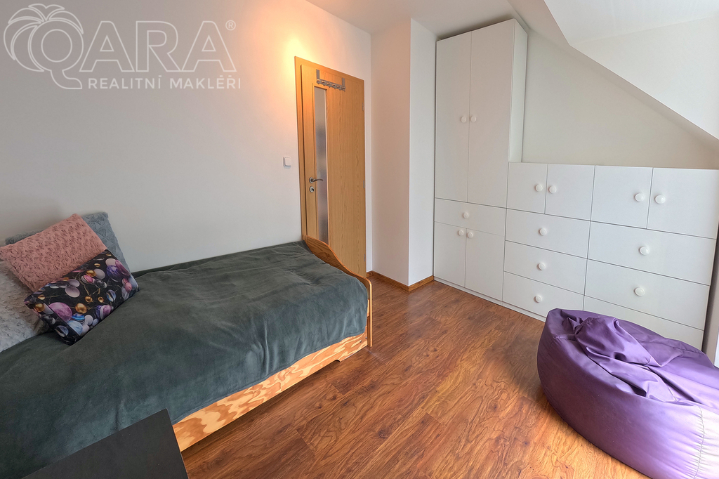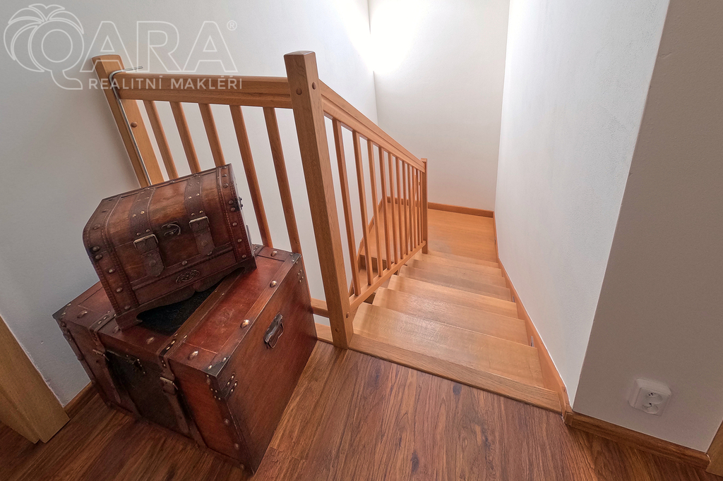 Do prvního patra se vstupuje schodištěm z obývacího pokoje a kromě ložnice, šatny a velké koupelny s vanou tu jsou další dva pokoje.