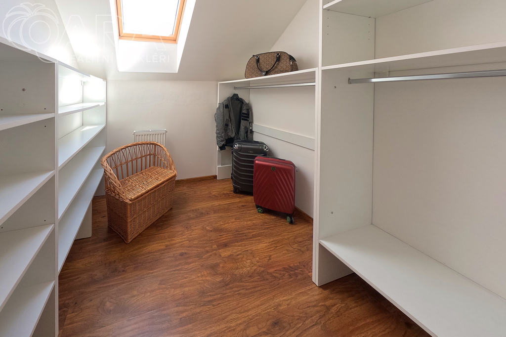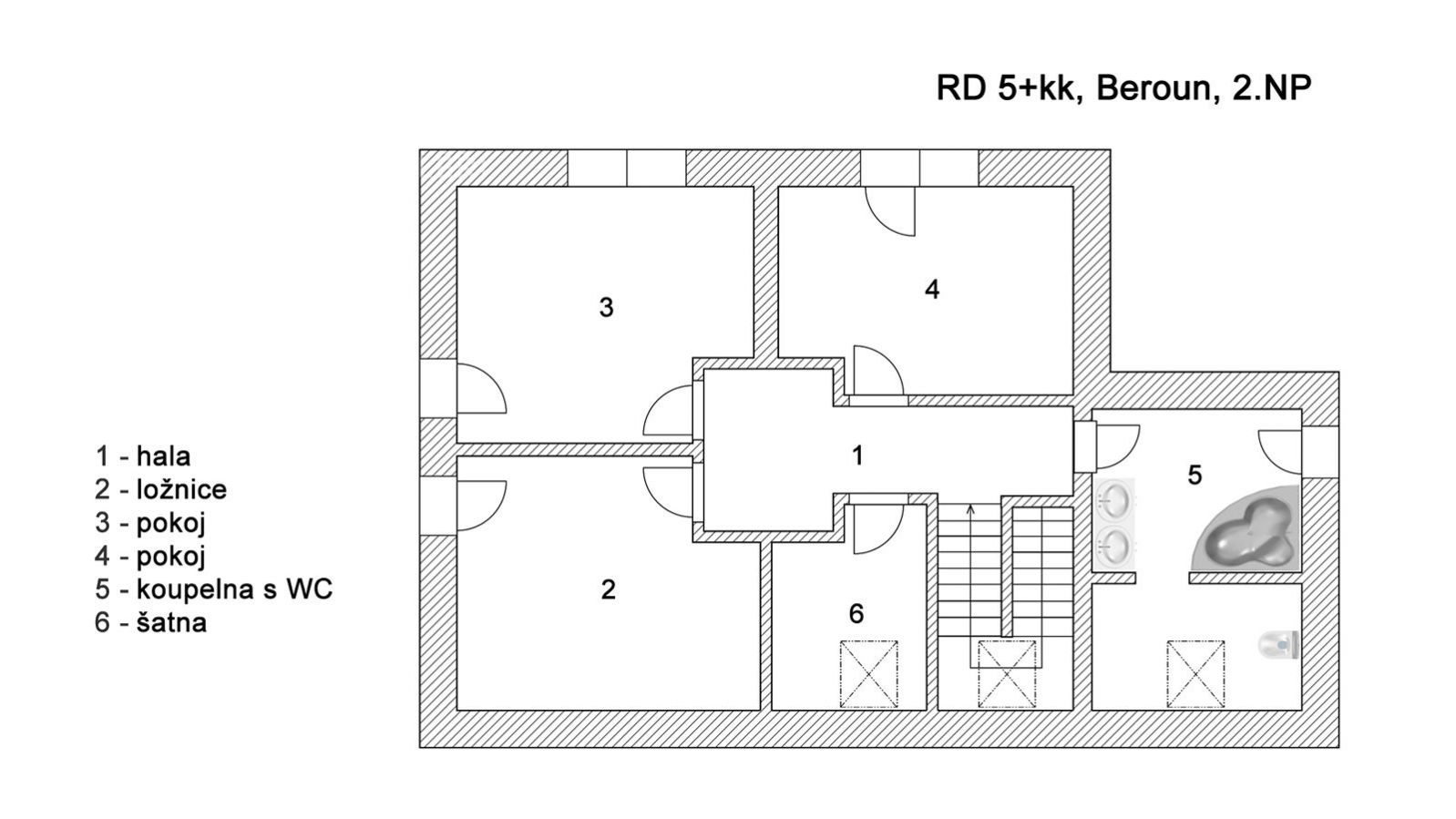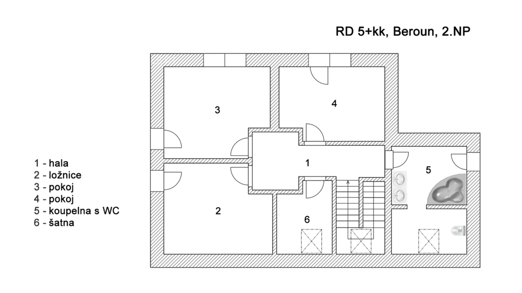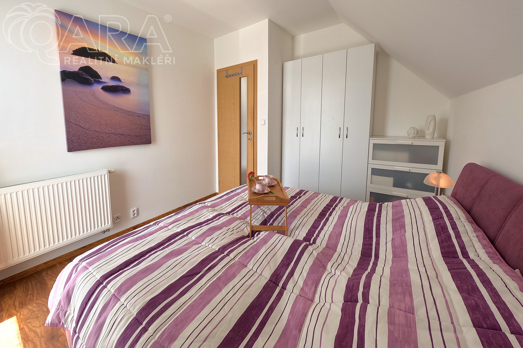 Do prvního patra se vstupuje schodištěm z obývacího pokoje a kromě ložnice, šatny a velké koupelny s vanou tu jsou další dva pokoje.