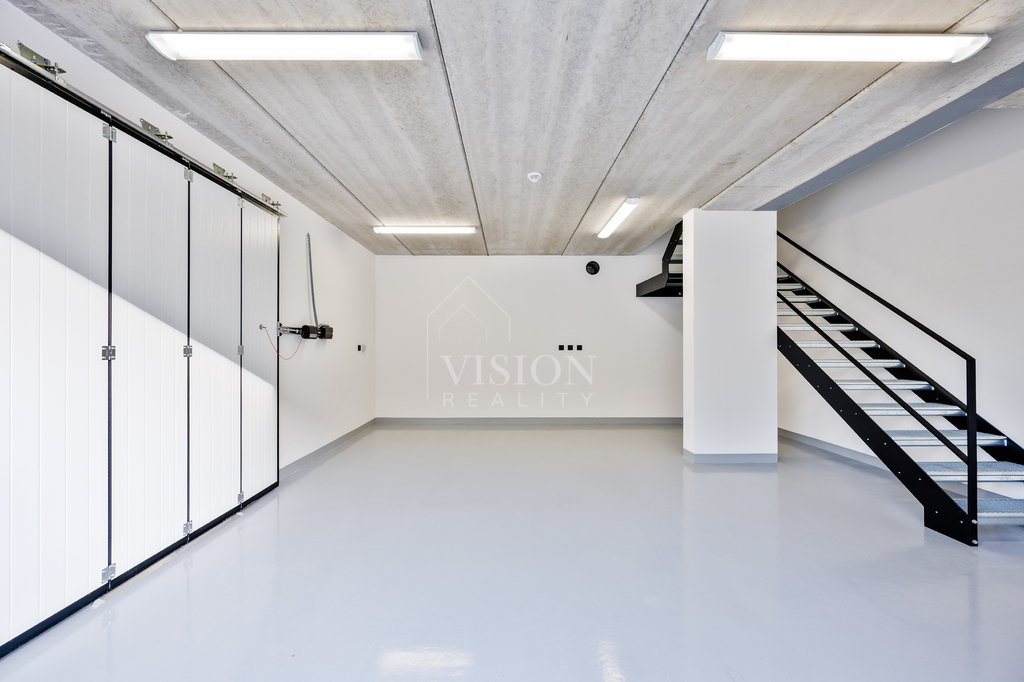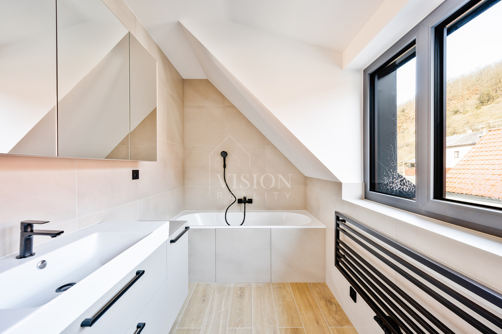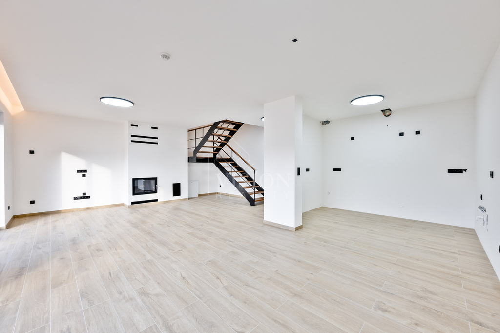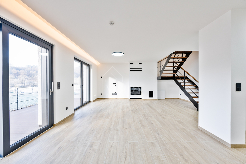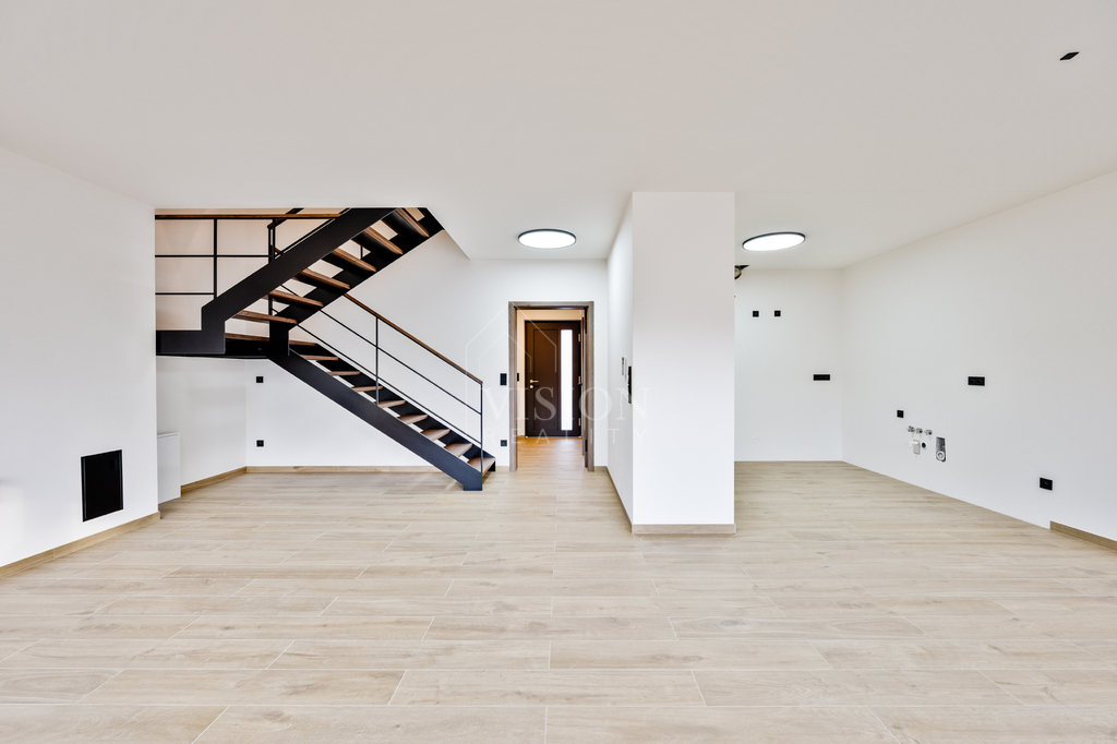 Výrazným designovým prvkem je vnitřní schodiště s ocelovou konstrukcí v černém provedení, doplněné masivními dubovými stupni a madlem zábradlí, které působí elegantně a nadčasově.