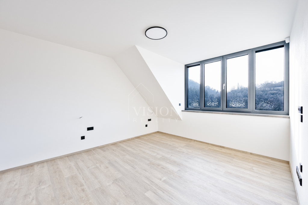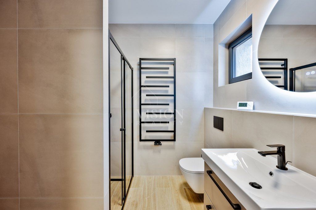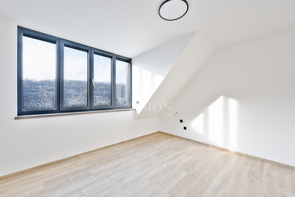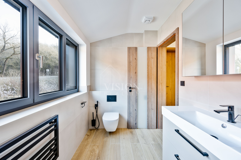 Podlahy v ložnicích jsou řešeny kvalitním vinylem, koupelny jsou obloženy velkoformátovým keramickým obkladem a vybaveny designovými bateriemi značky Hansgrohe. Vnitřní parapety z masivního dřeva s mořením podtrhují celkový standard interiéru.
