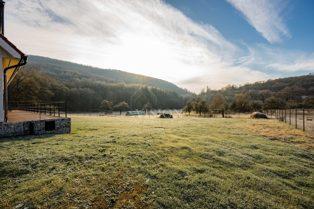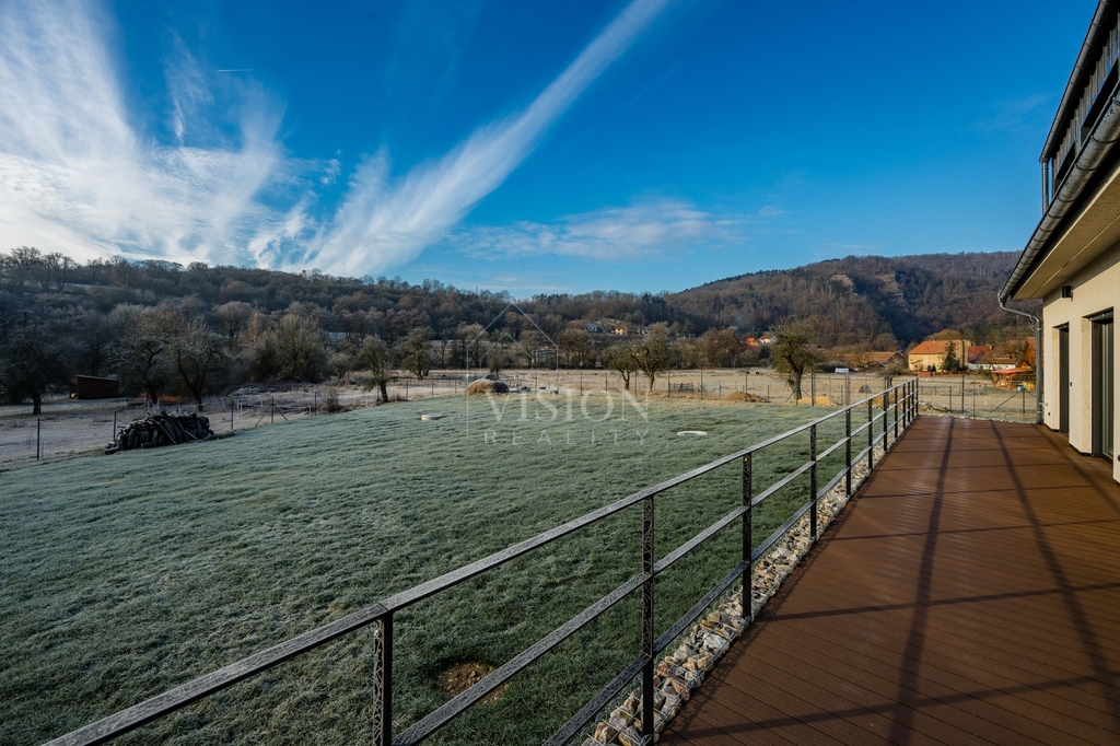 Terasa je provedena z WPC terasových prken a doplněna o ocelové žárově zinkované zábradlí s kamenným gabionem z nedalekého lomu, což vytváří příjemné místo pro relaxaci a posezení s rodinou či přáteli. Celková plocha pozemku poskytuje dostatek prostoru pro zahradu, odpočinek i další využití dle vlastních představ.