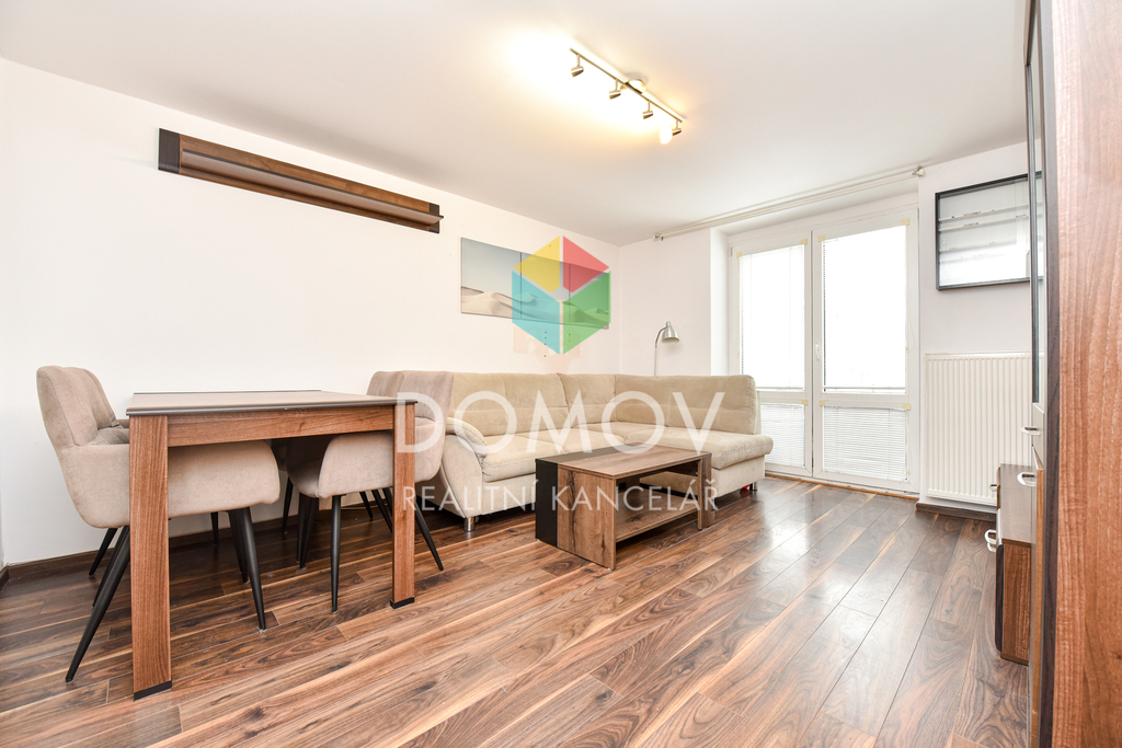 - obývací pokoj s rohovou sedací soupravou do tvaru L, obývací stěnou, jídelním stolem se židlemi a přímým vstupem na menší balkon