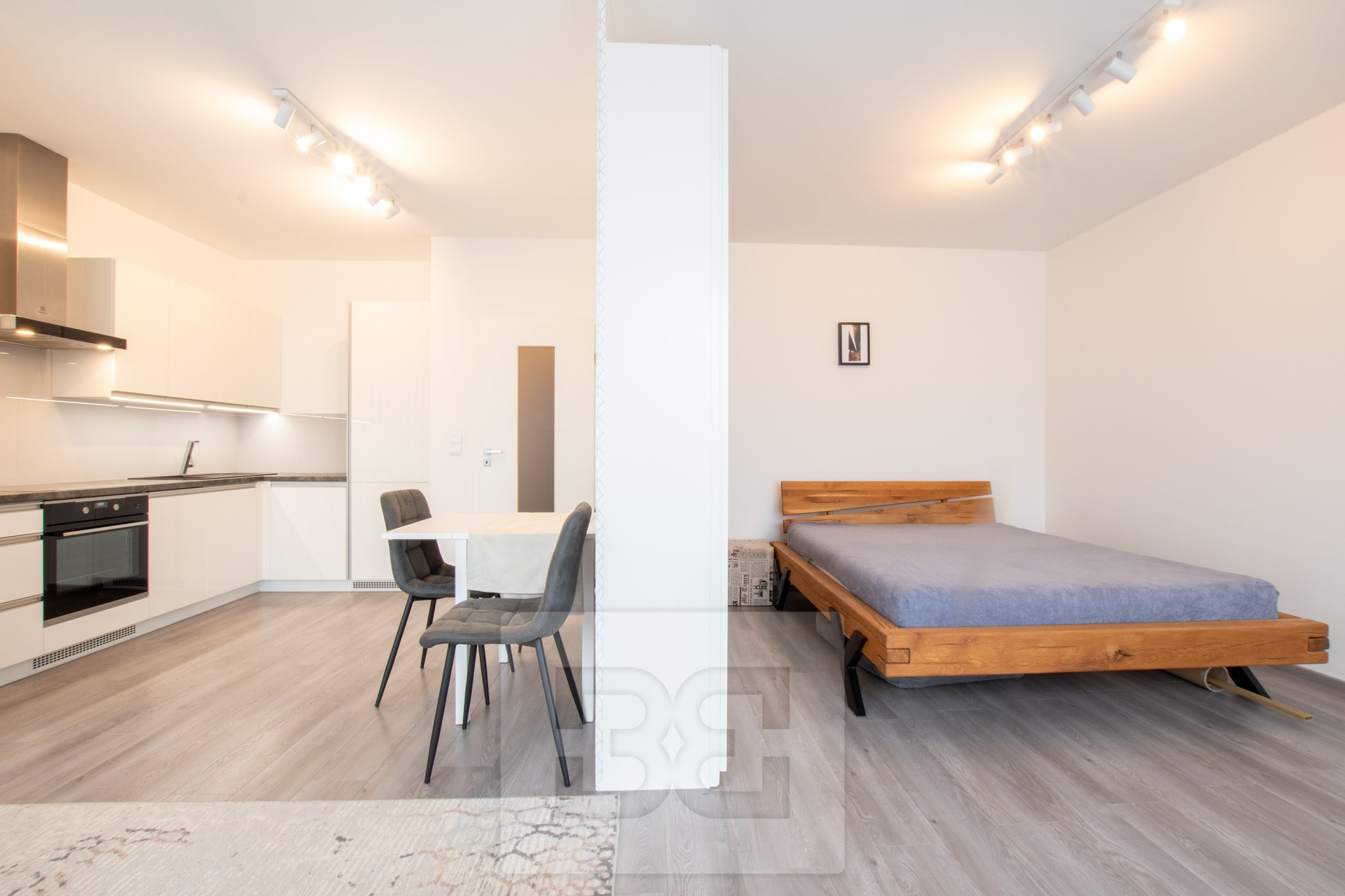 Nabízíme k pronájmu krásný, moderně zařízený byt 1+kk o velikosti 44 m², který se nachází ve 2. nadzemním podlaží novostavby. Byt je světlý, vzdušný a připravený k okamžnému nastěhování. Součástí je moderní kuchyňská linka vybavená spotřebiči – lednicí s mrazákem, indukční varnou deskou, troubou, digestoří a myčkou. Obývací část je zařízena pohovkou a praktickou vestavěnou skříní, která chytře odděluje spací zónu s manželskou postelí. V předsíni bytu je další vestavěná skříň poskytující dostatek úložného prostoru. Koupelna je vybavena vanou a toaletou. Komfort bydlení zvyšují také venkovní elektrické rolety. K bytu náleží vlastní parkovací stání přímo před domem.