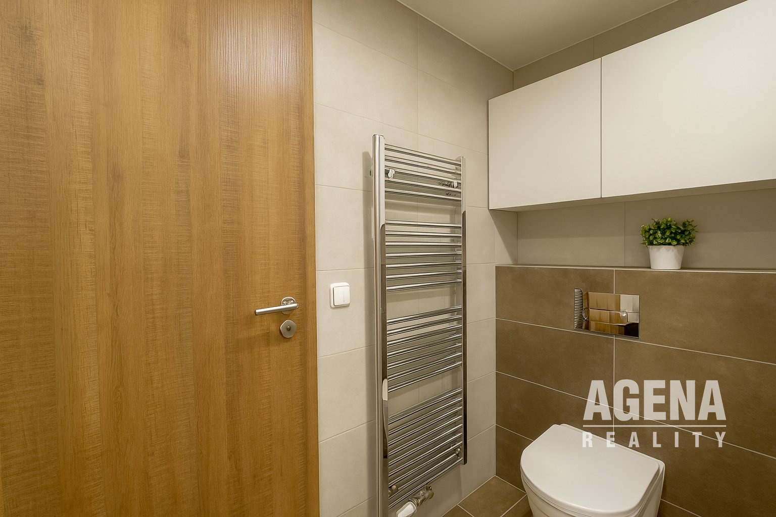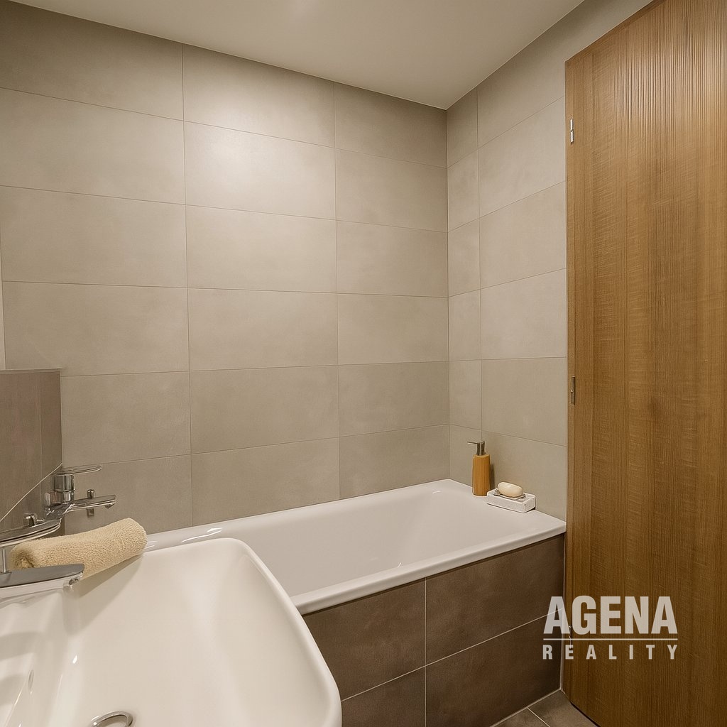 Z chodby se dostanete do koupelny, kde se nachází pračka Electrolux. V koupelně je vana, umyvadlo a toaleta (skříňka a zrcadlo). Chodba je vybavena vestavnou skříní na míru, která poskytuje další úložný prostor.